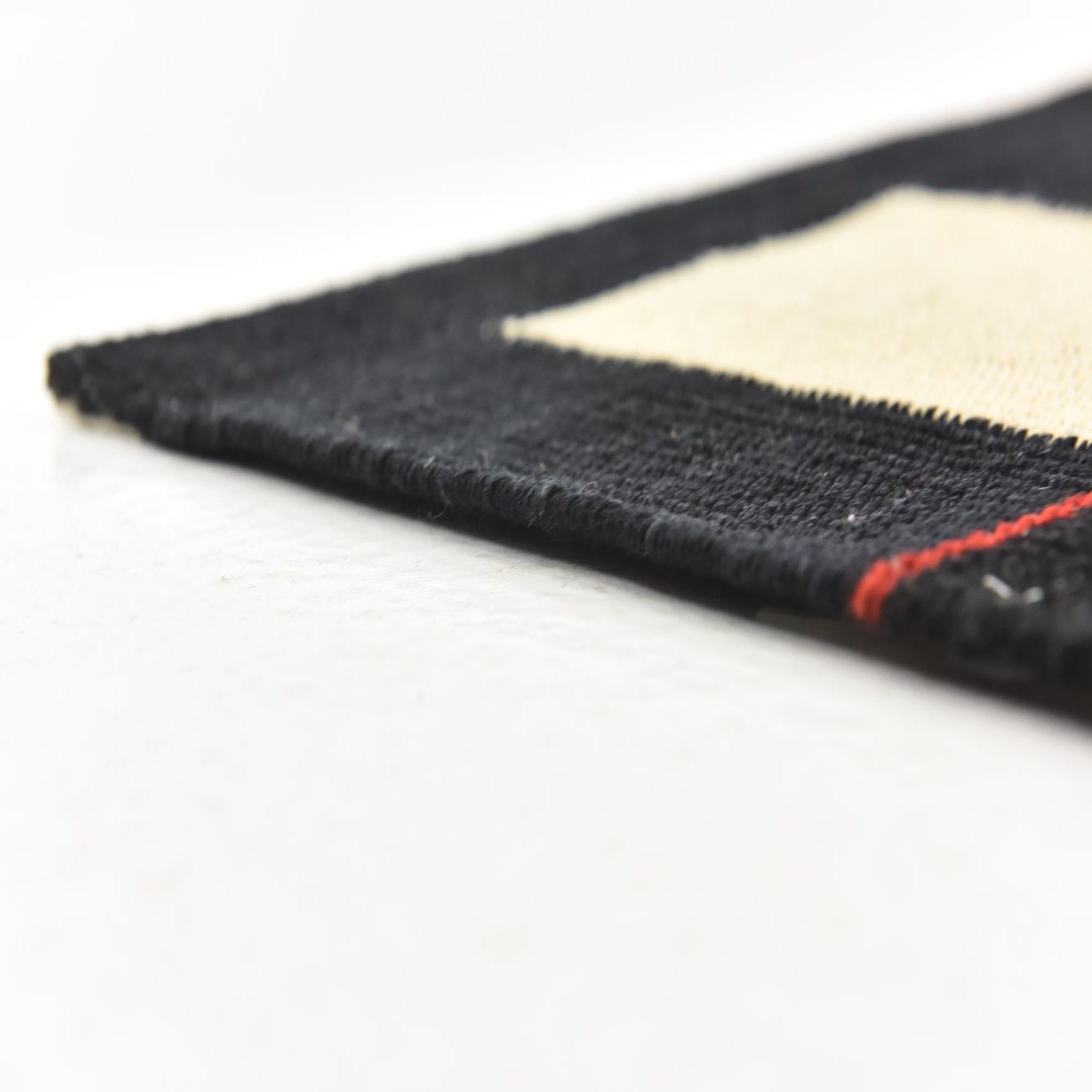 Primary color is Black. Colors in this rug include: Black, Cream, Red.