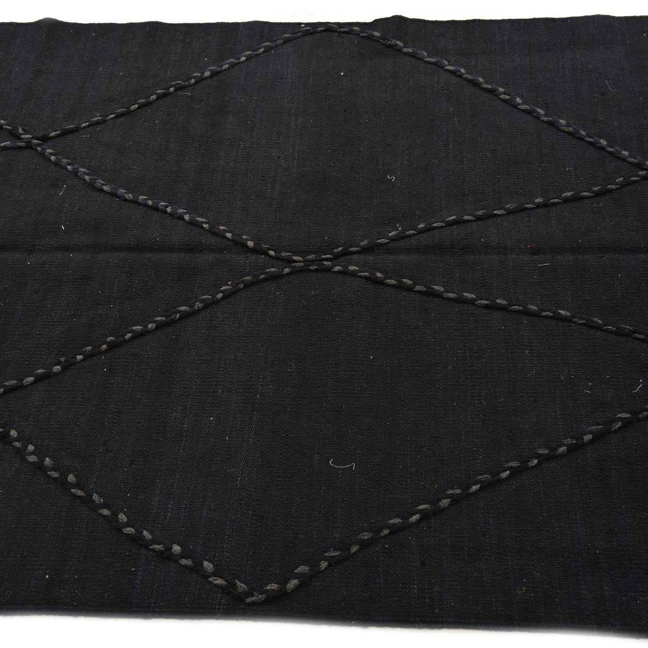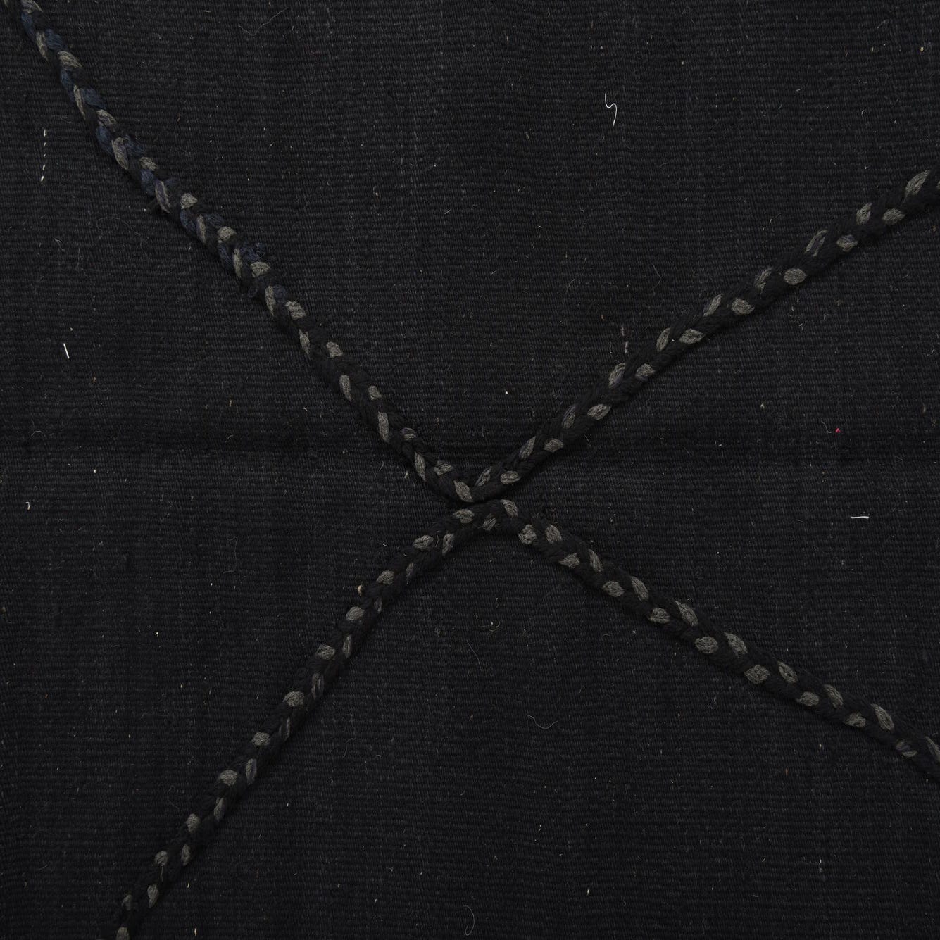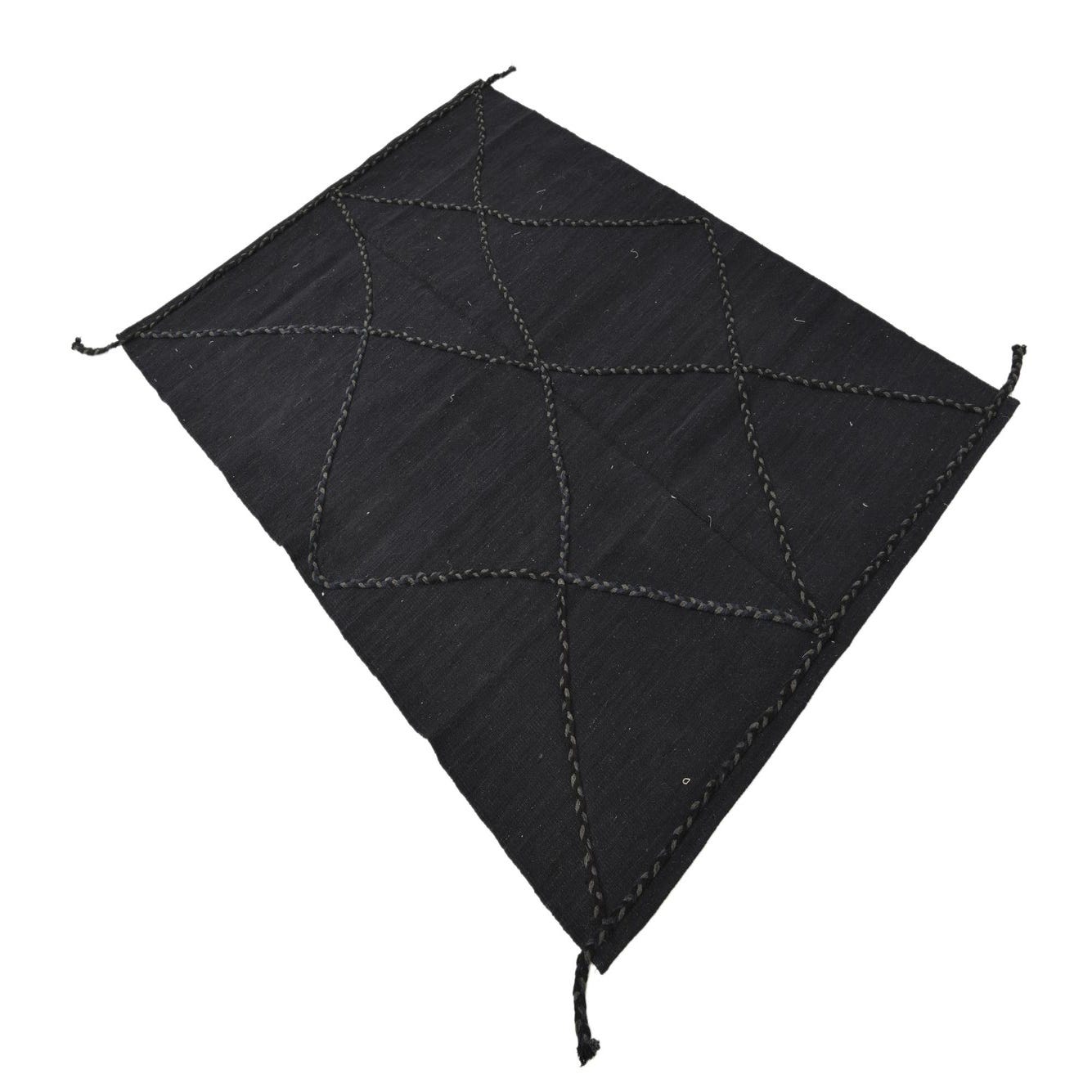 A 4x6 rectangular black flatweave rug with a subtle tribal diamond pattern created by textured dark gray stitching.