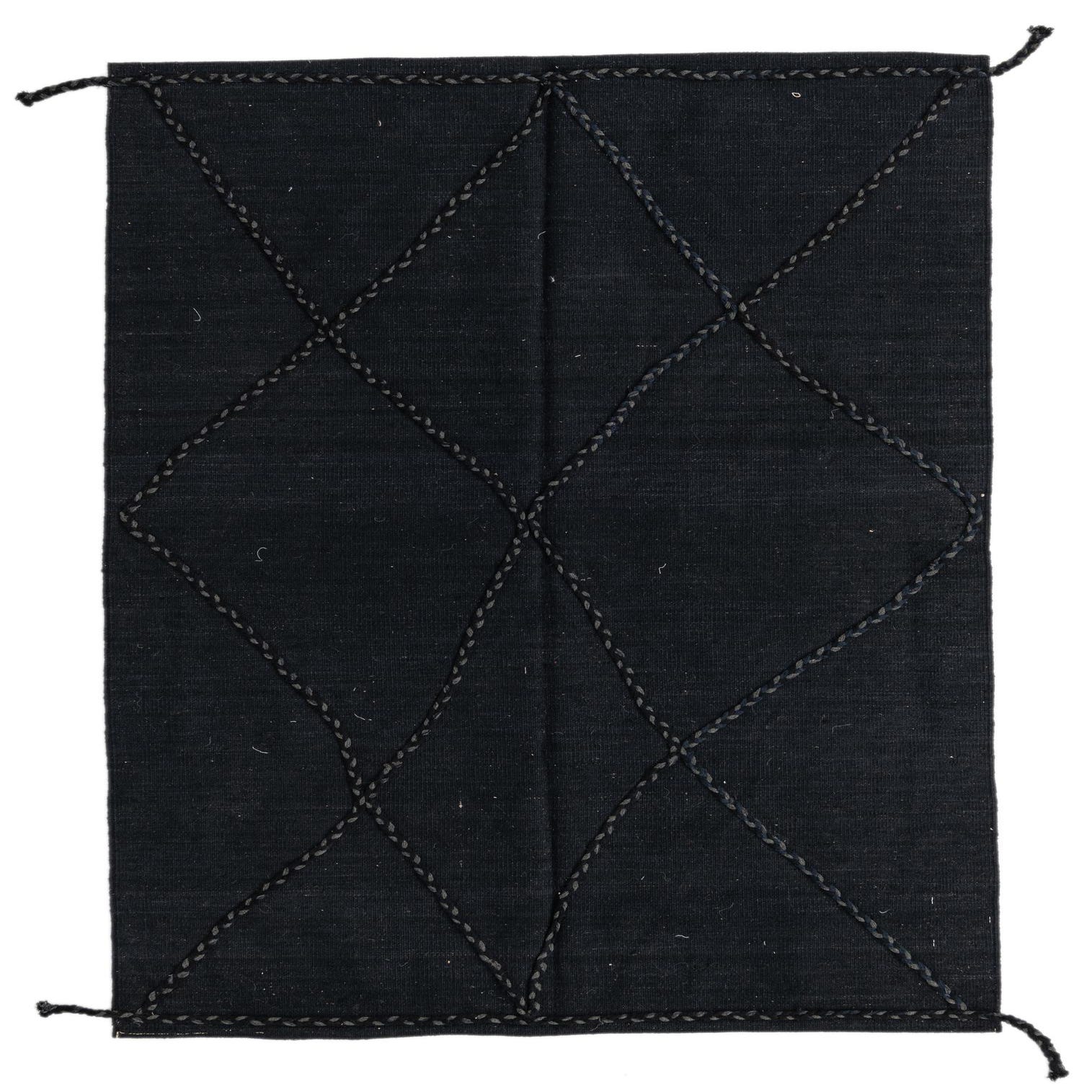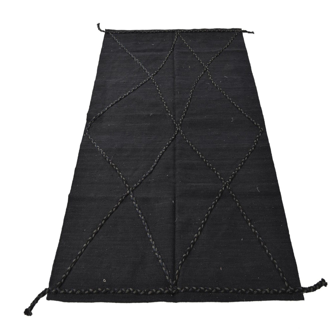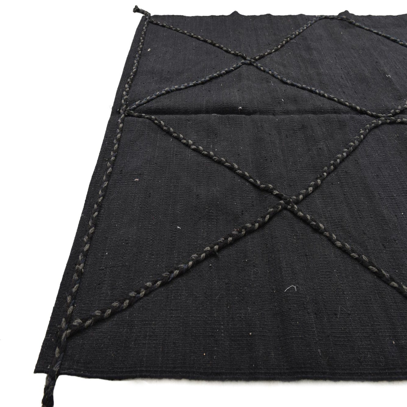 A 4x6 rectangular black flatweave rug with a subtle tribal diamond pattern created by textured dark gray stitching.
