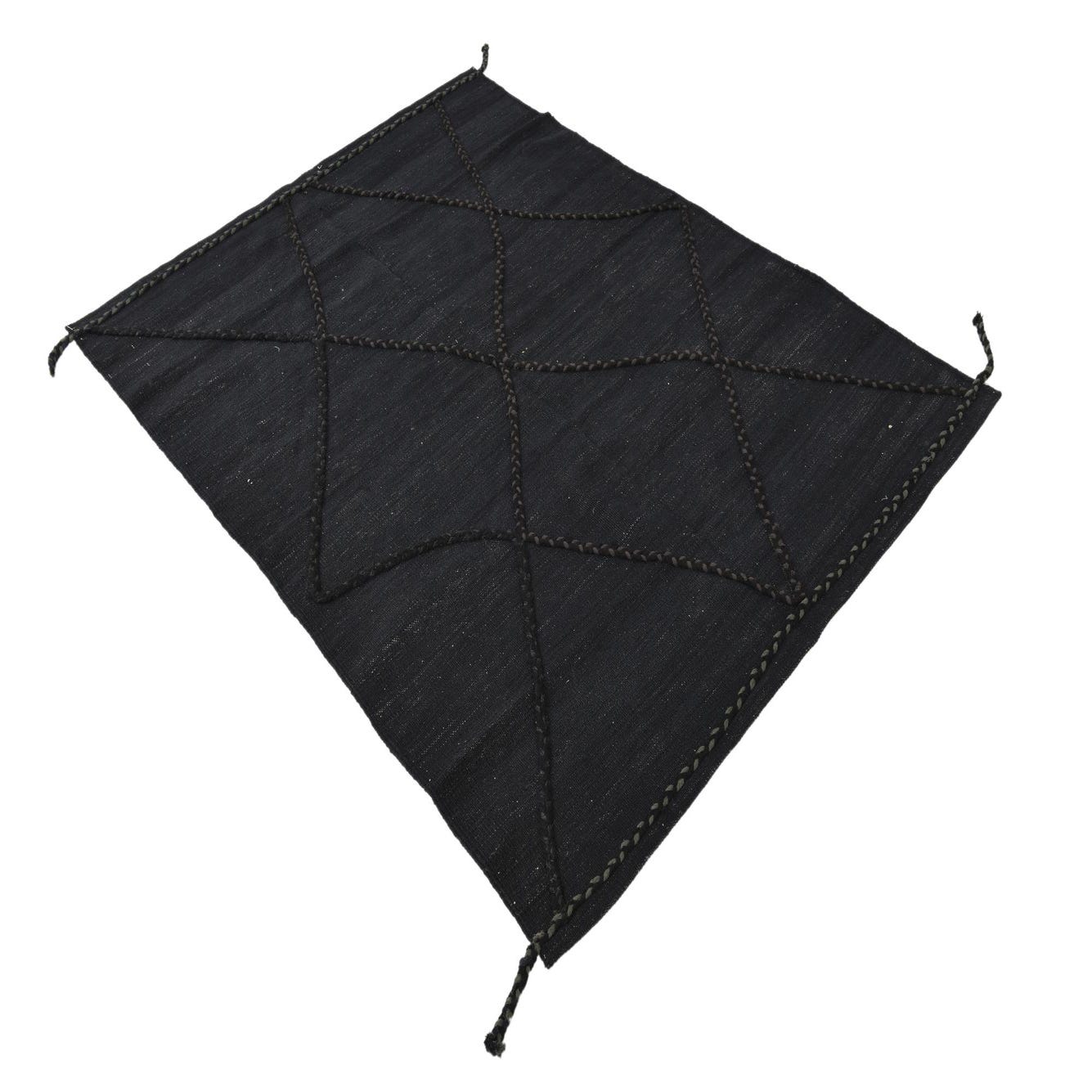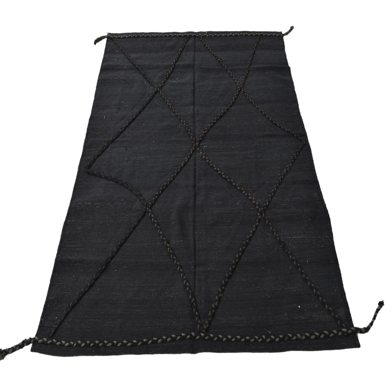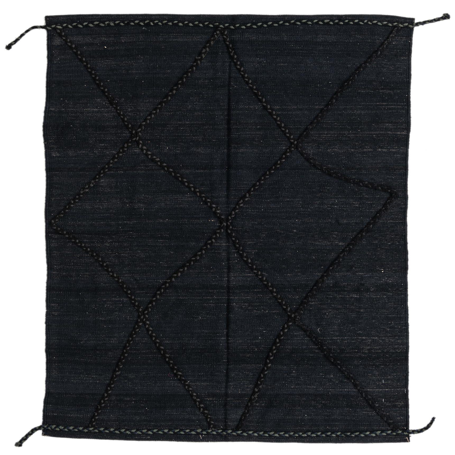 A 4x6 rectangular black wool flatweave rug with a subtle tribal diamond pattern created by textured braids.