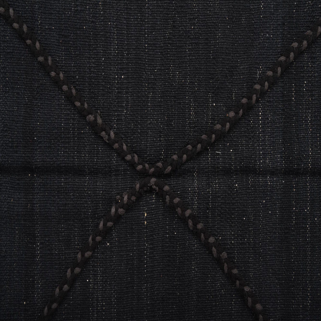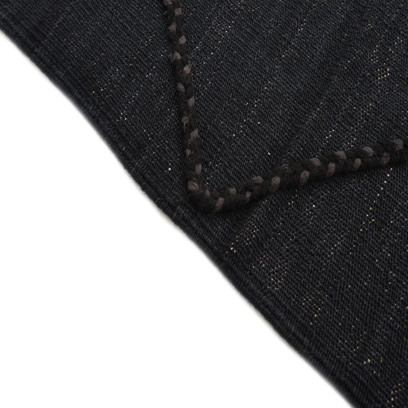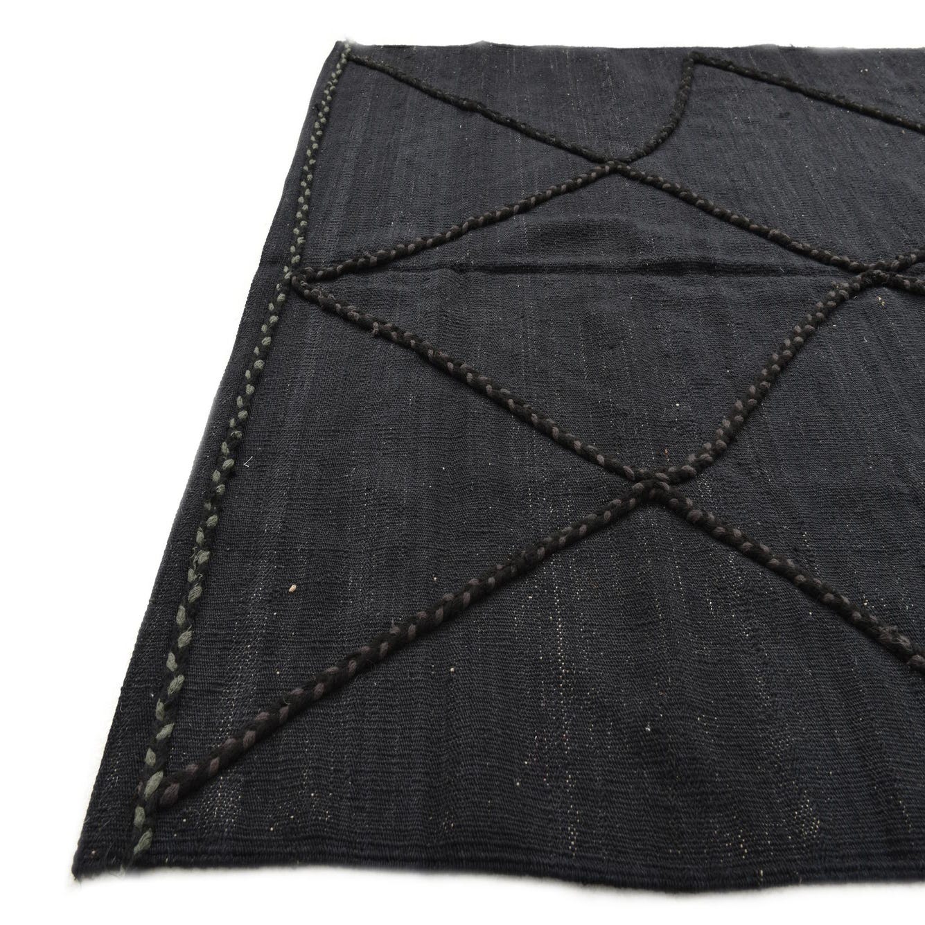 A 4x6 rectangular black wool flatweave rug with a subtle tribal diamond pattern created by textured braids.