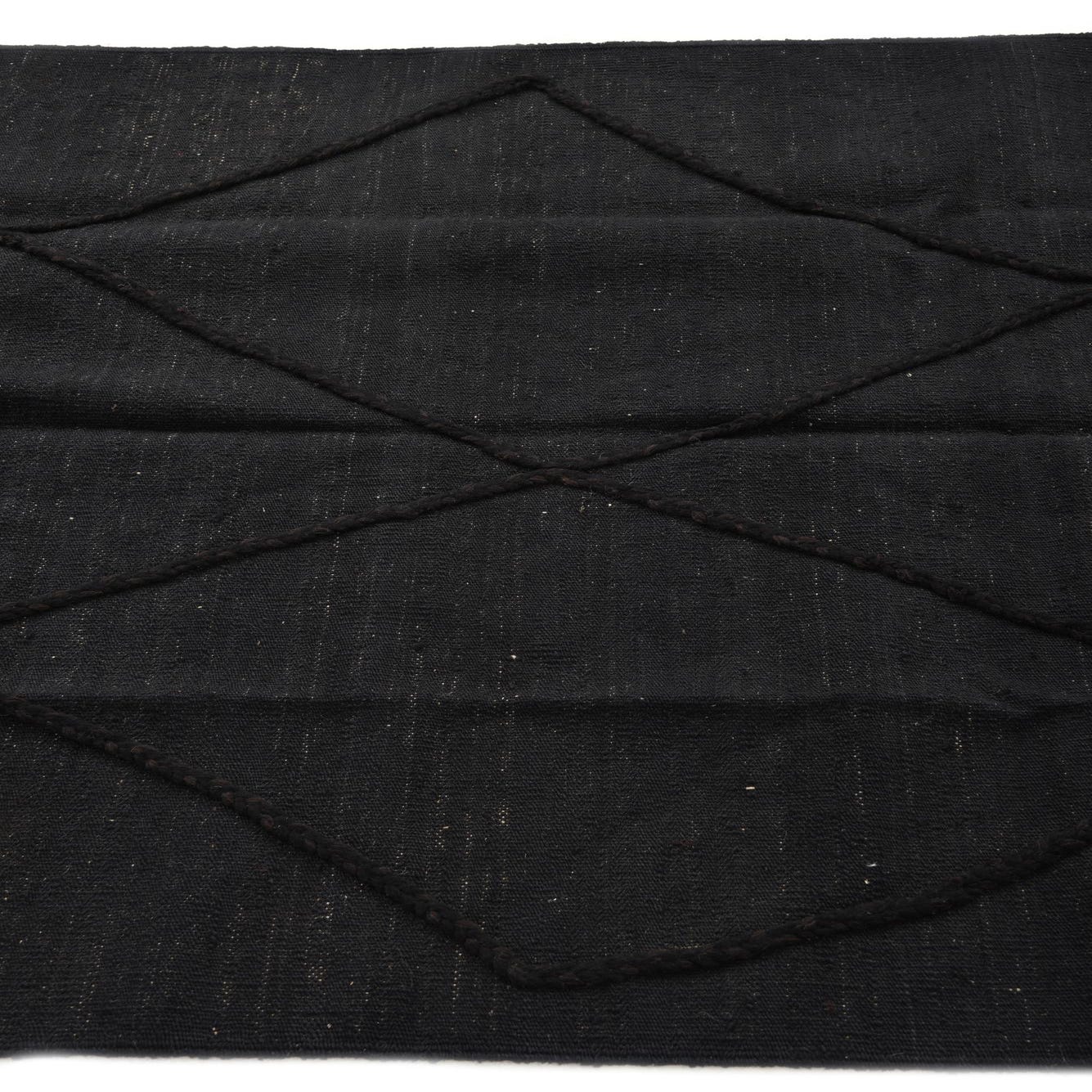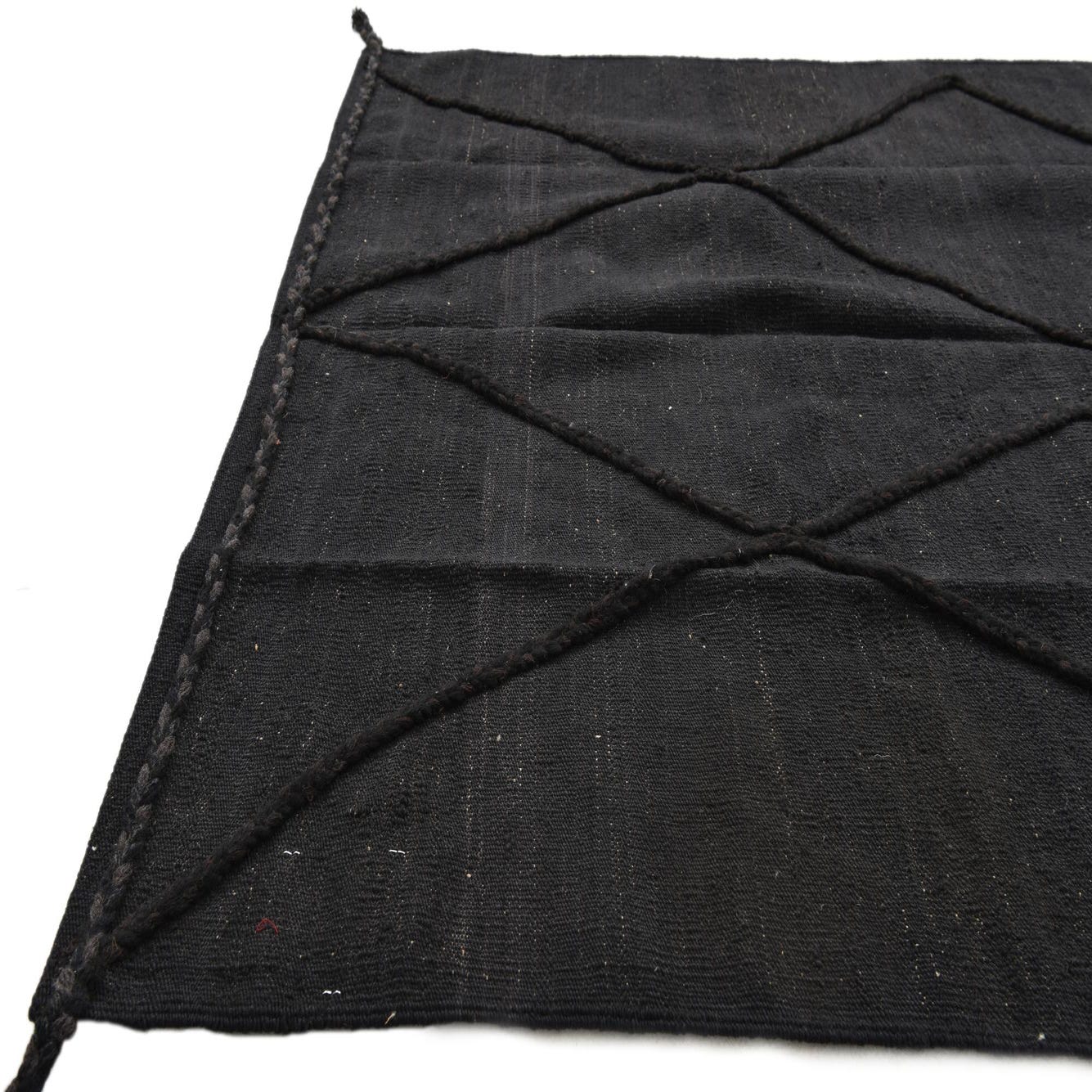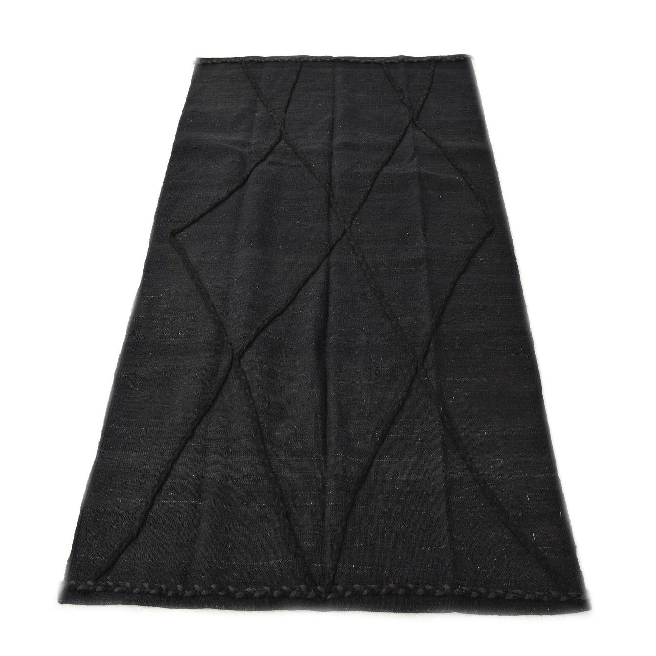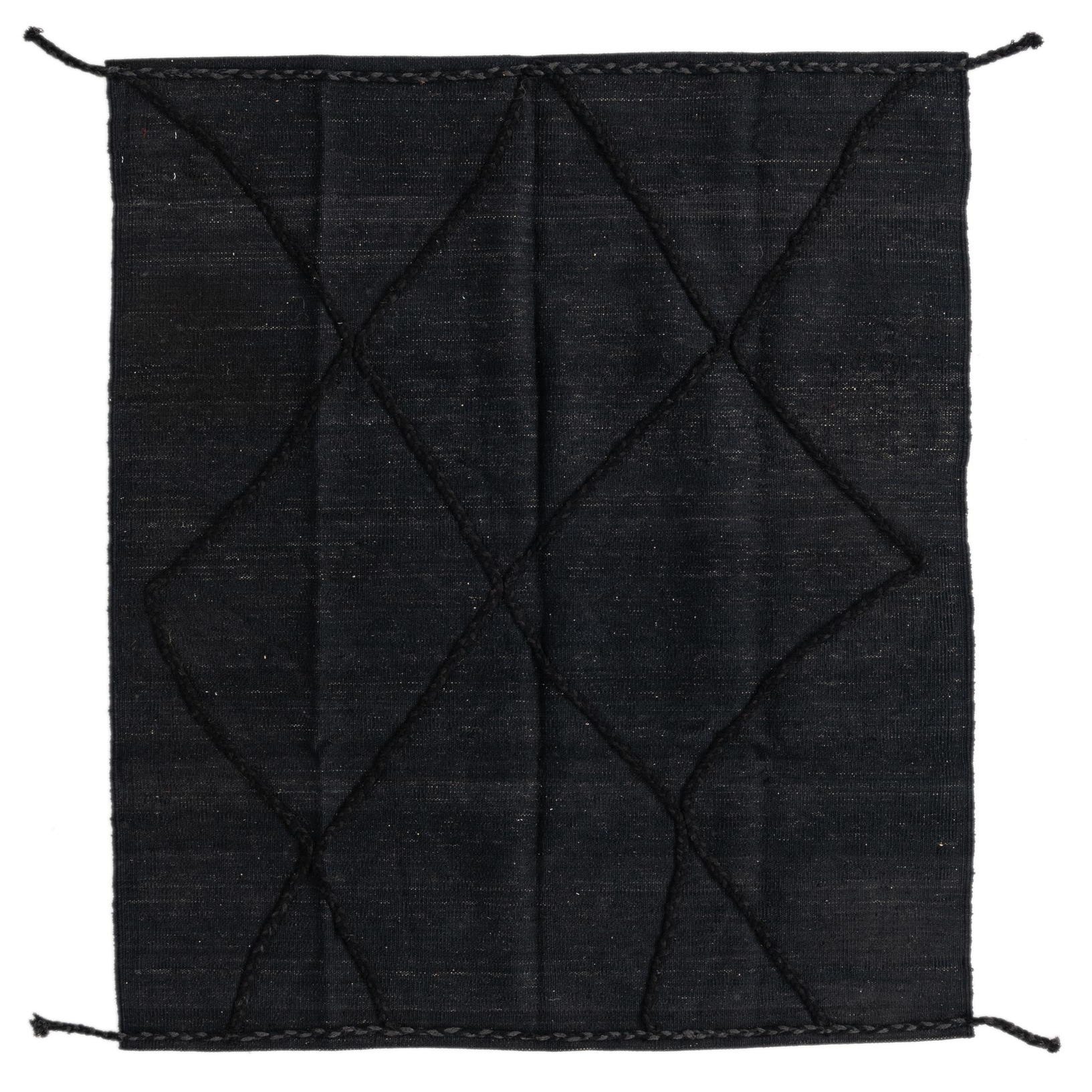 A 4x6 rectangular black wool flatweave rug with a subtle tribal diamond pattern, ideal for a modern living room.