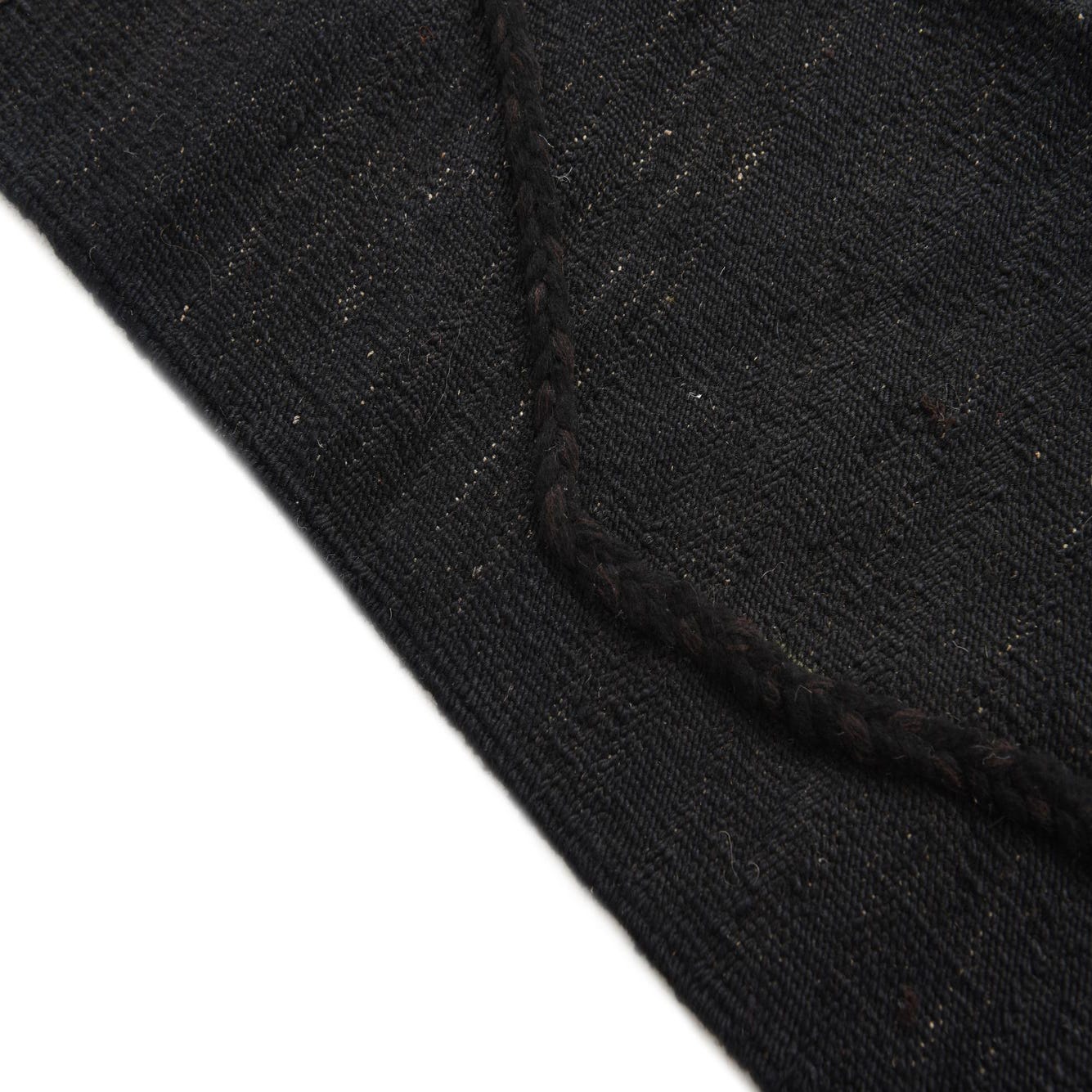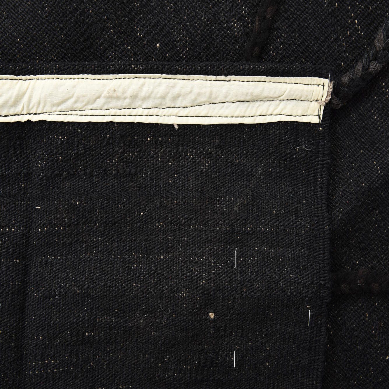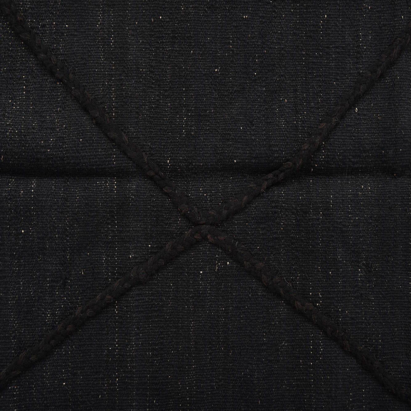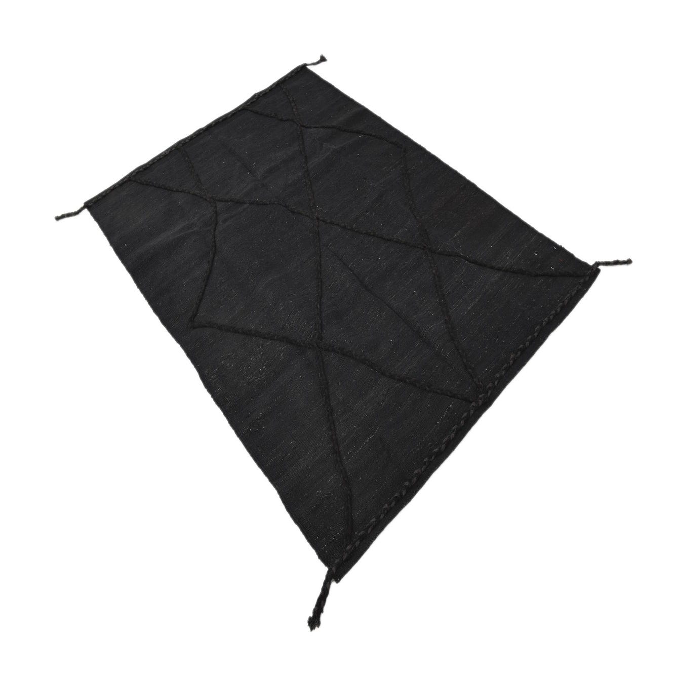 A 4x6 rectangular black wool flatweave rug with a subtle tribal diamond pattern, ideal for a modern living room.