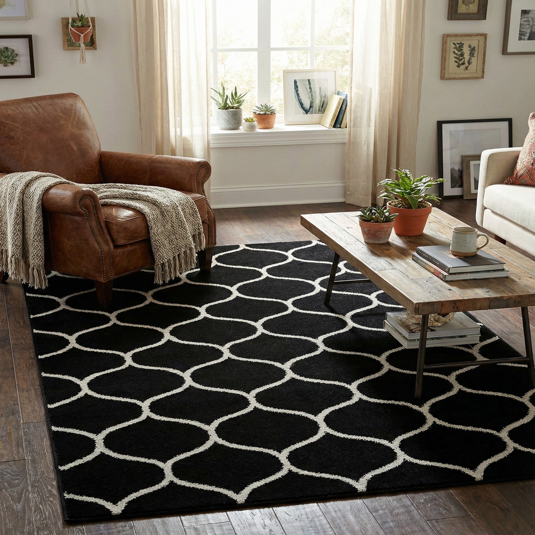 A 4x6 black rectangular rug with a modern white trellis pattern, suitable for a living room.