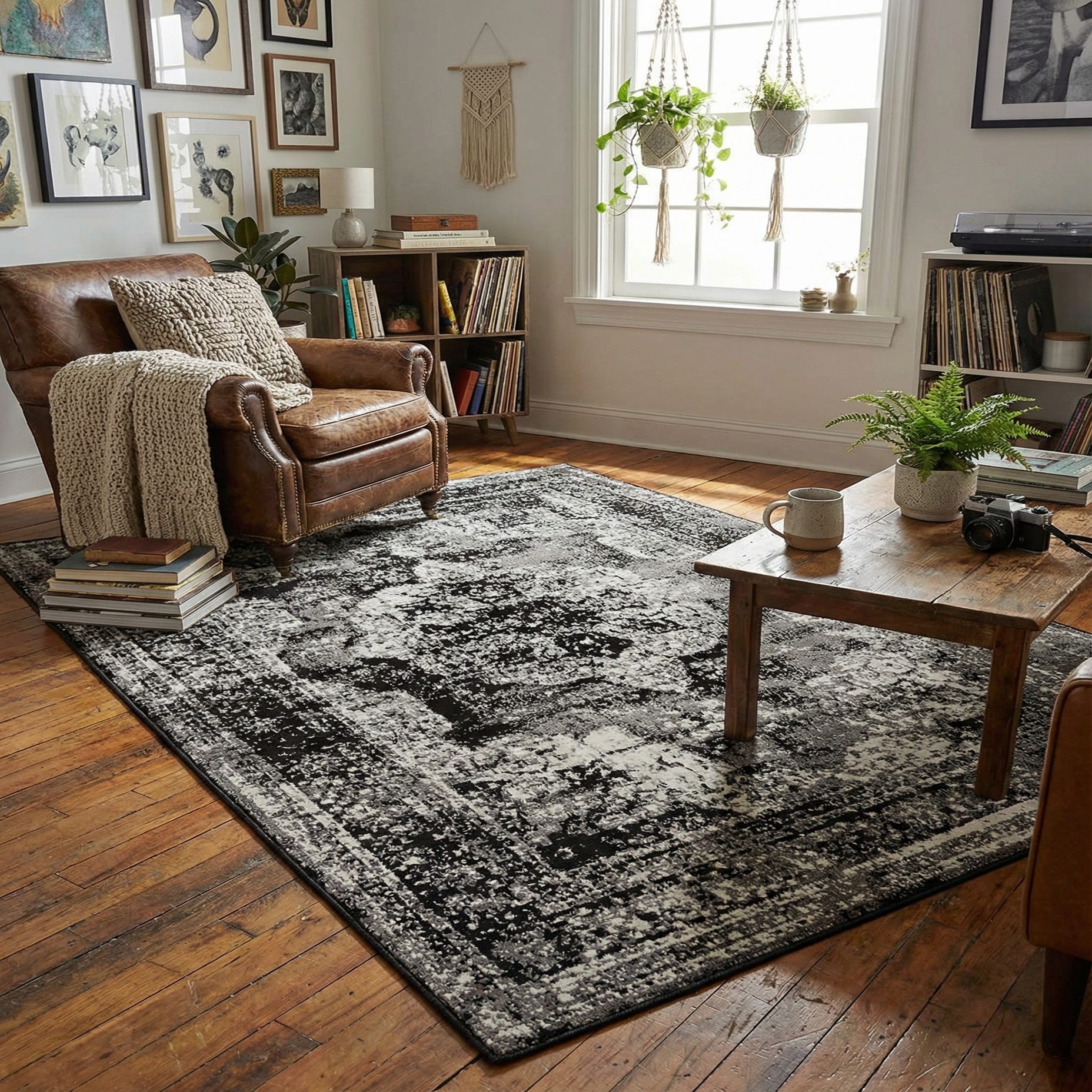 With its stain-resistant properties and a shed-free design, this rug combines practicality with visual appeal. The contemporary aesthetic of this piece makes it a versatile choice for modern, industrial, or minimalist interiors. It can effortlessly ground a living space, office, or bedroom, providing a sophisticated anchor to a monochrome scheme or serving as an understated counterpart to bolder furniture pieces.