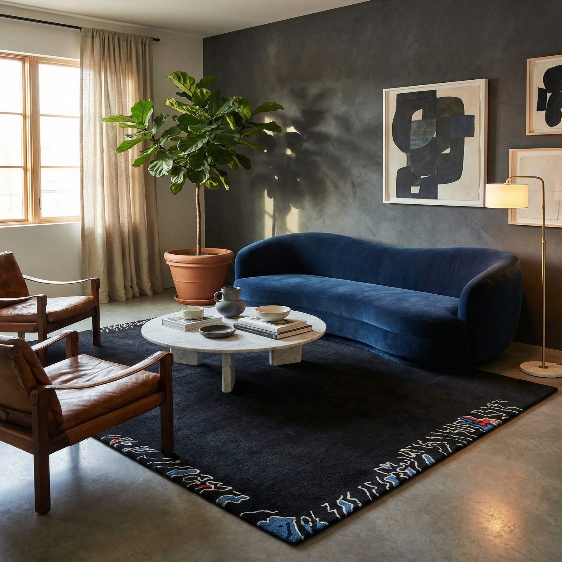 The rug's texture and hand-knotted craftsmanship reflect a dedication to quality and artistry, making it a practical choice for areas with moderate foot traffic. Its restrained design and color scheme render it versatile for integration into various interior settings, from modern urban lofts to more traditional spaces that benefit from a touch of modernity. This piece would complement sleek, minimalistic furniture as well as act as a grounding element in eclectic decor where it can balance more vibrant patterns and colors.