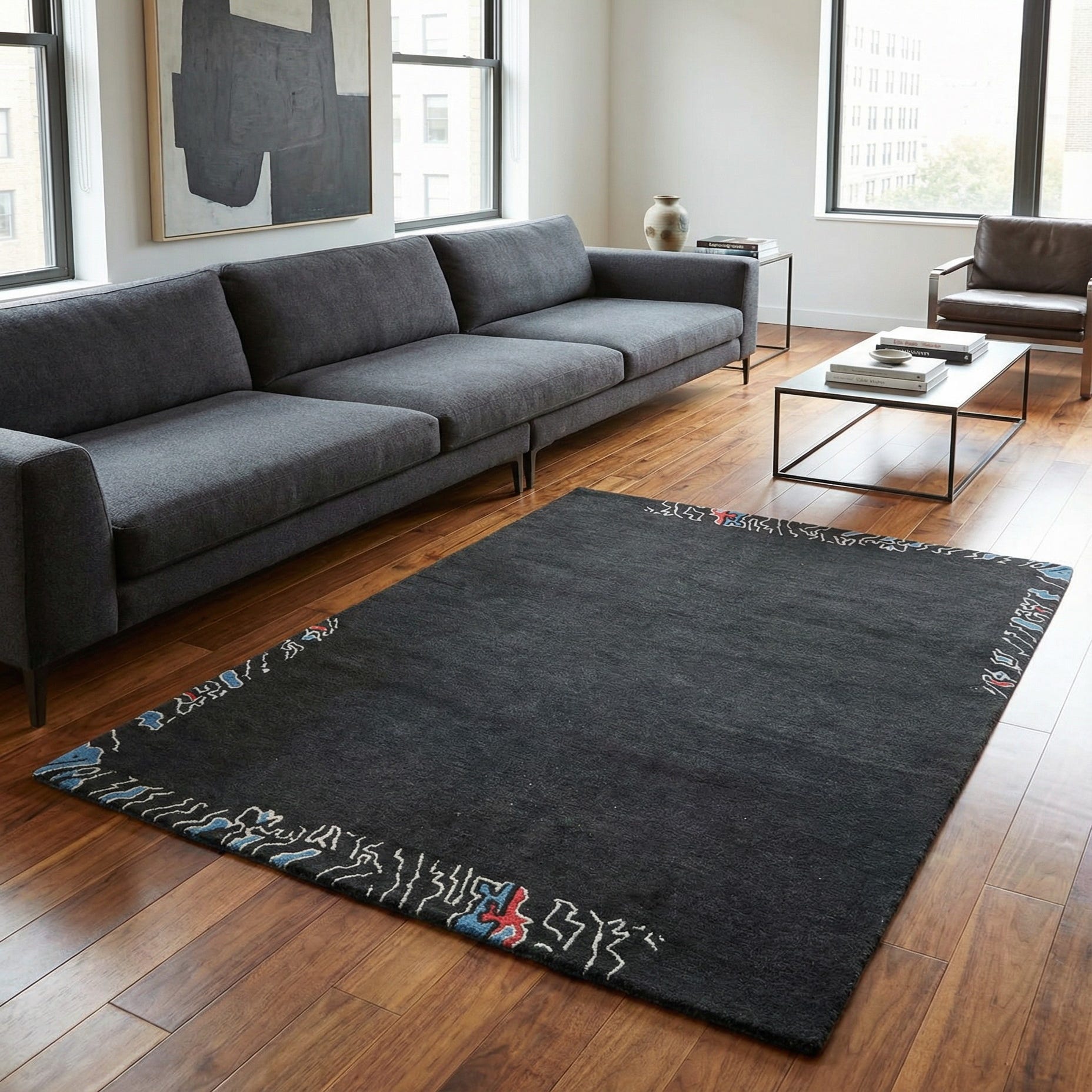 From the Nepal collection, this 4x6 hand-knotted rug is crafted from 100% wool, presenting a robust and tactile surface that contributes to its durable quality. The rug features a deep black background, creating a bold statement that anchors any space with sophistication. Its minimalist border design incorporates an abstract pattern with strokes of blue, gray, and red, providing a contemporary edge while maintaining an overall timeless aesthetic. The juxtaposition of vivid accents on the dark base creates visual interest without overwhelming.