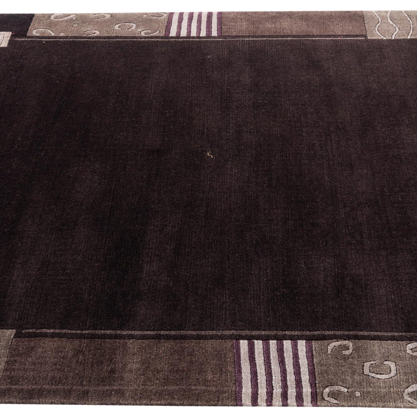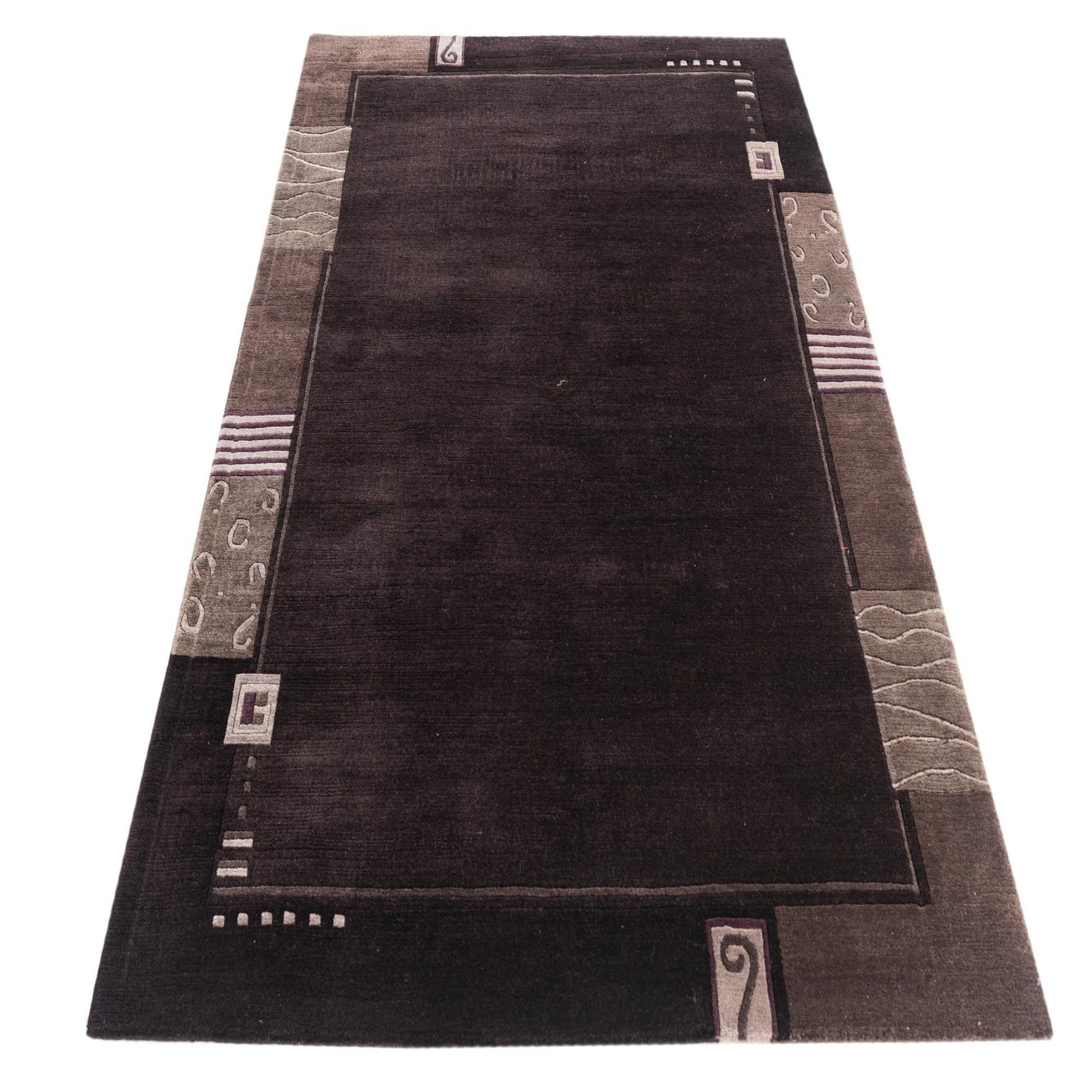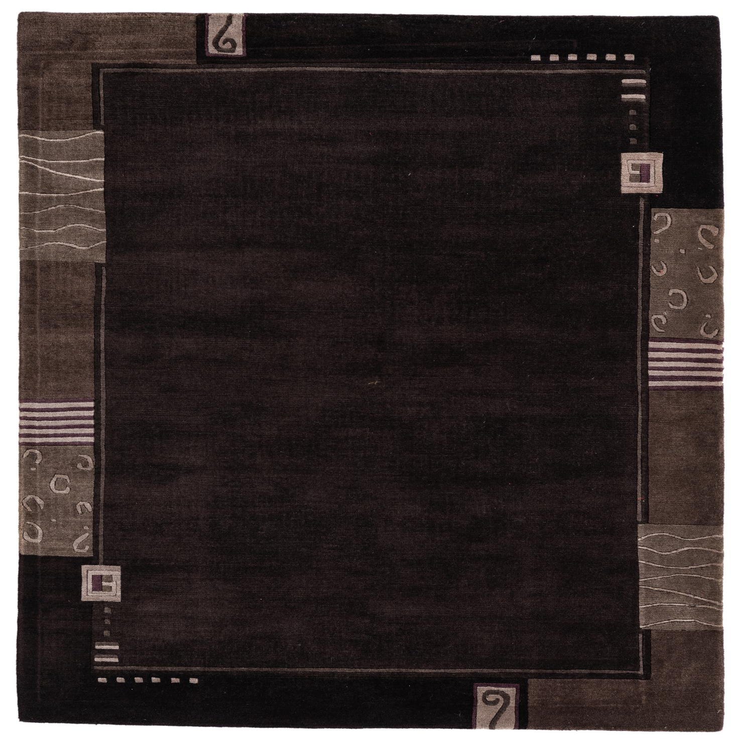 A 4x6 rectangular black wool rug with a modern abstract border in shades of gray and purple, suitable for a living room.