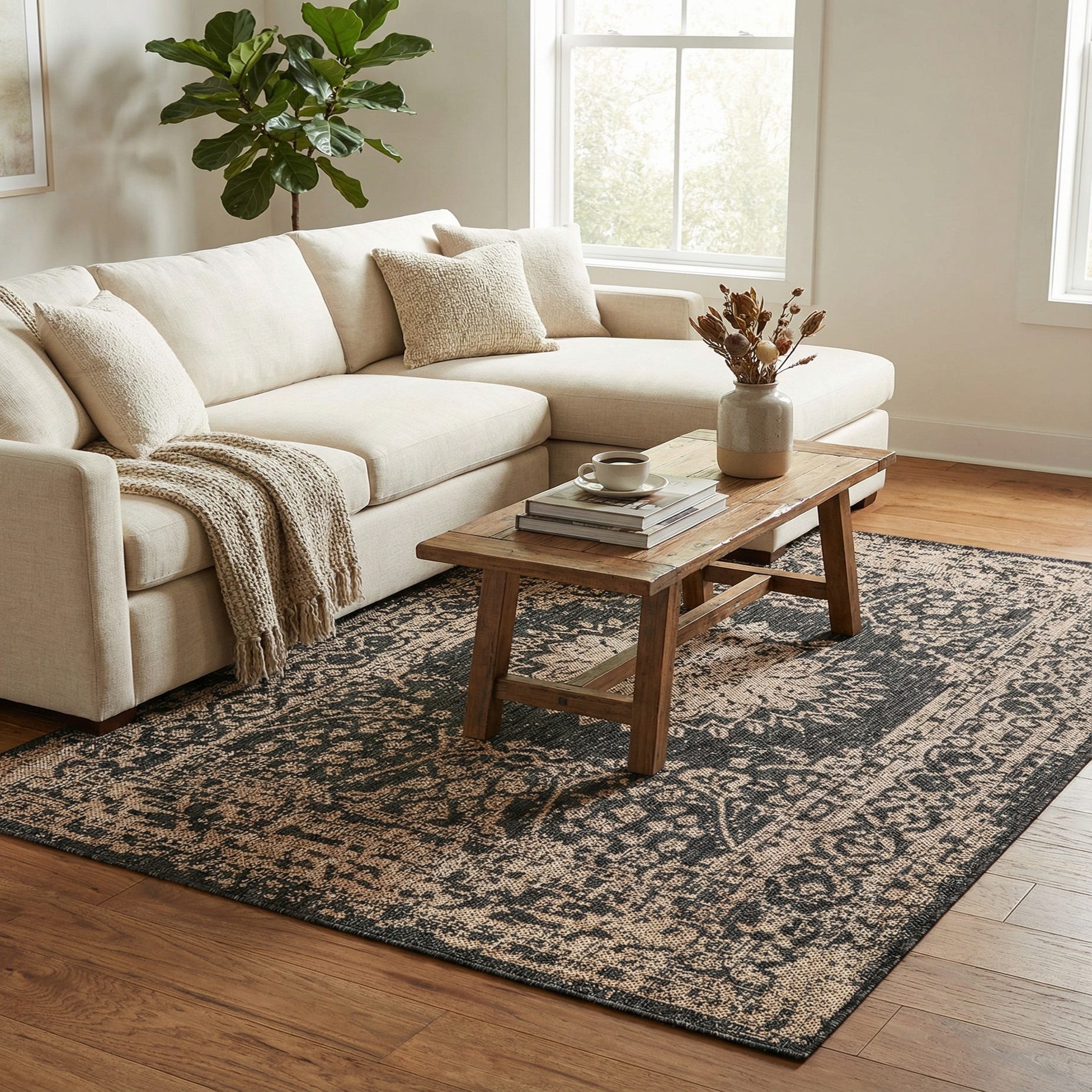 A 4x6 rectangular black and beige indoor/outdoor rug with a distressed traditional medallion pattern, ideal for a patio or living room.