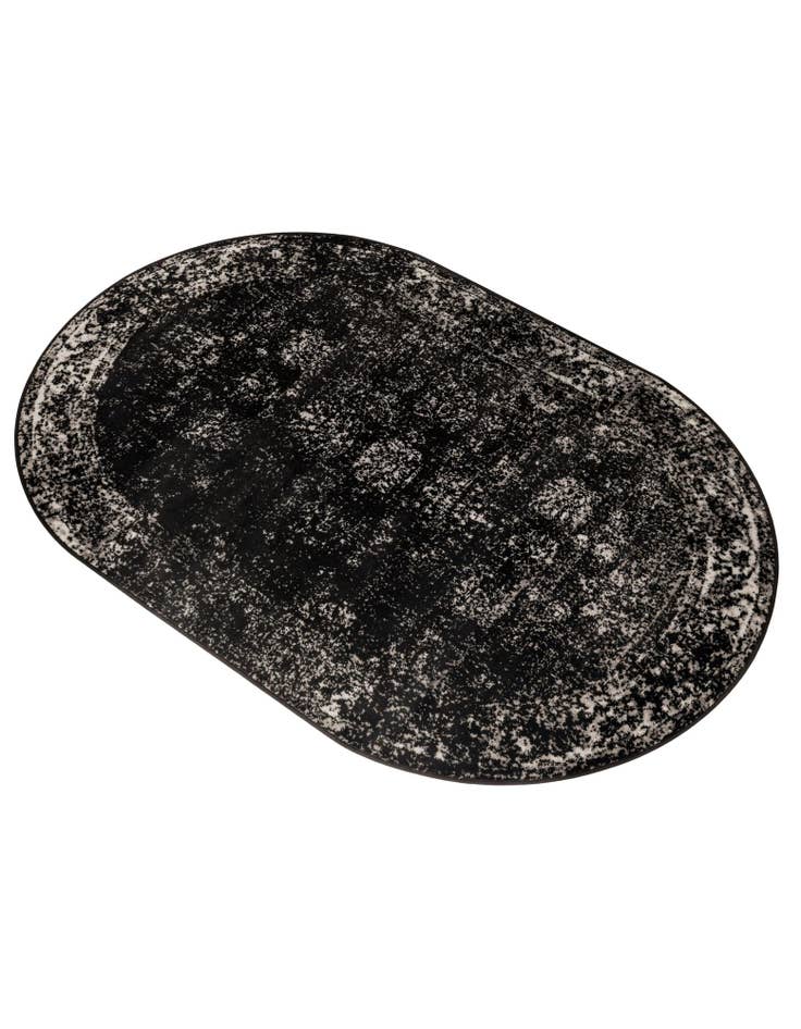 A distressed, vintage-inspired pattern gives this oval rug a quietly layered look: a deep black ground is interrupted by mottled ivory and gray highlights that form a softly faded medallion and border. The irregular, abrash effect creates visual texture across the field without strong contrast, so the pattern feels aged and approachable rather than ornate.