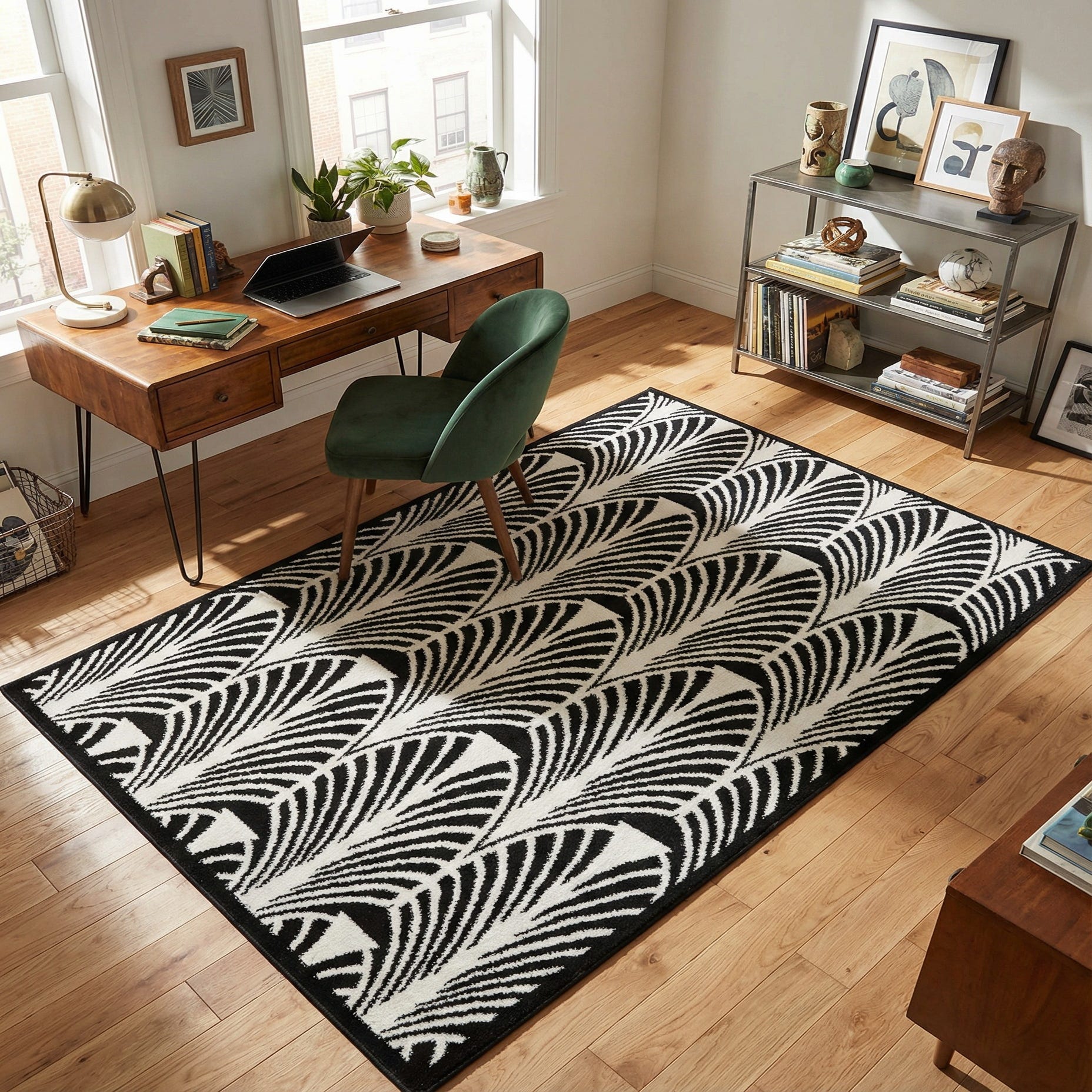 Machine-made from 100% polypropylene, the rug has a smooth, slightly dense hand that feels comfortable underfoot while holding the pattern definition well. Use it to define a small seating area in a living room, anchor a compact dining nook, or add visual interest at the foot of a bed. The high-contrast palette and geometric rhythm work especially well with monochrome and minimalist schemes, mid-century modern furnishings, or contemporary spaces that benefit from a strong, graphic focal point.
