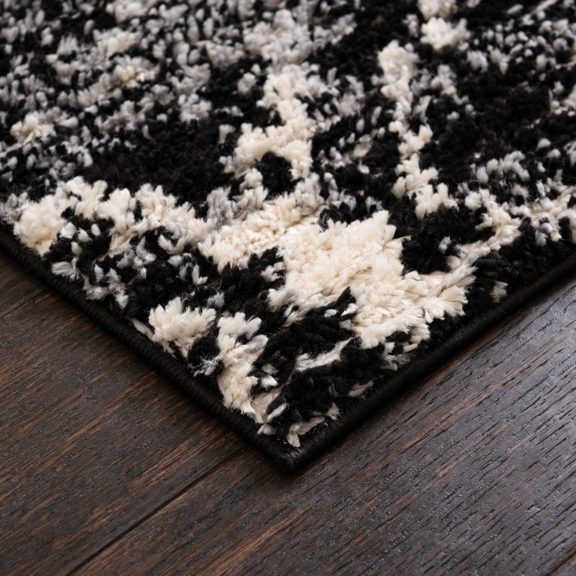 A bold, modern pattern of broken medallions and irregular lattice work crosses a deep black field, with gray and ivory highlights that create a lived-in, slightly distressed look. Machine made from 100% polyester, the surface has a soft, slightly plush hand and a low-sheen finish that picks up light across the tonal highlights, giving the pattern clear depth and visual texture. The black background anchors the motif while the ivory and gray accents add contrast without feeling fussy.