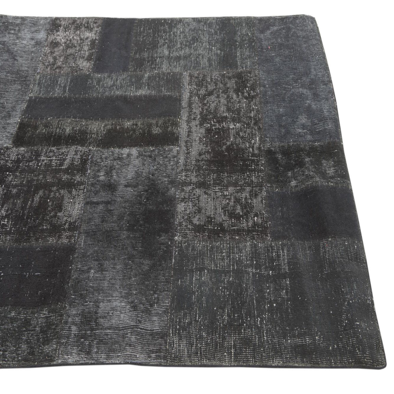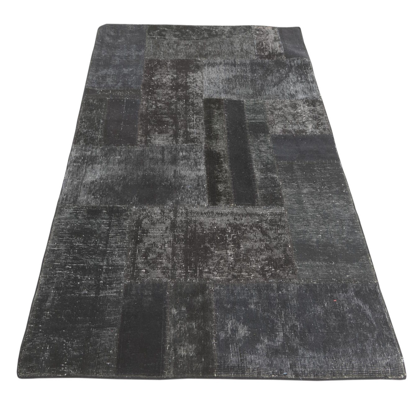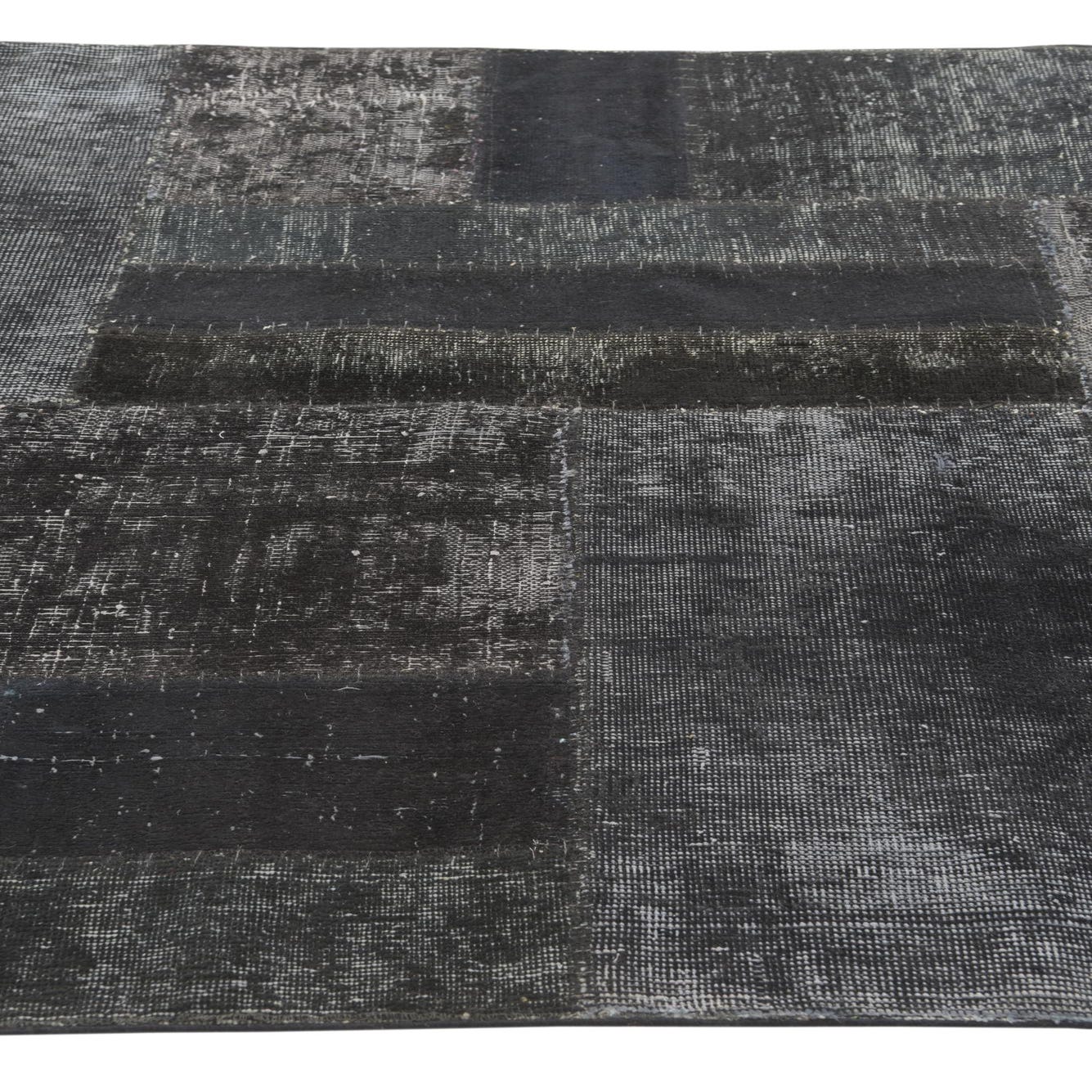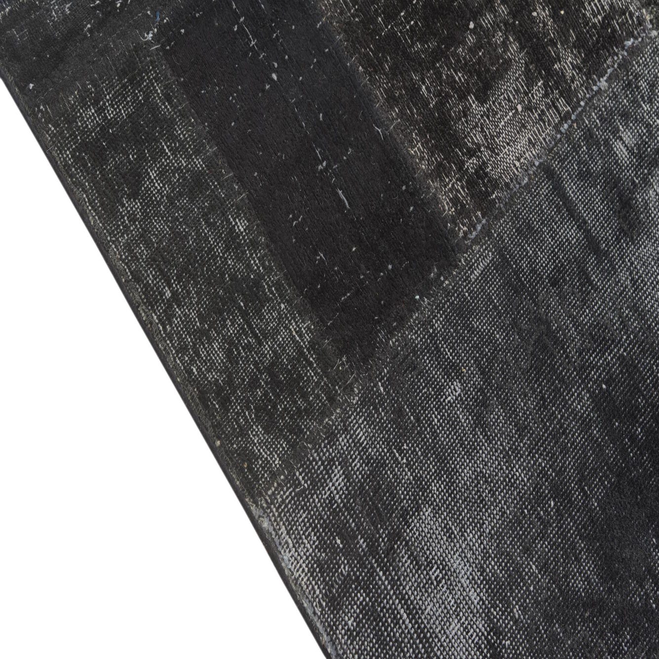A 4x6 rectangular black patchwork rug with varied distressed patterns, suitable for a living room.