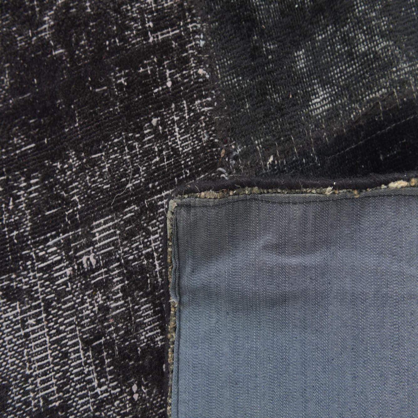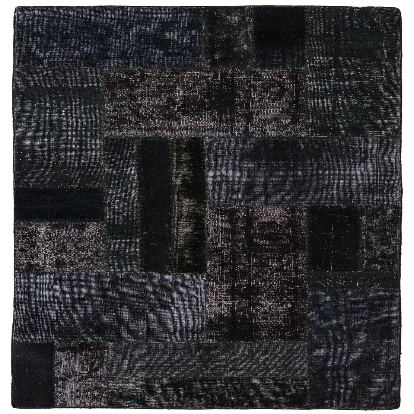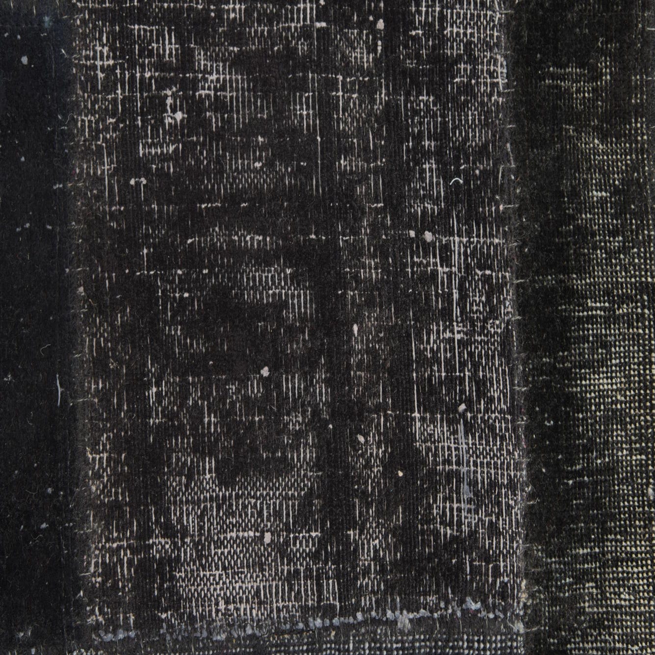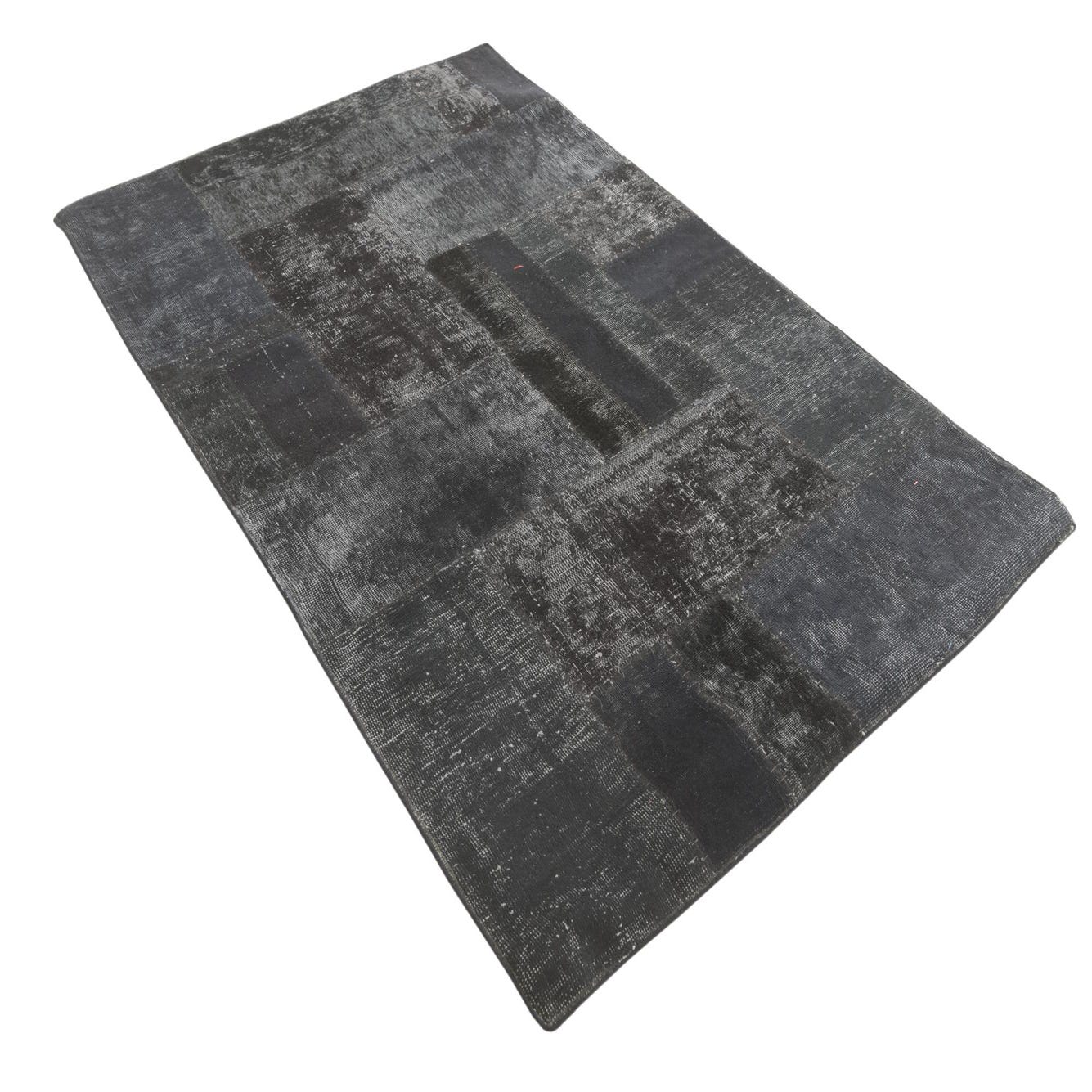 A 4x6 rectangular black patchwork rug with varied distressed patterns, suitable for a living room.