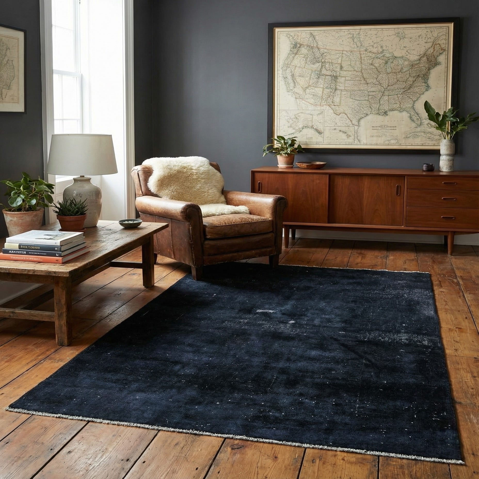 The rug’s restrained palette and worn character suit modern, minimalist, and industrial interiors where a strong, grounding element is needed. It works well under a living room seating group to anchor furniture, layered beneath a bed for added depth, or as a calm, gallery-like foundation in a home office or entry. Pair with warm woods, matte metals, and neutral textiles to balance the dark field and let the gray highlights register in changing light.