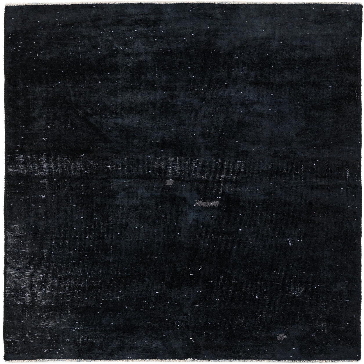 Hand-knotted in 100% wool, this rug presents a deep black background accented with soft gray flecks and subtle tonal shifts. The design is a pared-back vintage distress: a near-solid field with faint horizontal wear bands and scattered mineral-like speckles that add visual texture without a defined motif. The dense wool pile has a smooth, low-sheen finish that gives the surface a tactile softness and gentle nap variation when walked across.