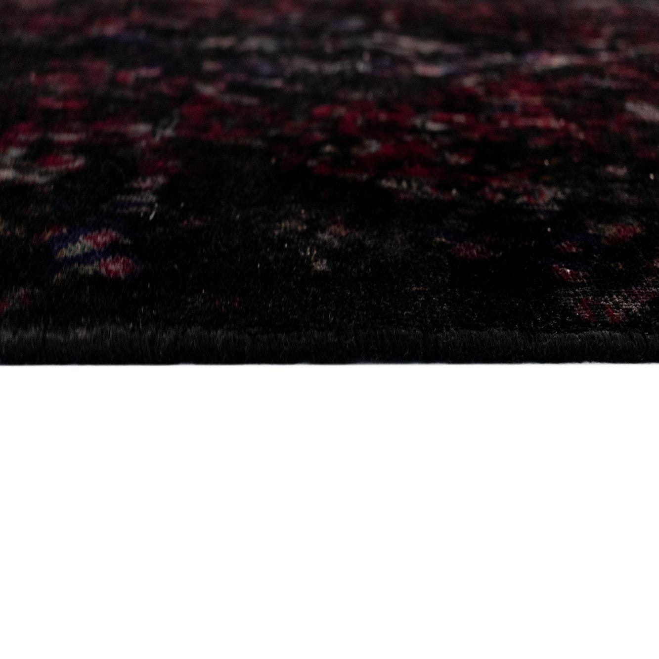 Deep black forms the backdrop for a quietly ornate, vintage-inspired pattern in deep red and muted gray highlights. A worn medallion and scattered floral motifs emerge from the surface, softened by a deliberately distressed finish that reveals subtle color variation across the field. Hand made of 100% wool, the rug has a soft, low pile that feels warm and slightly velvety underfoot while retaining the textured character of hand-knotting.