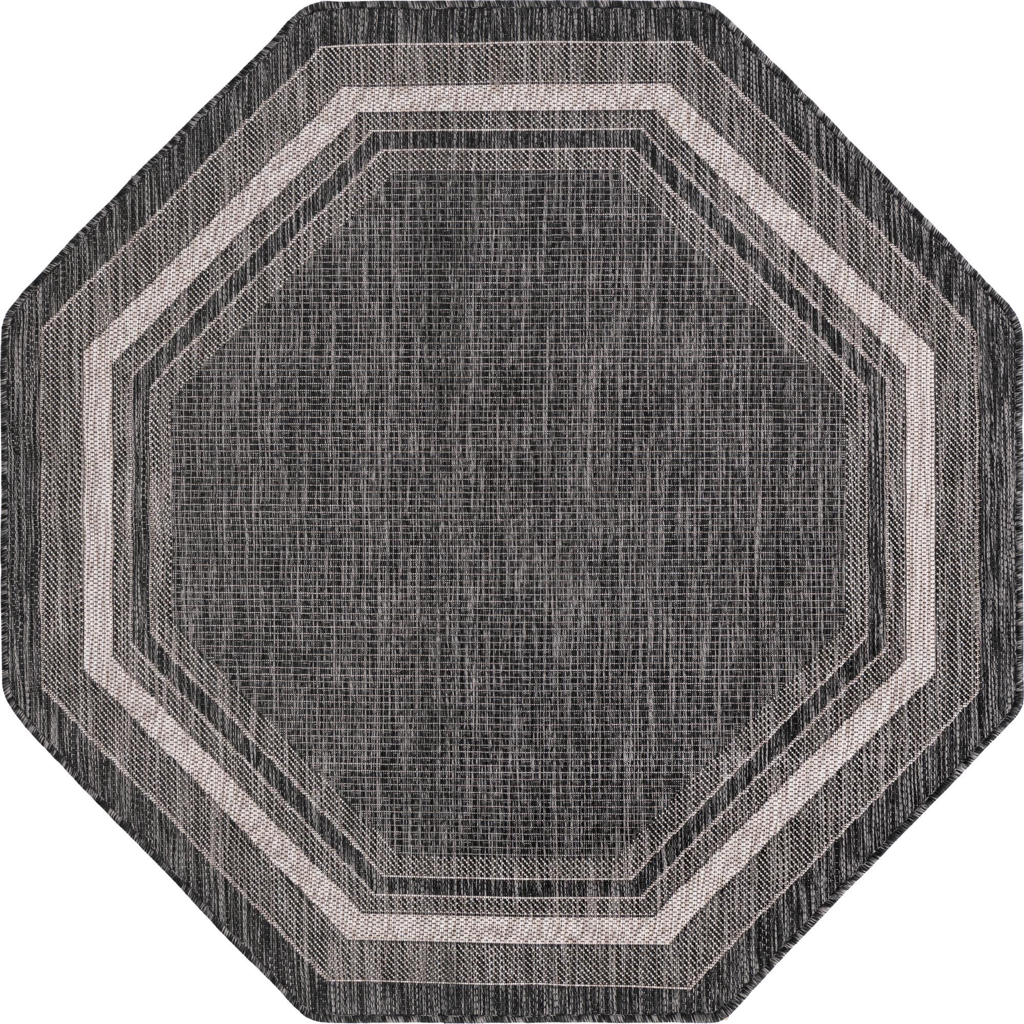 Octagon-shaped black and grey flatweave rug with a modern solid border design, suitable for indoor/outdoor use.