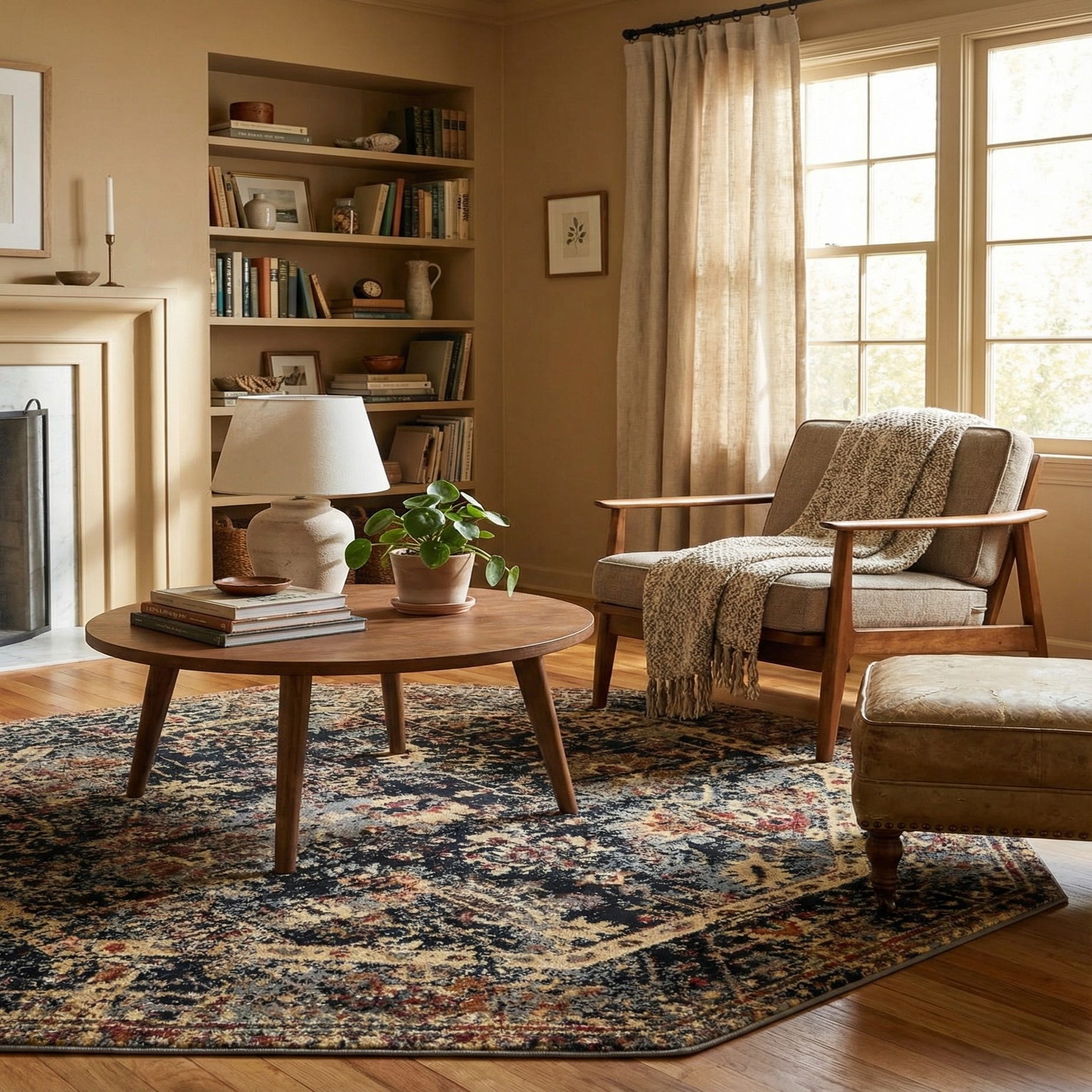 The octagon format works well under a round dining table, centered in a cozy conversation group, or as a statement piece in an entry or home office. Pair it with warm wood furniture and leather seating to echo the rug’s brown and tan tones, or use it to anchor a neutral sofa and brass lighting for a layered, transitional look. The color palette also complements industrial and vintage-inspired interiors, where the distressed motif ties together mixed finishes and antique accents.