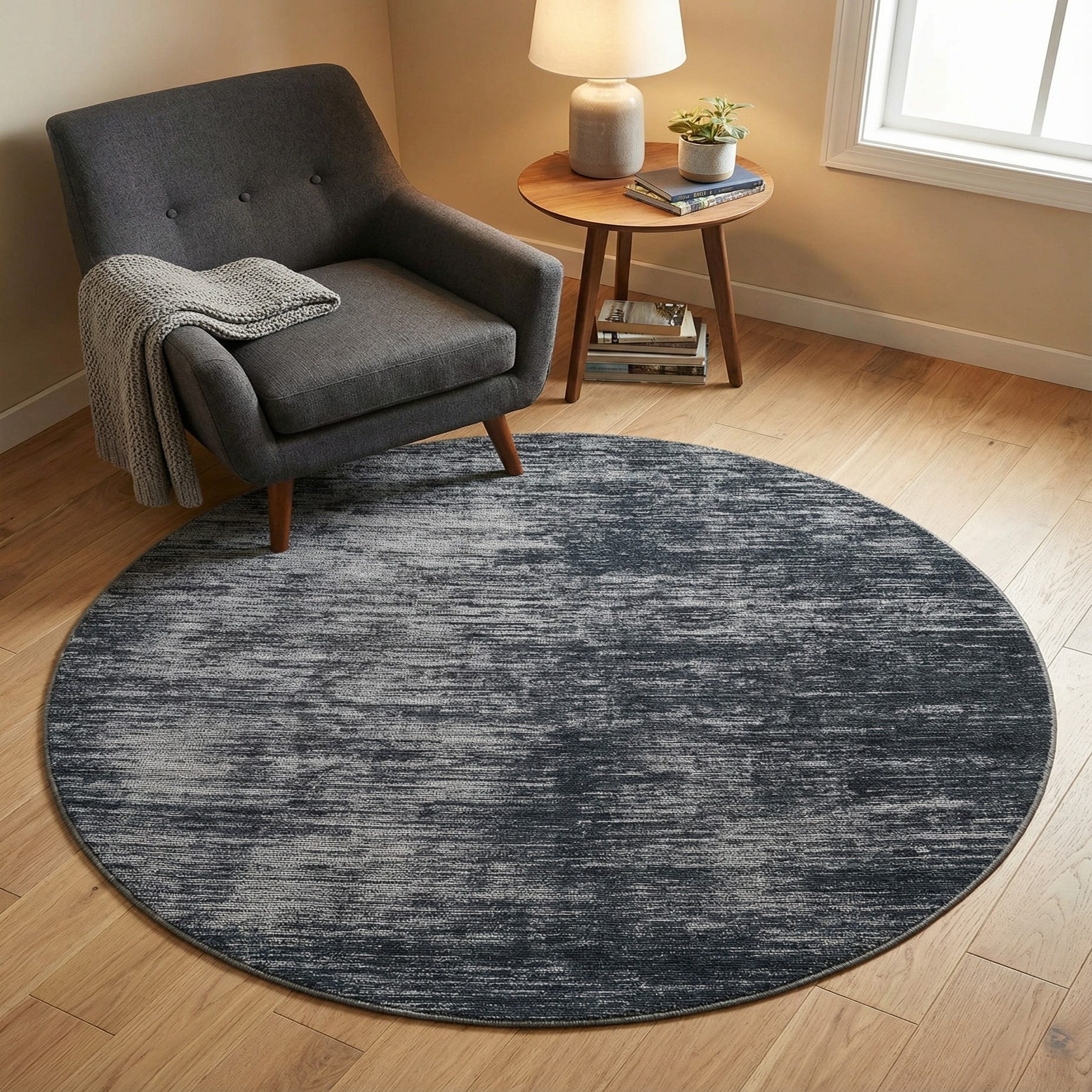 A round 5' 0 x 5' 0 black chenille rug with a modern textured stripe pattern, suitable for indoor spaces.