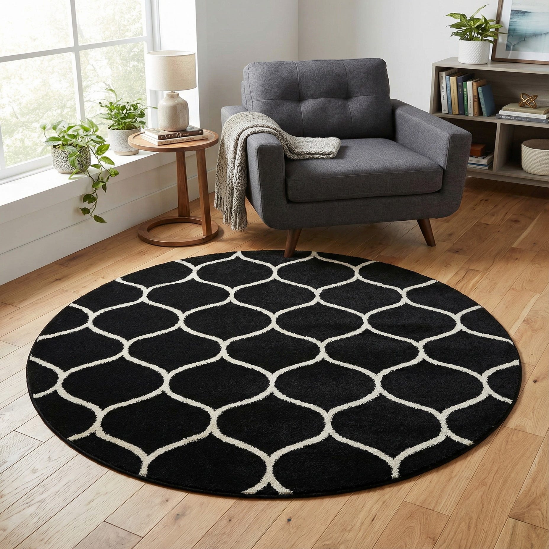 The round shape is ideal for defining a small dining nook, centering a seating grouping in a compact living room, or adding a bold entry statement. Pair it with streamlined, contemporary furniture and metallic accents for a modern feel, or use it to ground lighter wood tones and neutral upholstery in a transitional scheme. Its clear geometry and contrast make it a versatile choice for kitchens, home offices, or bedrooms where a refined, graphic element is desired.