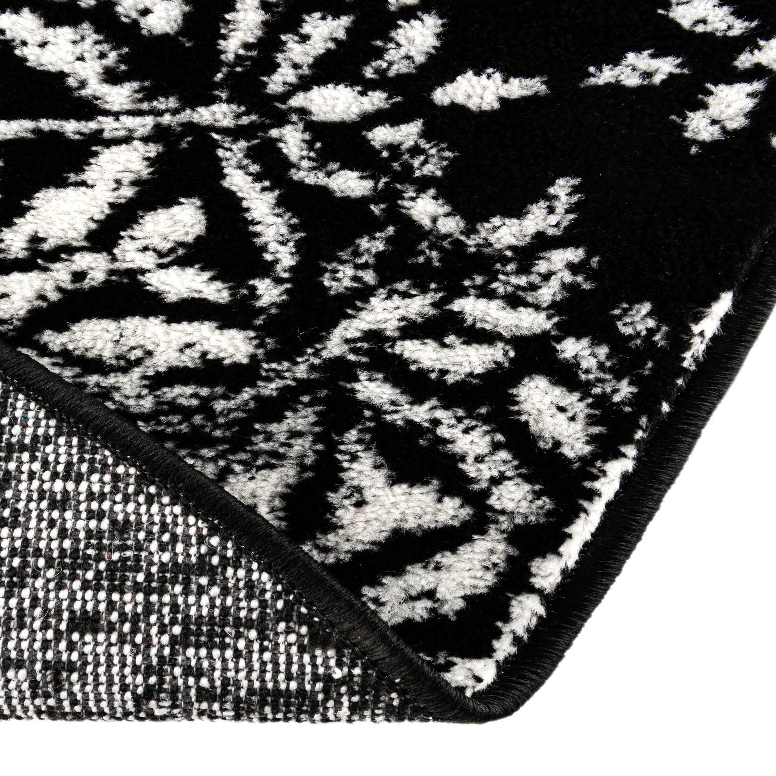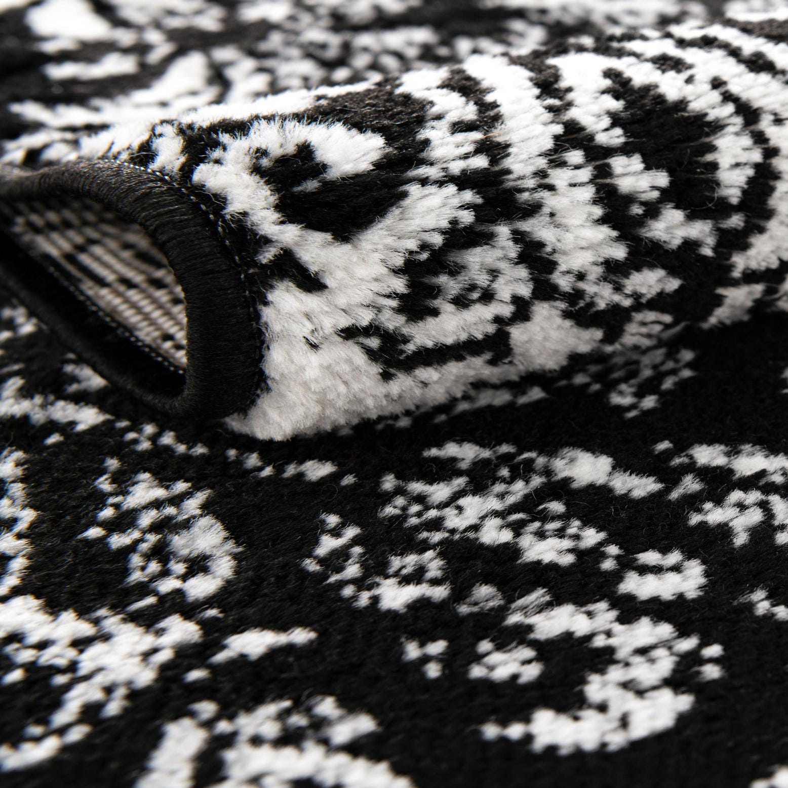 A dramatic black ground sets the stage for an ornate, circular medallion and scattered floral motifs in contrasting ivory. The pattern blends traditional arabesque detailing with a distressed overlay, creating areas of bold definition and softened, worn-in contrast that read as layered and dimensional. Machine made from 100% polypropylene, the rug has a low, dense pile with a smooth texture and a faint, natural sheen from the fibers.