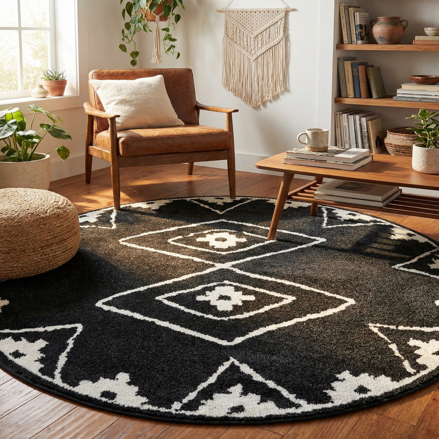 A 5' round black modern rug with a bold white geometric pattern, featuring diamonds and triangles.