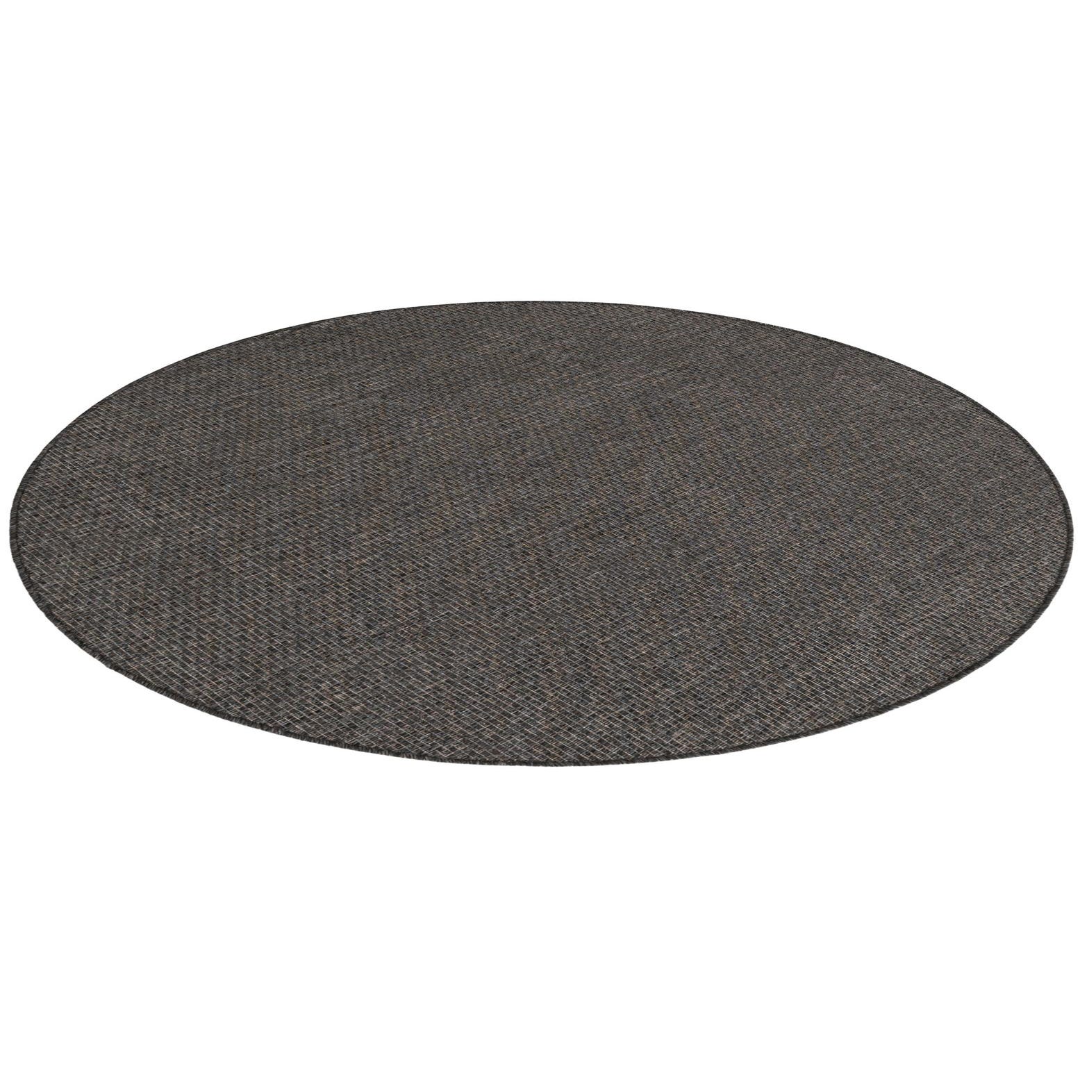 A 5' 3 round black modern flatweave rug with a subtle textured pattern, suitable for indoor or outdoor use.