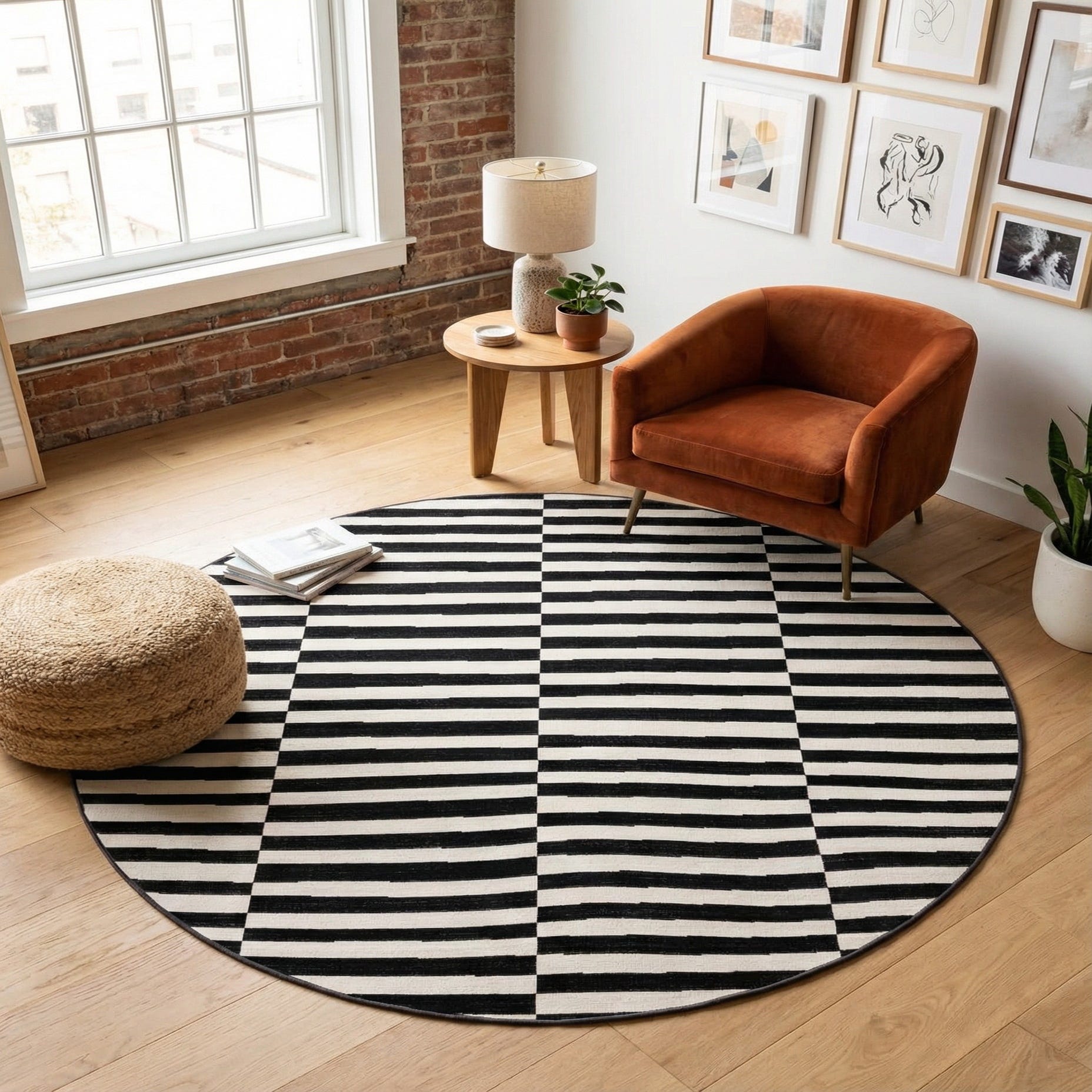 The clean lines of the stripes on this rug render it versatile for a variety of interior design scenarios. Its bold pattern makes it suitable as a focal point in a minimalist setting or as an accent piece in a more eclectic space. The color palette allows for easy integration with monochromatic decor or as a counterpoint to more vibrant color schemes.