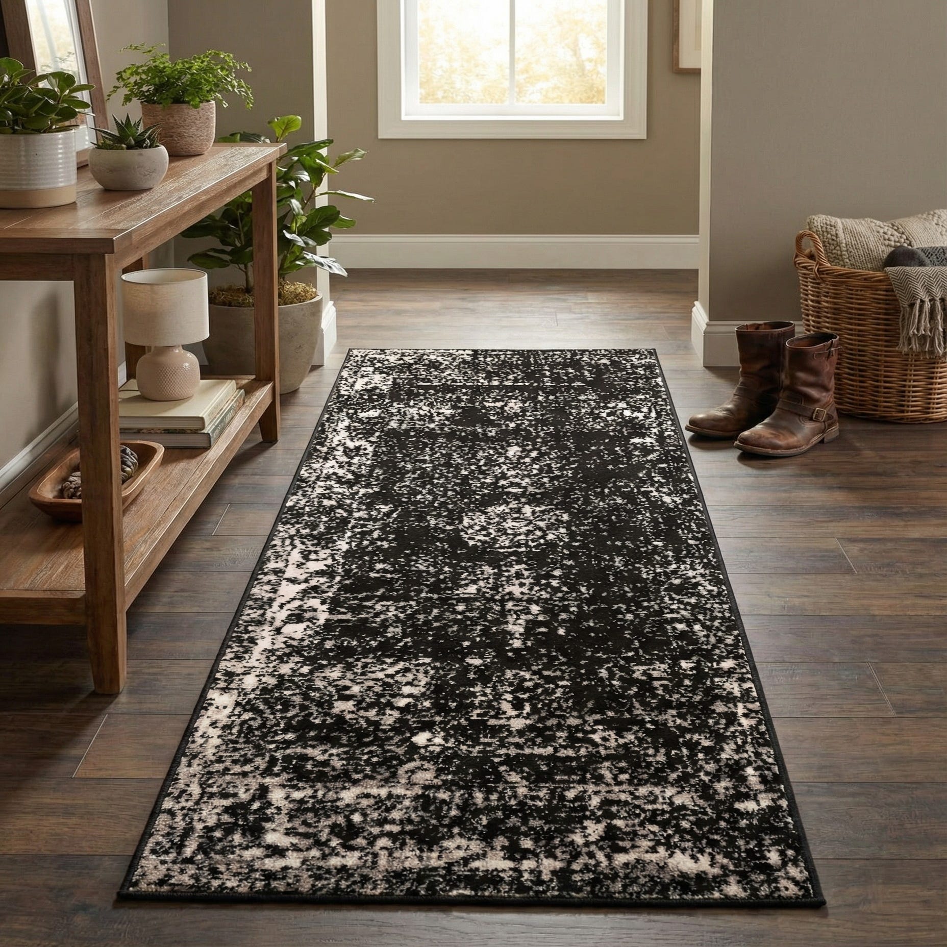 This runner works well in narrow spaces where you want to add contrast and depth — think entryways, hallways, or beside a bed. It pairs naturally with modern and transitional interiors, especially rooms with metal or glass accents, monochrome palettes, or warm wood tones that balance the rug’s high-contrast look. Use it to ground seating areas in a compact living room or to introduce subtle pattern and texture along a kitchen corridor.