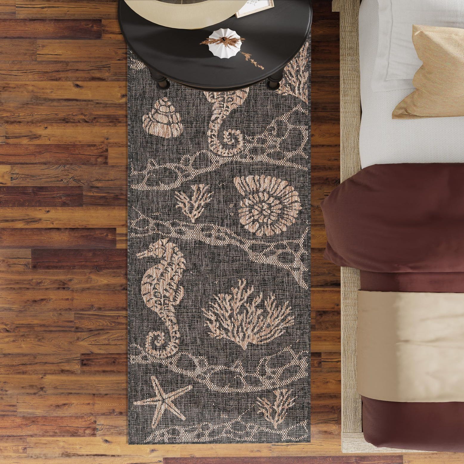 A bold black field sets the stage for an open-ocean motif of seahorses, shells and coral rendered in warm brown and ivory. The pattern is nautical without being literal—large-scale marine silhouettes woven with a slightly faded, textural effect that gives the design depth and movement. Machine-made from 100% polypropylene, the rug has a low-profile, tightly woven surface that feels firm underfoot with a subtle, slightly coarse texture typical of outdoor-grade weaves.