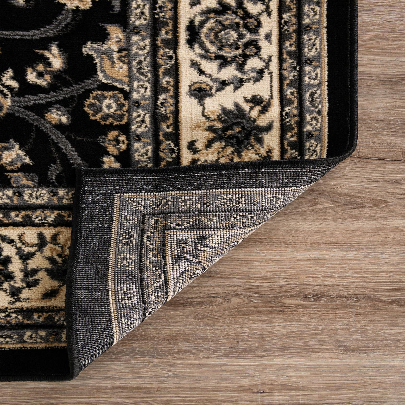 A classic medallion and scrolling floral pattern rests on a deep black ground, with an ivory inner border that frames the central design. Gray and tan highlights travel through the vines and blossoms to add layered contrast and visual depth. Machine made of 100% polypropylene, the rug has a low, dense pile that feels smooth and slightly plush underfoot, delivering clear pattern definition and an even surface texture.