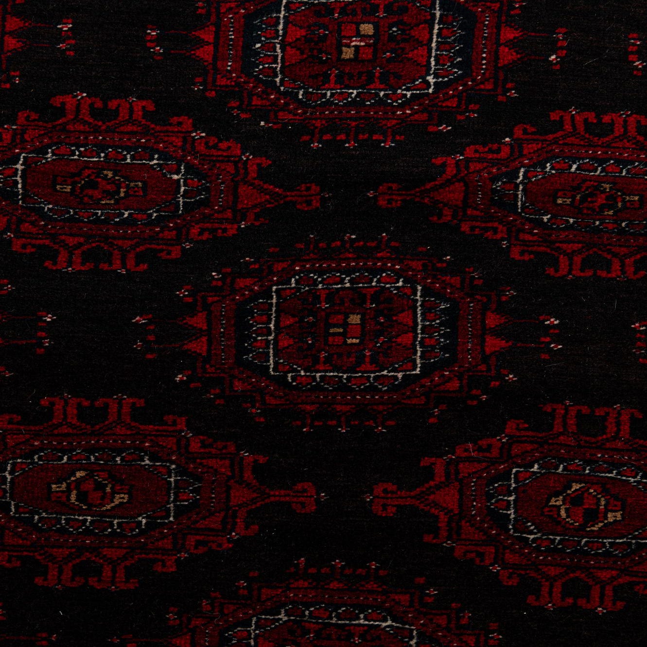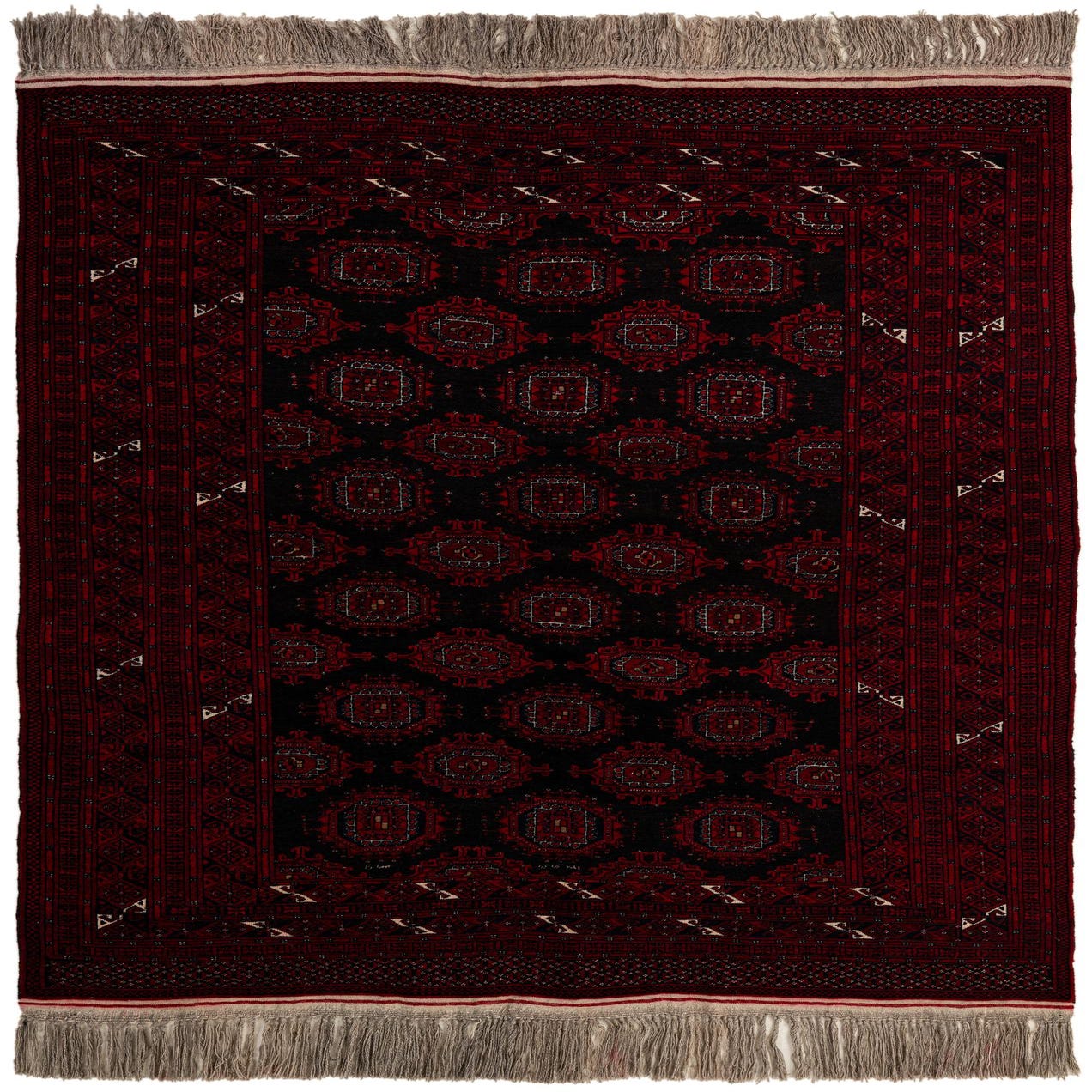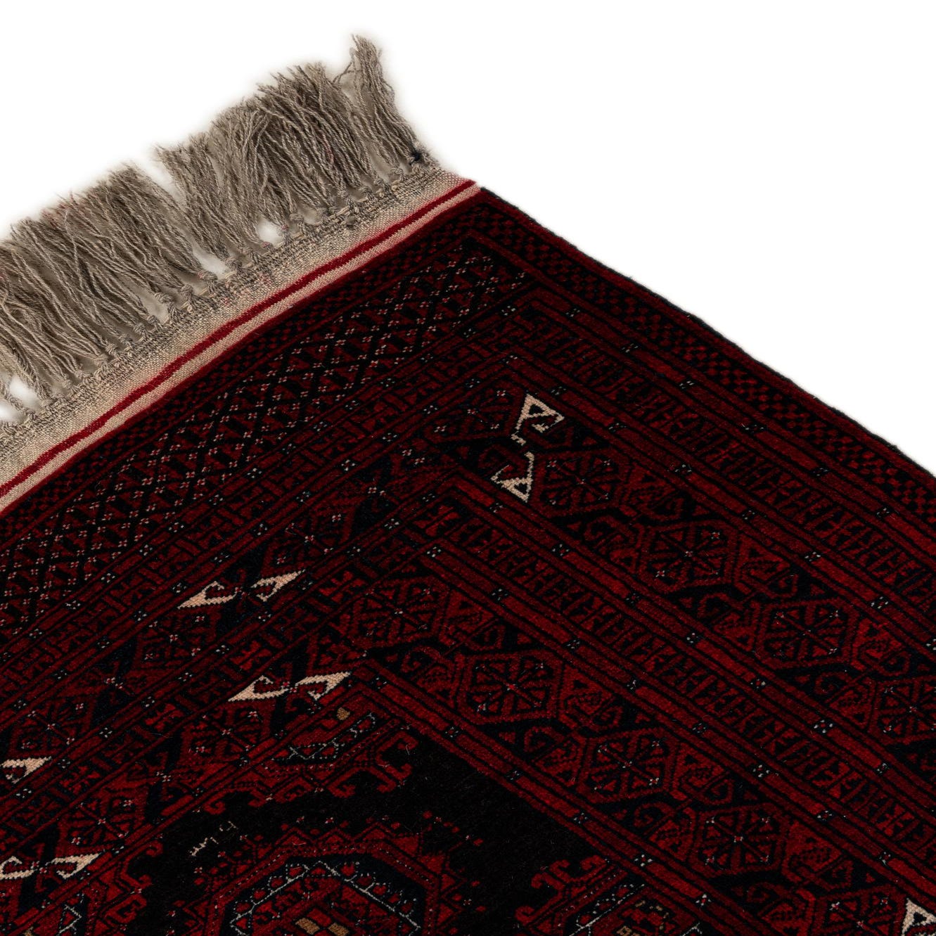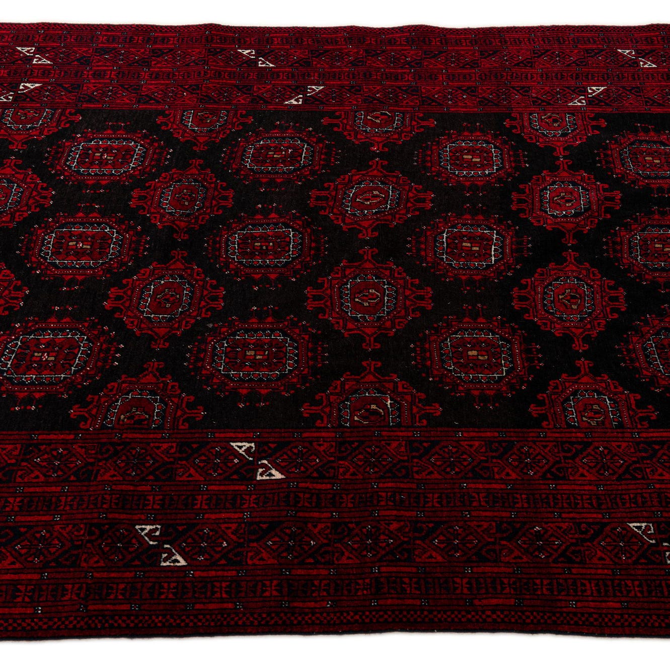 A 5x7 rectangular black Afghan Akhche rug with a traditional tribal pattern in deep red and intricate details, featuring light fringes.