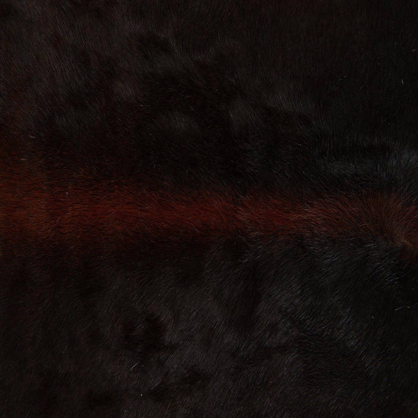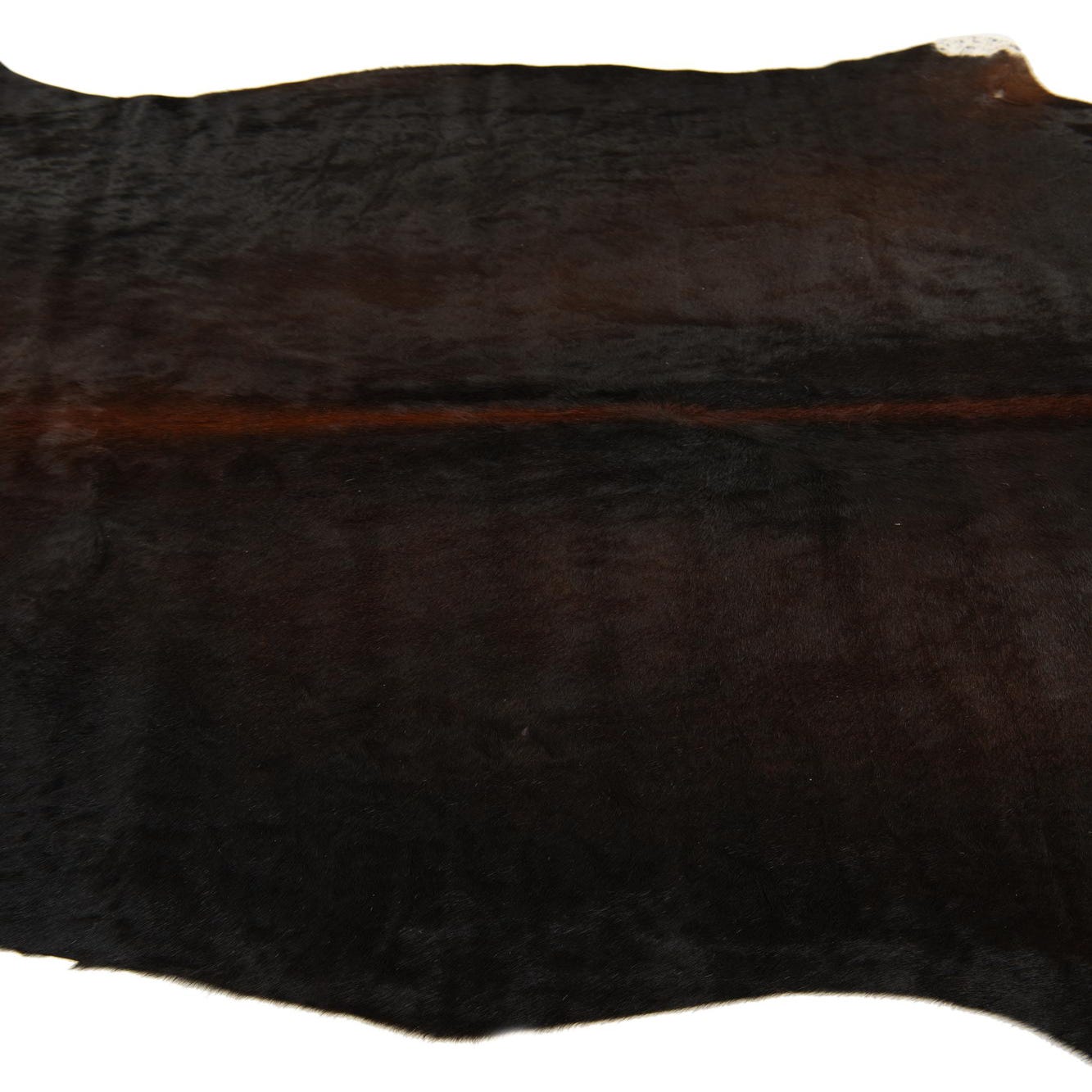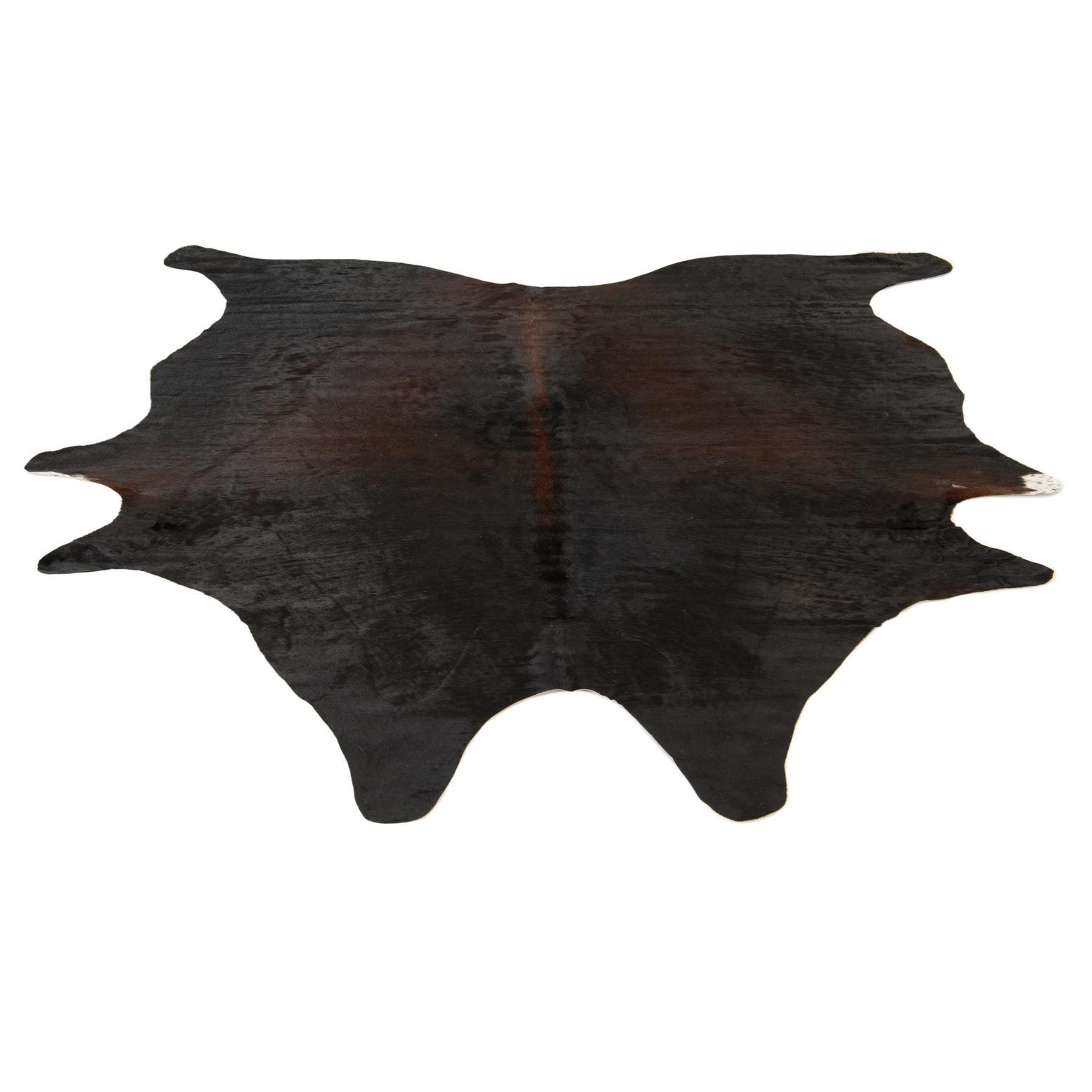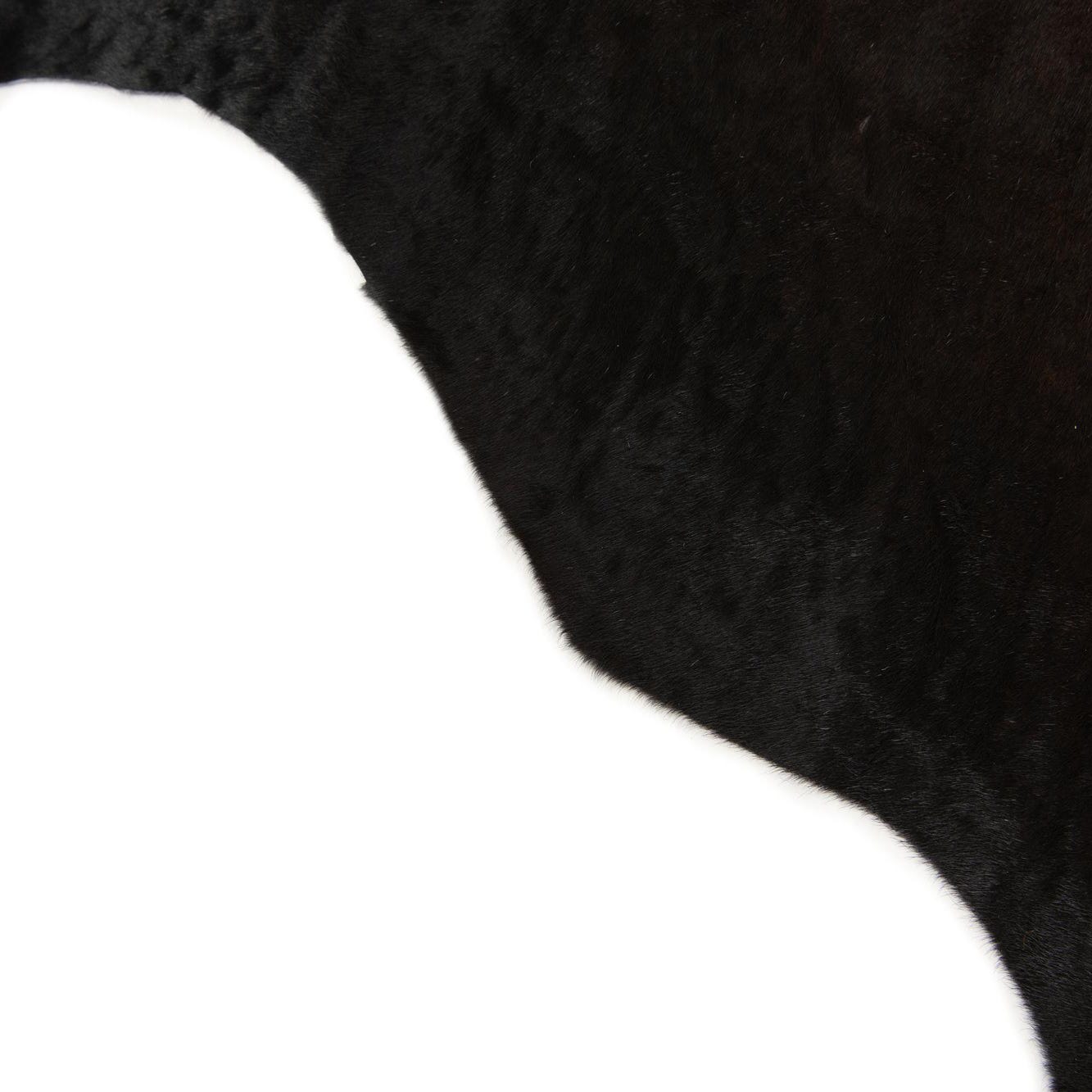 A 5x7 black cowhide rug with a natural, irregular shape and subtle brown undertones, ideal for a modern living space.