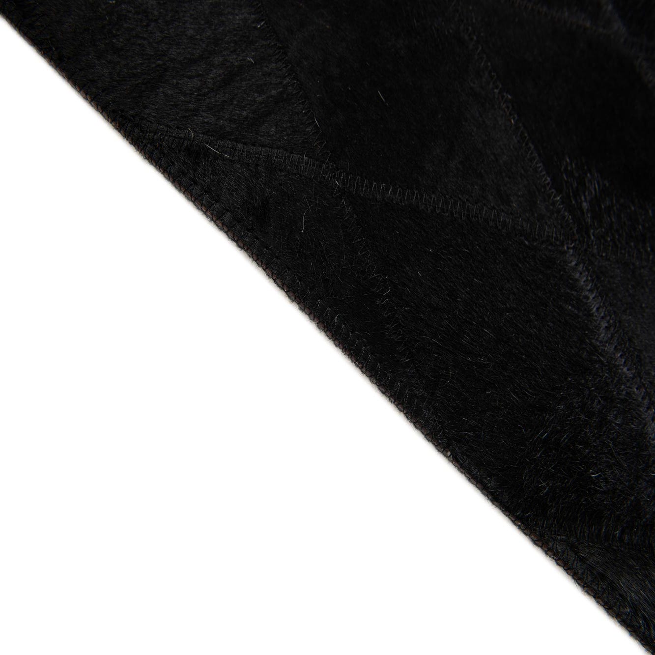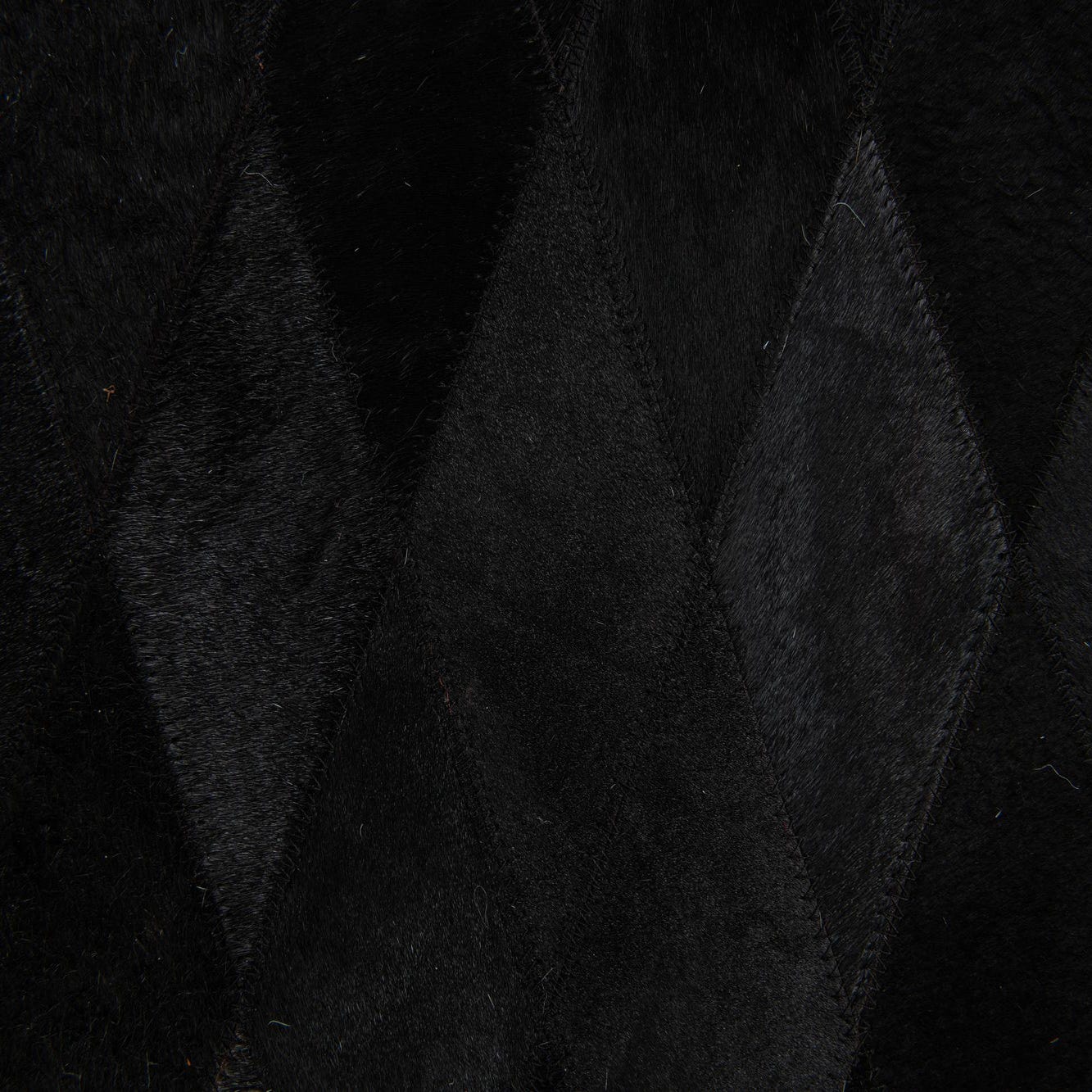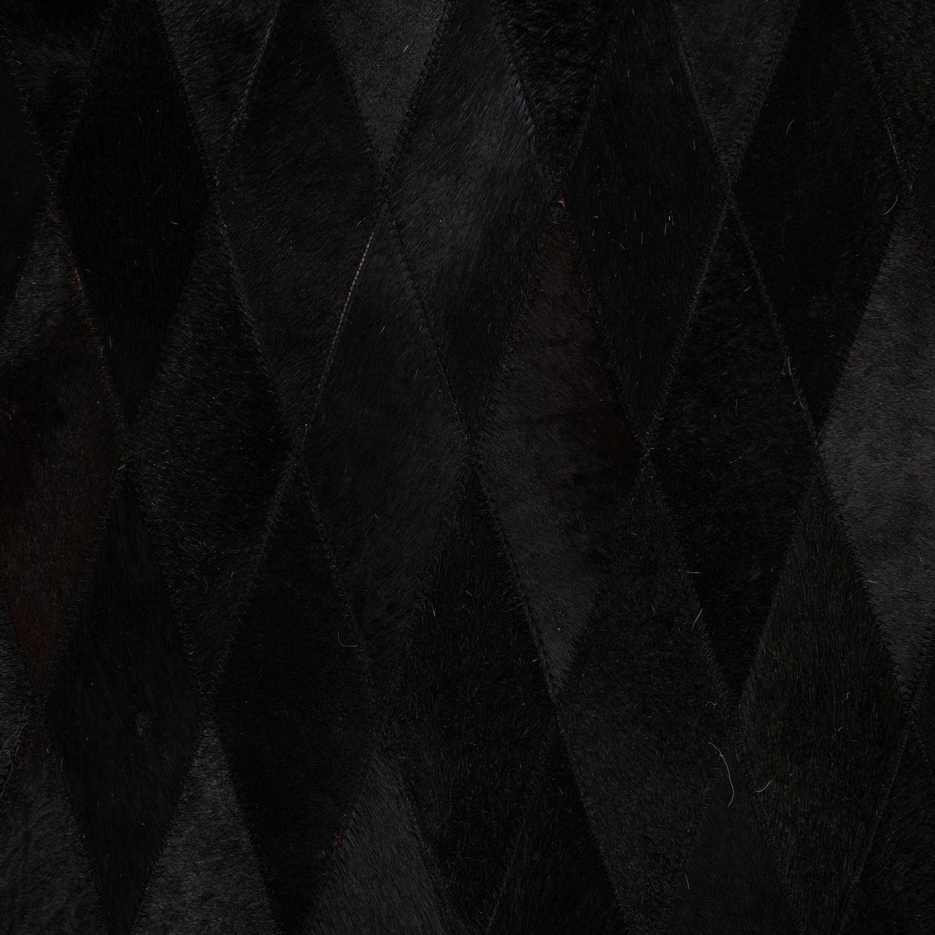 Hand made of cowhide and leather, this rug is a tight patchwork of diamond-shaped panels set on a deep black ground. Each rhombus carries slight tonal shifts of black and brown, and the hair-on-hide surface has a low, velvety nap that catches light with a soft sheen. The stitched seams between pieces create a subtle raised texture you can feel under your fingertips, while the leather foundation gives a firm, grounded hand.