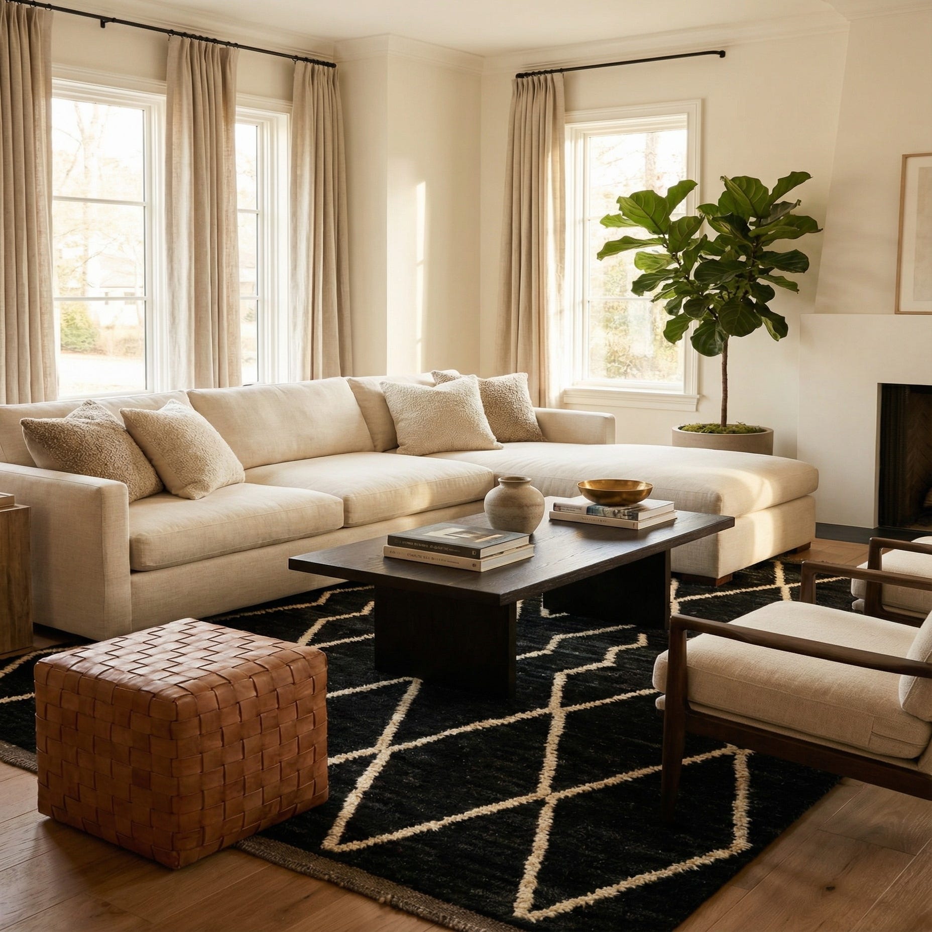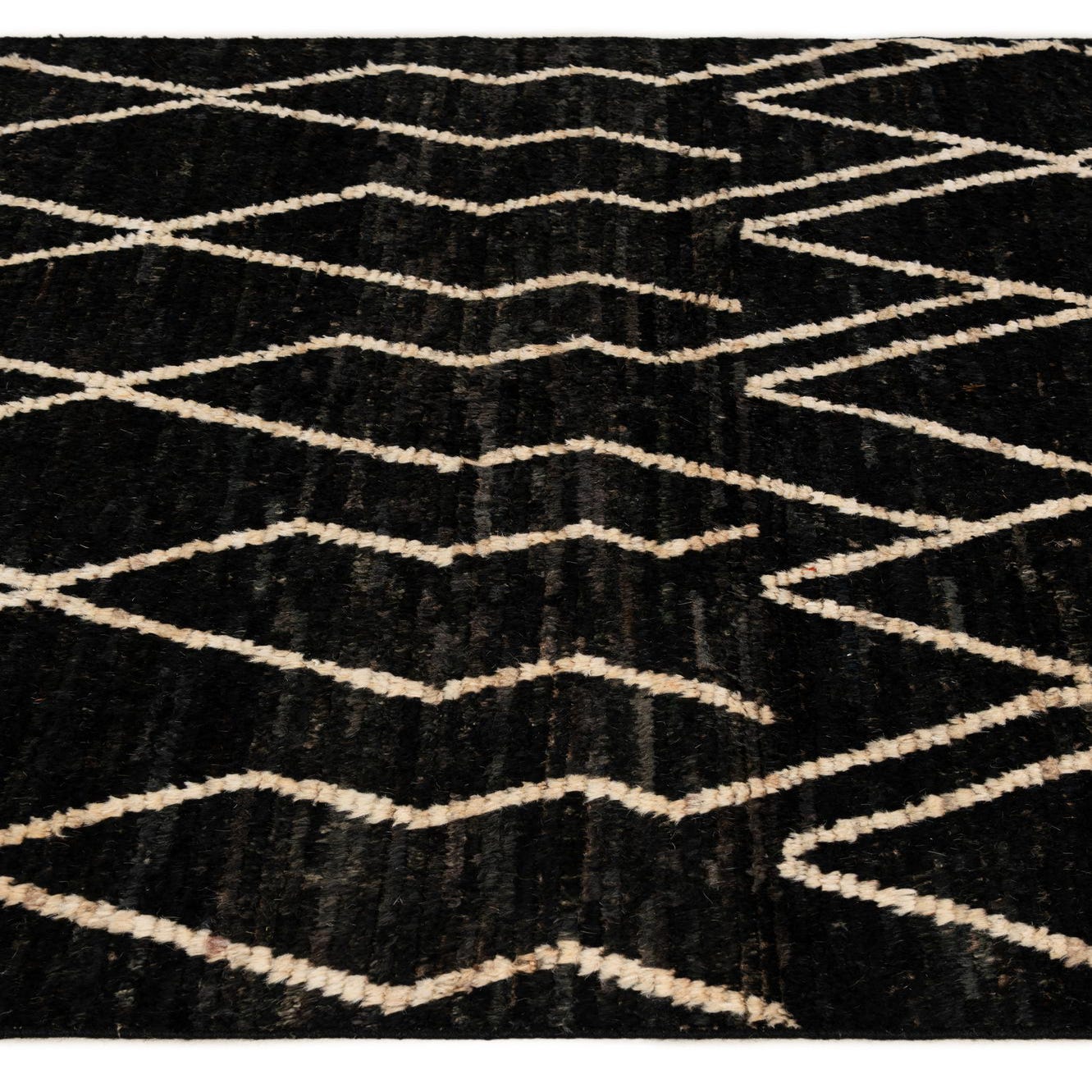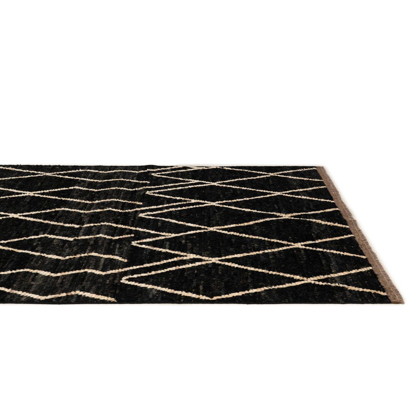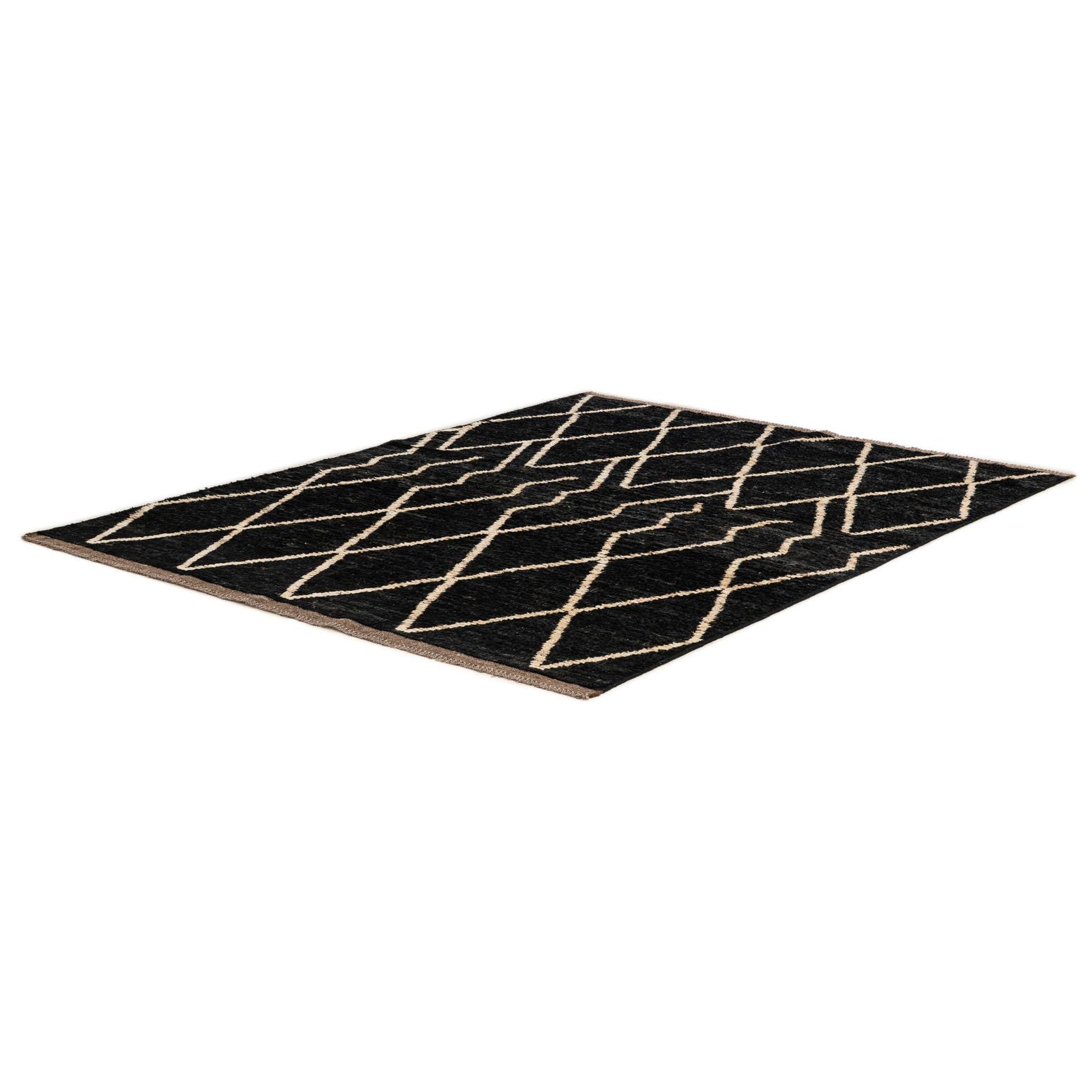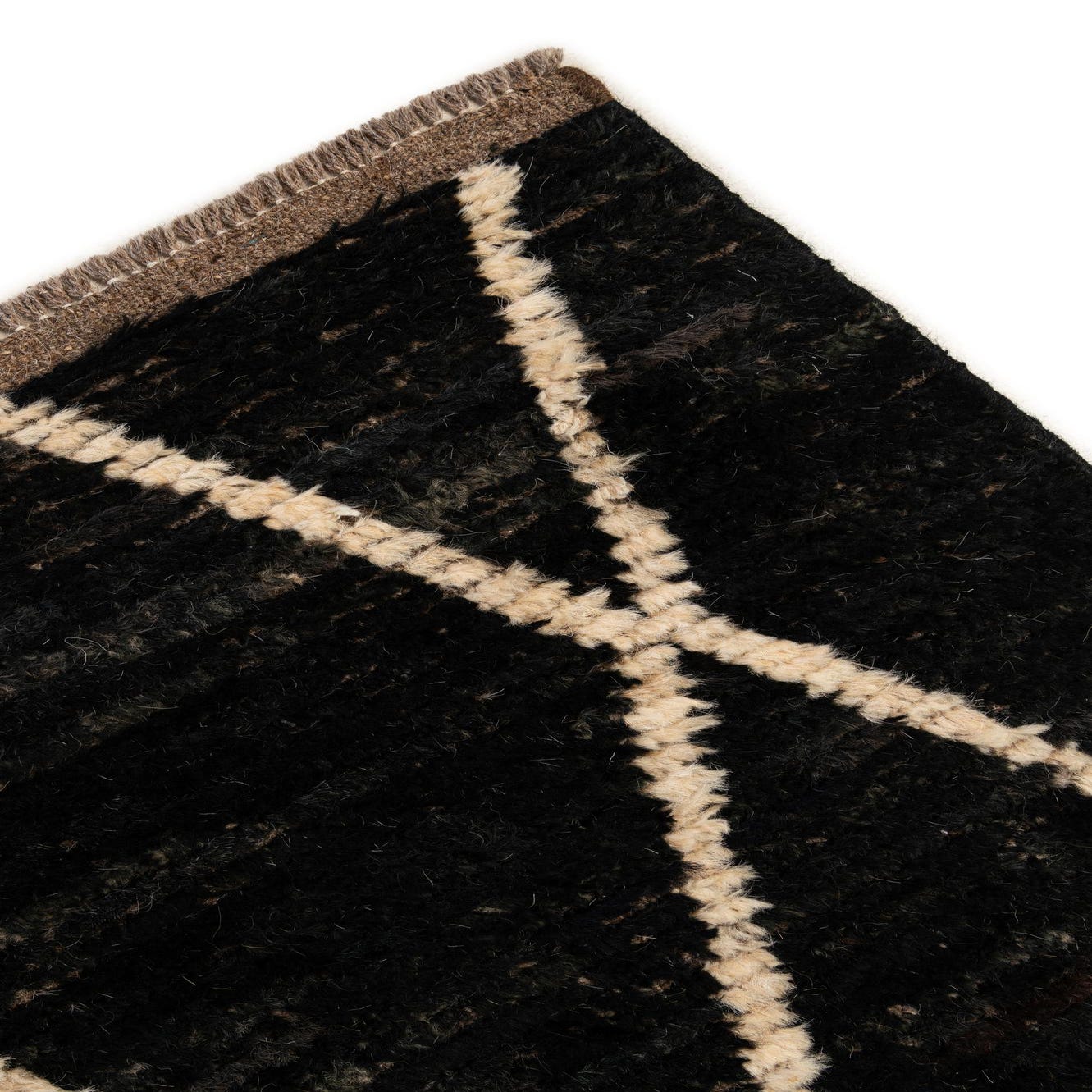 A 5x7 rectangular black wool rug with an off-white tribal diamond pattern, perfect for a modern living room.