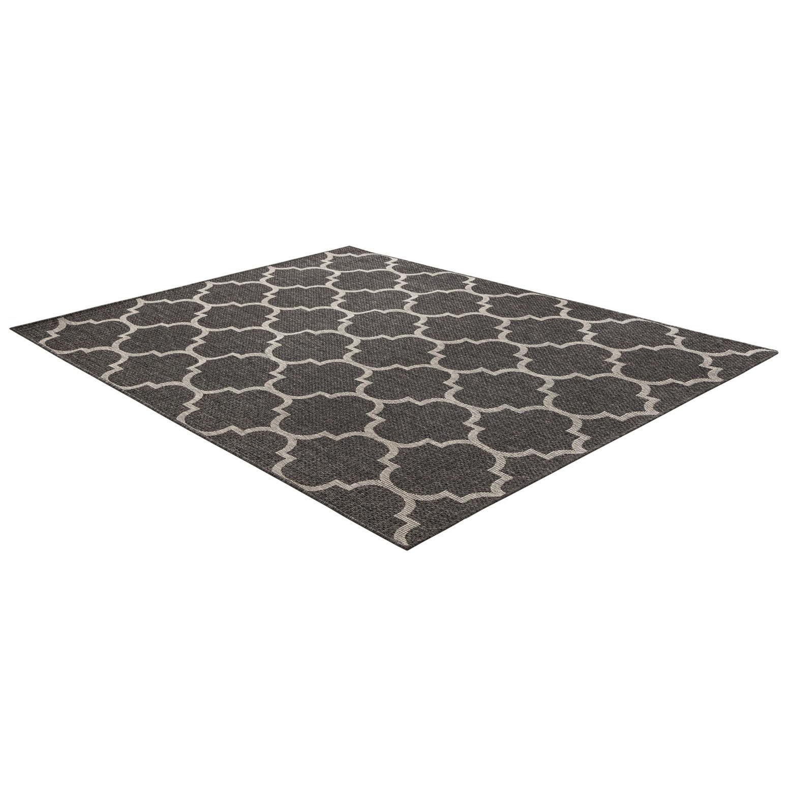 From the Outdoor Lattice collection, this 5x7 area rug features a timeless lattice pattern that brings a touch of elegance to any outdoor space. The contrasting black and beige color palette creates a striking visual against the black background, offering a sophisticated and modern aesthetic. Constructed with machine-woven 100% polypropylene, the rug offers durability and a flatweave construction that contributes to its sleek appearance.