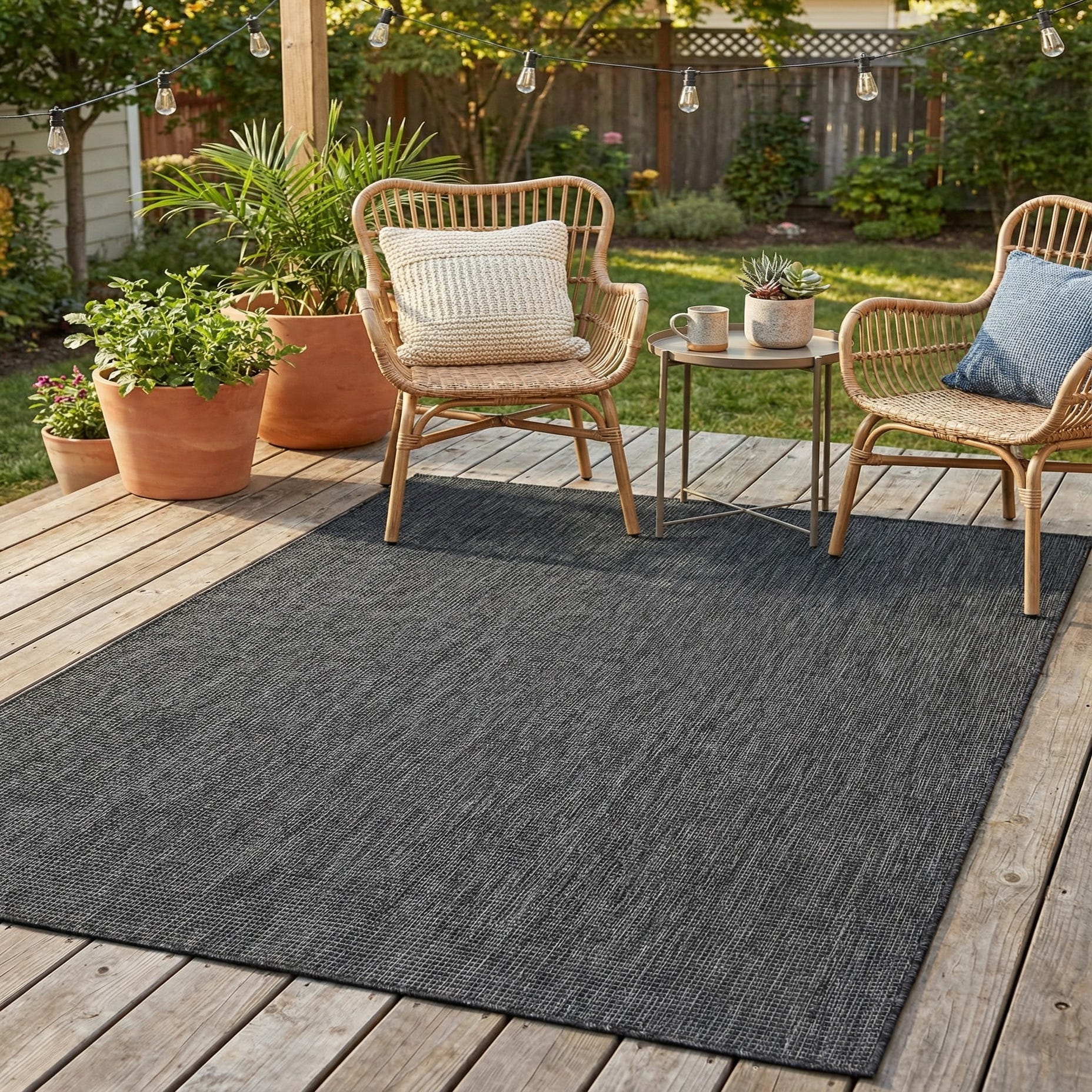 A 5x7 rectangular black flatweave rug with a subtle textured pattern, suitable for indoor or outdoor use.