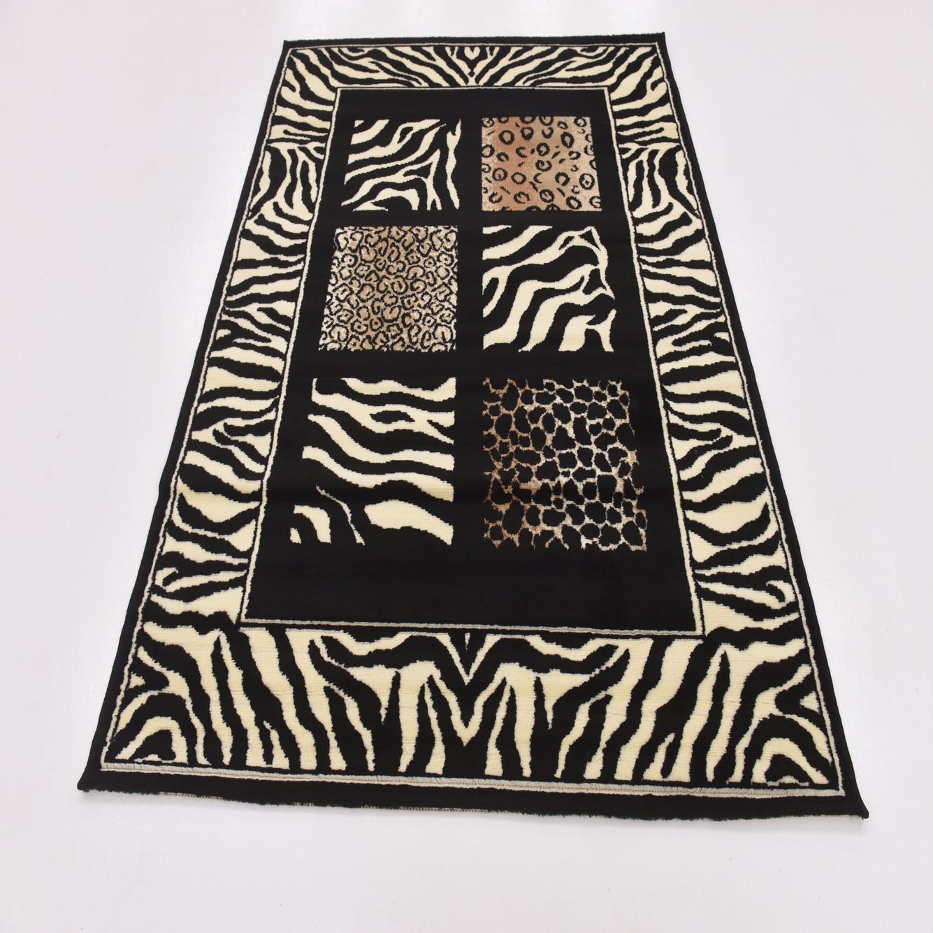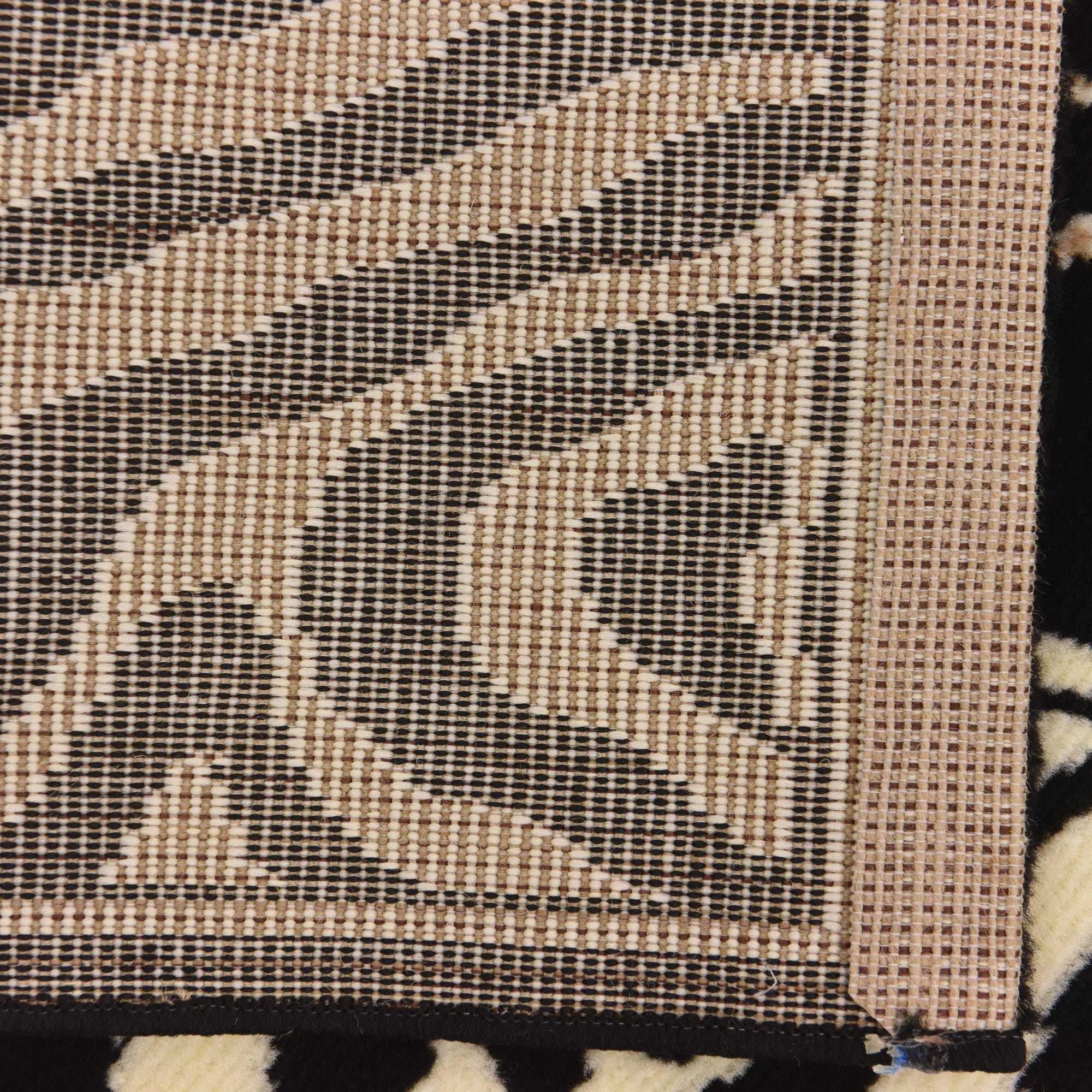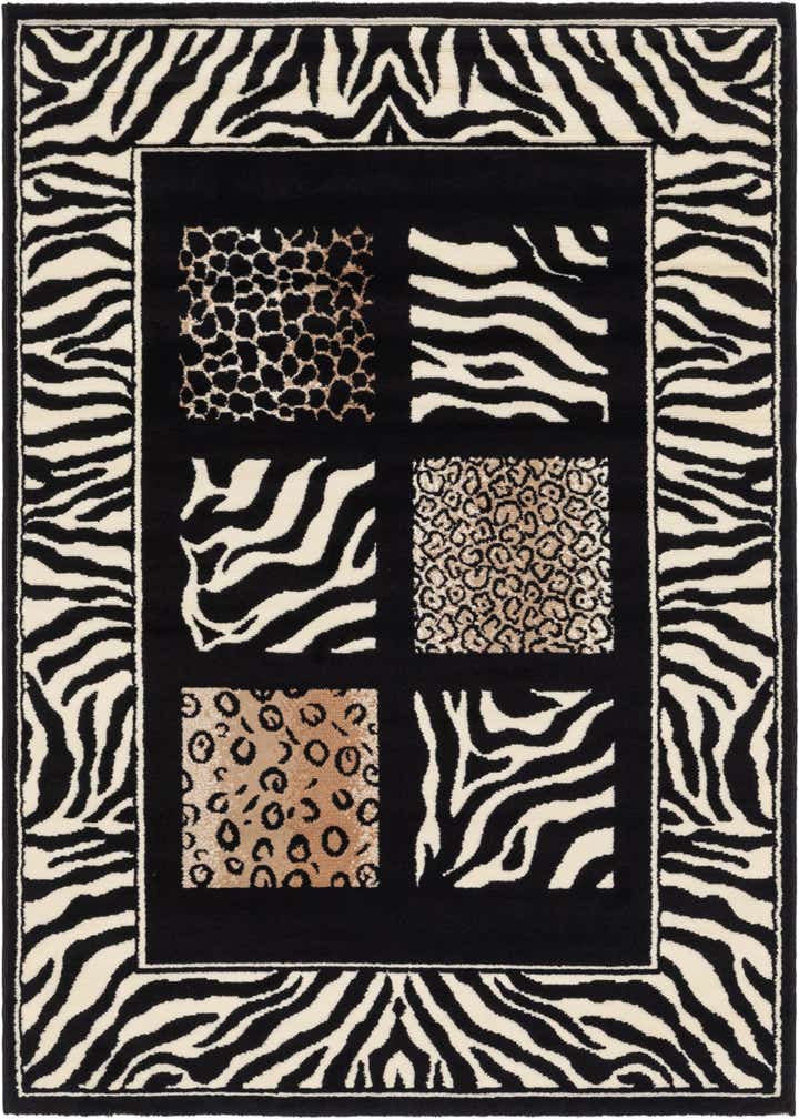 Primary color is Black. Colors in this rug include: Black, Ivory, Light Brown.