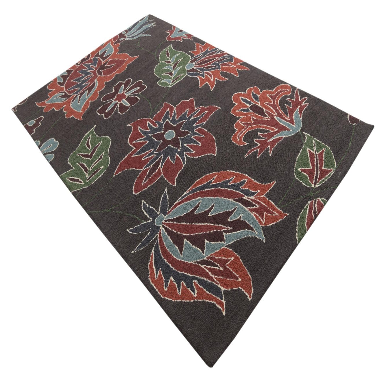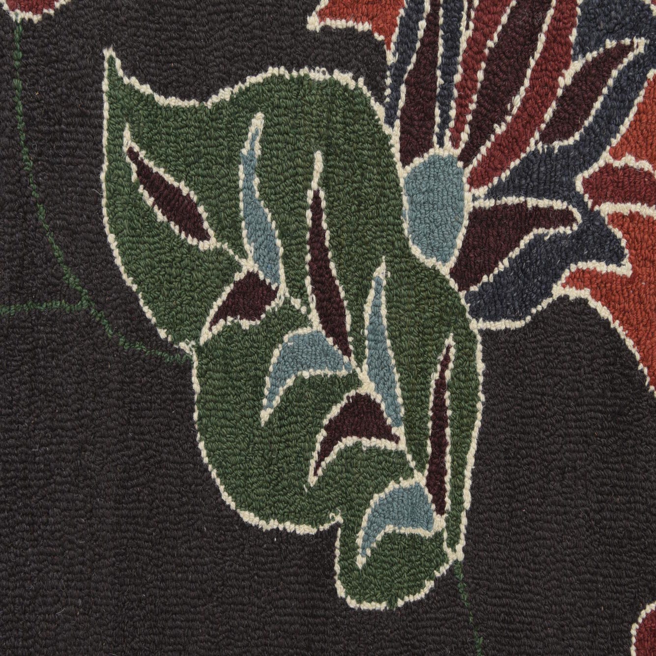 A 5x8 rectangular black wool rug featuring a vibrant floral and botanical pattern in red, teal, and green.