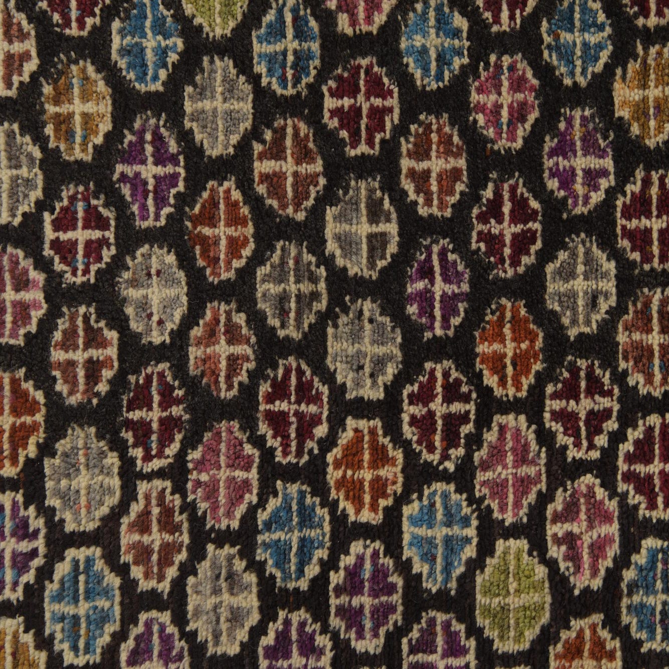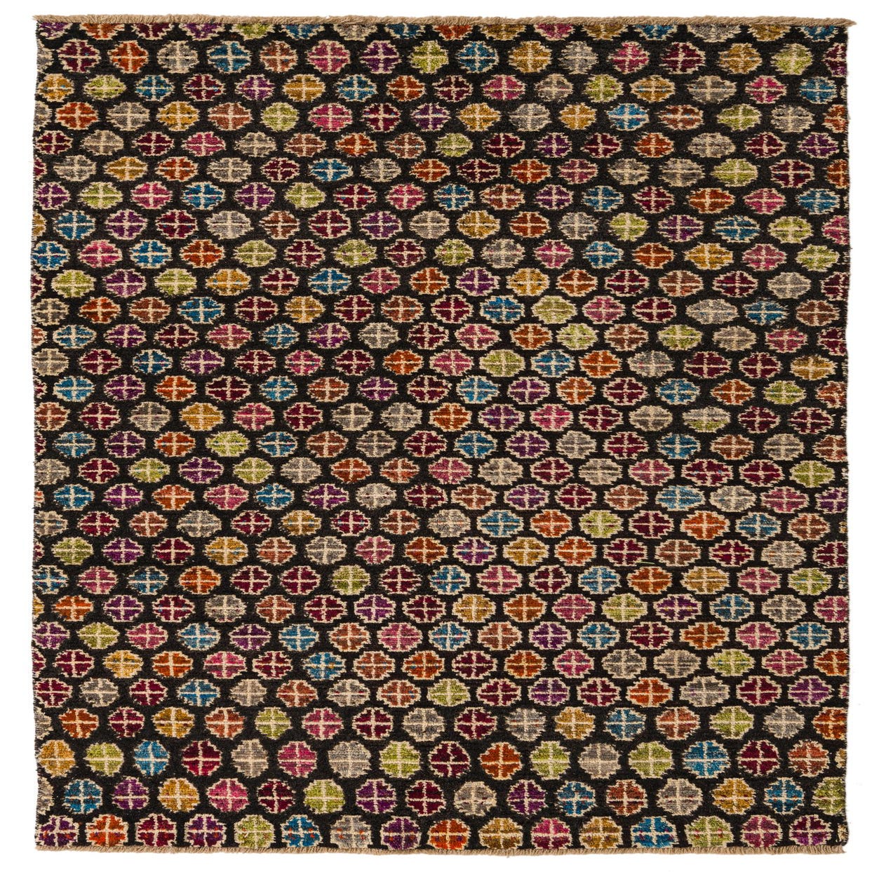 A 5x8 rectangular black wool rug featuring a vibrant, repeating tribal abstract pattern of colorful circular motifs, ideal for a living room.