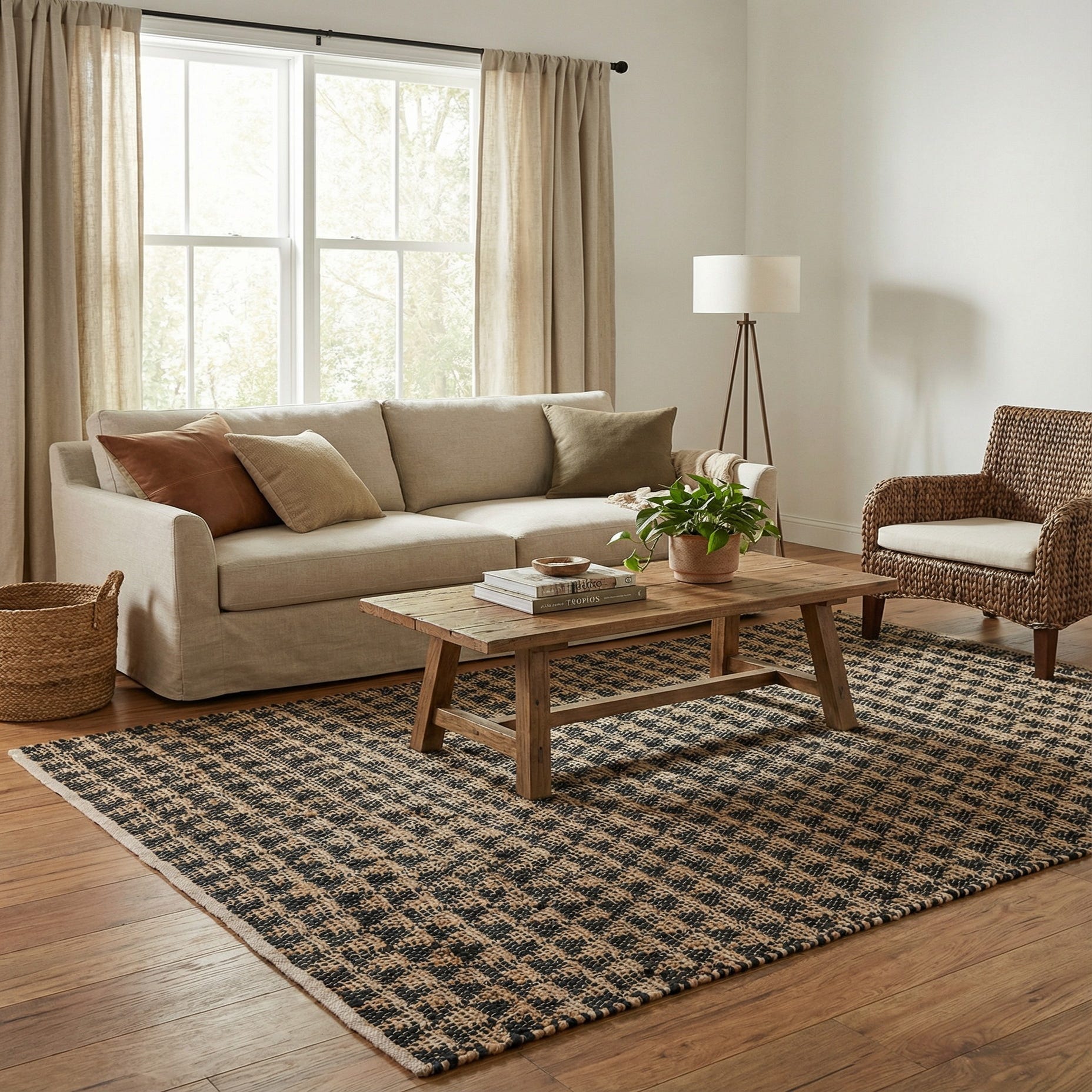 This piece works well in casual to contemporary interiors: place it under a coffee table to anchor a neutral living room, layer it in a bedroom to add visual interest beneath light linens, or use it in an entry or dining area where a graphic, neutral foundation helps tie furniture together. It pairs naturally with warm wood tones, leather seating, rattan accents, and black metal details, making it a good fit for modern farmhouse, Scandinavian, or relaxed boho schemes.
