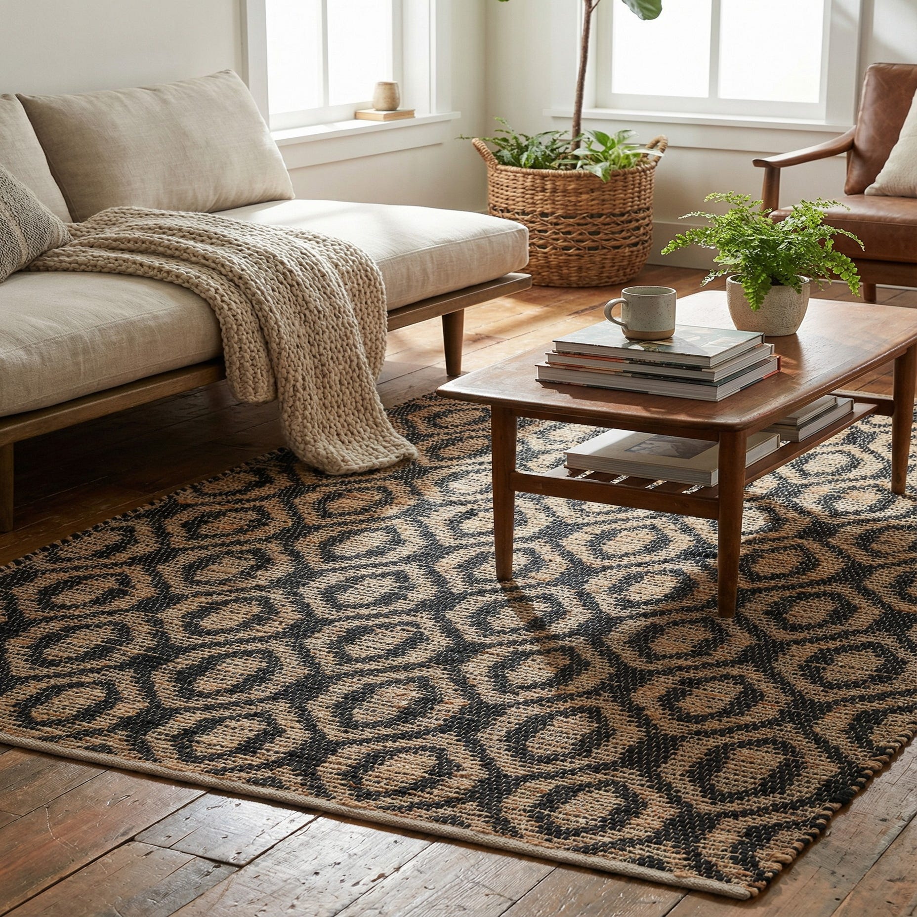Hand-woven of 60% cotton and 40% jute, this flatweave rug pairs a deep black background with natural-toned geometric medallions arranged in a repeating lattice. The pattern is a series of rounded octagon and diamond shapes that create a steady, rhythmic motif across the surface. The jute brings a tactile, slightly slubbed grain while the cotton threads soften the hand, producing a low-profile, textured surface that feels grounded underfoot without added pile.