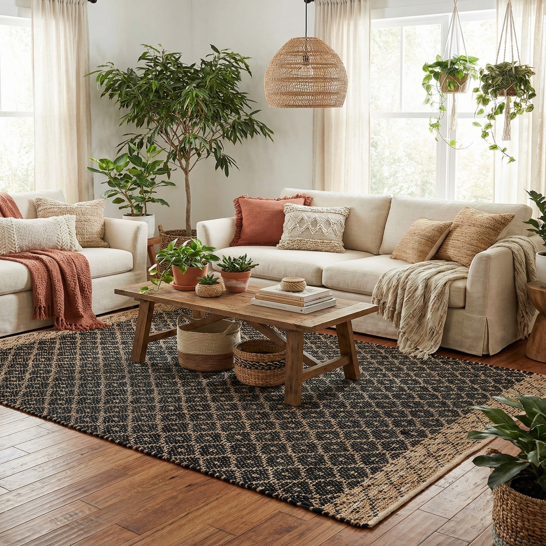 A 5x8 rectangular Chindi Trellis rug featuring a black and natural jute diamond pattern with light tan borders, suitable for various indoor rooms.