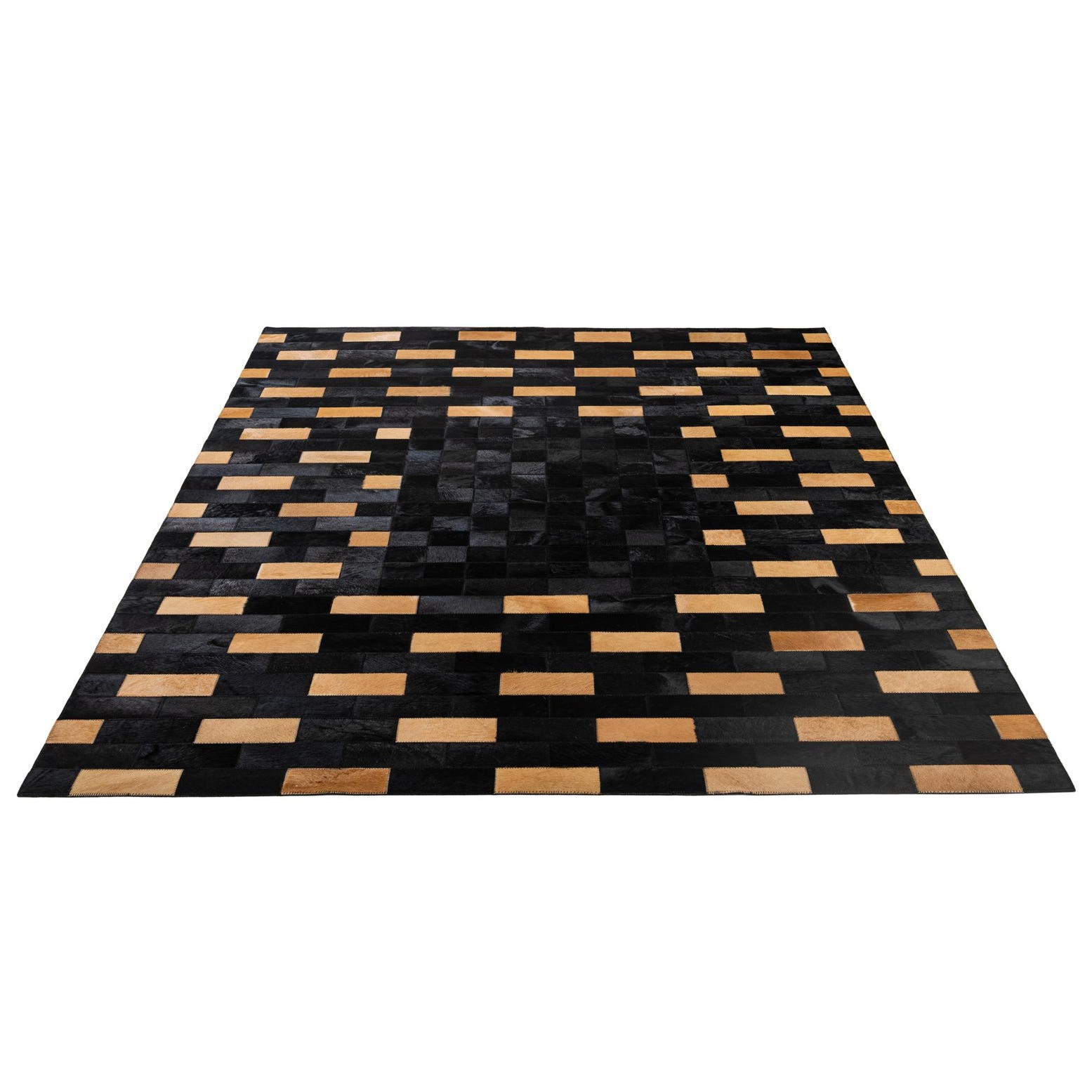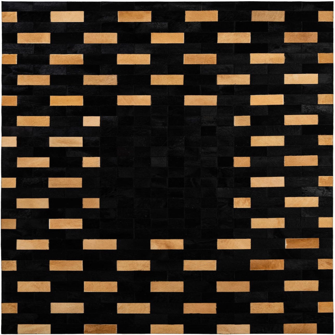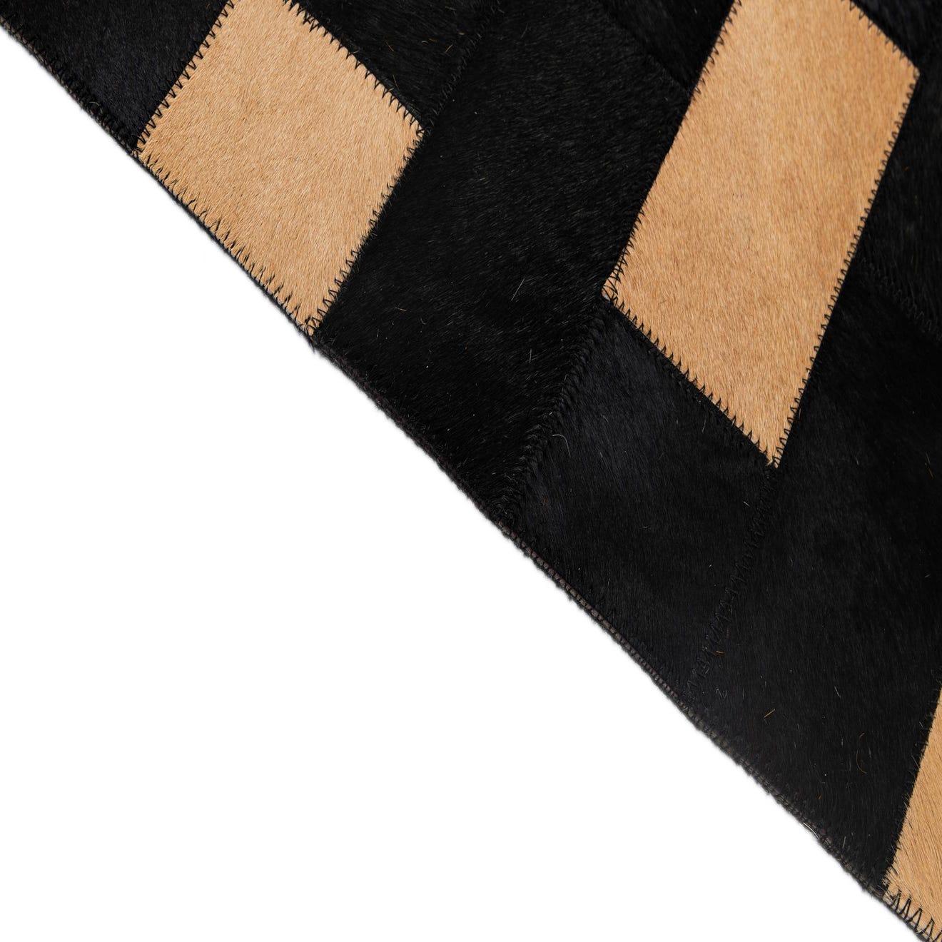 A 5x8 rectangular Cowhide Patchwork rug featuring a modern stripe pattern with black and light brown rectangles.