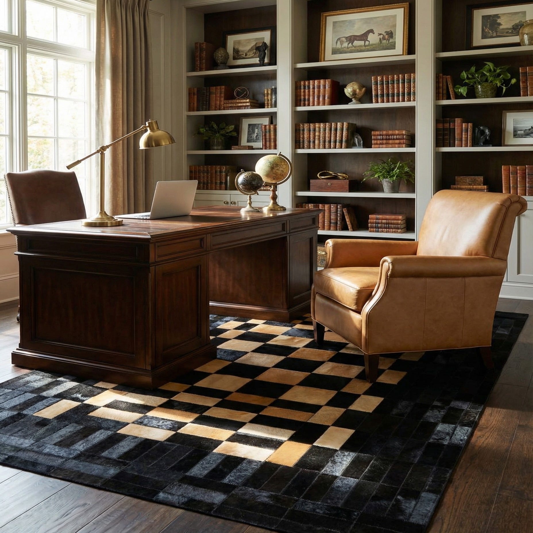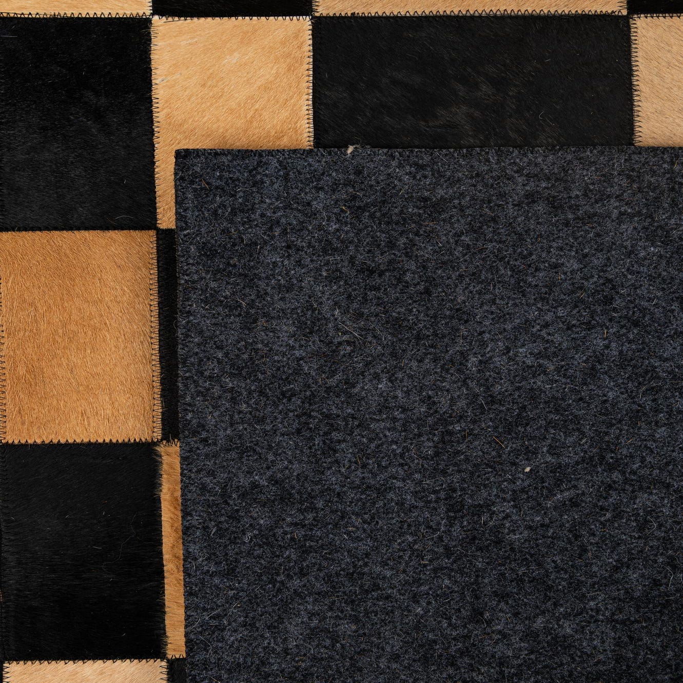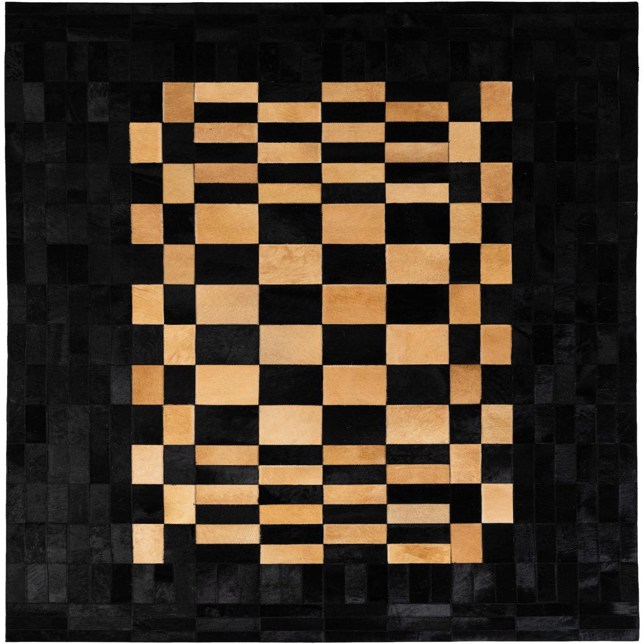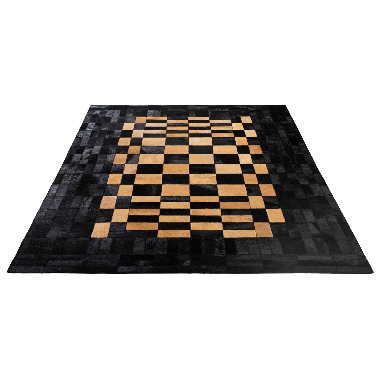 A 5x8 rectangular black and natural cowhide rug with a modern patchwork checkerboard pattern, suitable for a living room.