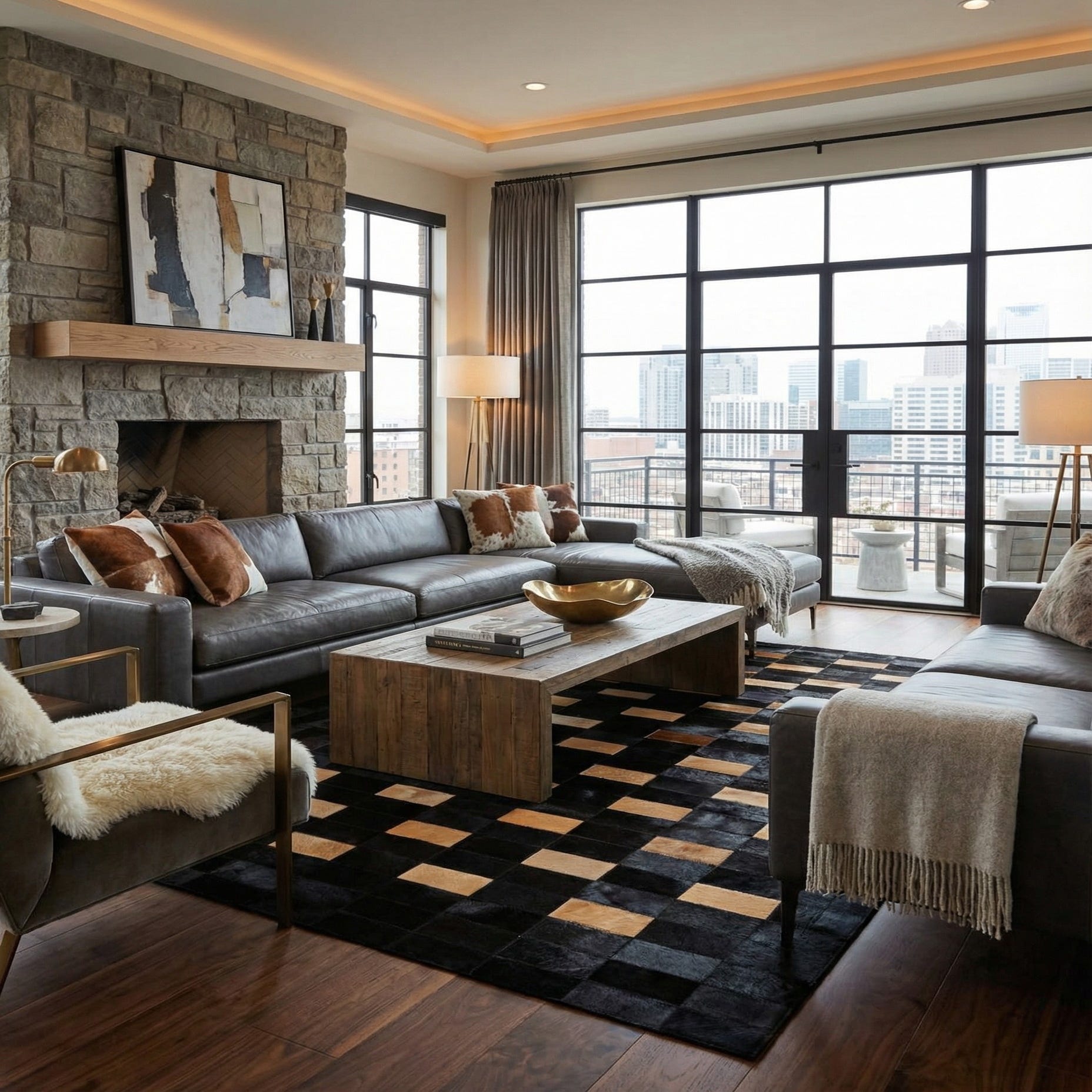 A 5x8 rectangular black cowhide rug with a modern patchwork pattern of alternating black and tan rectangular patches.
