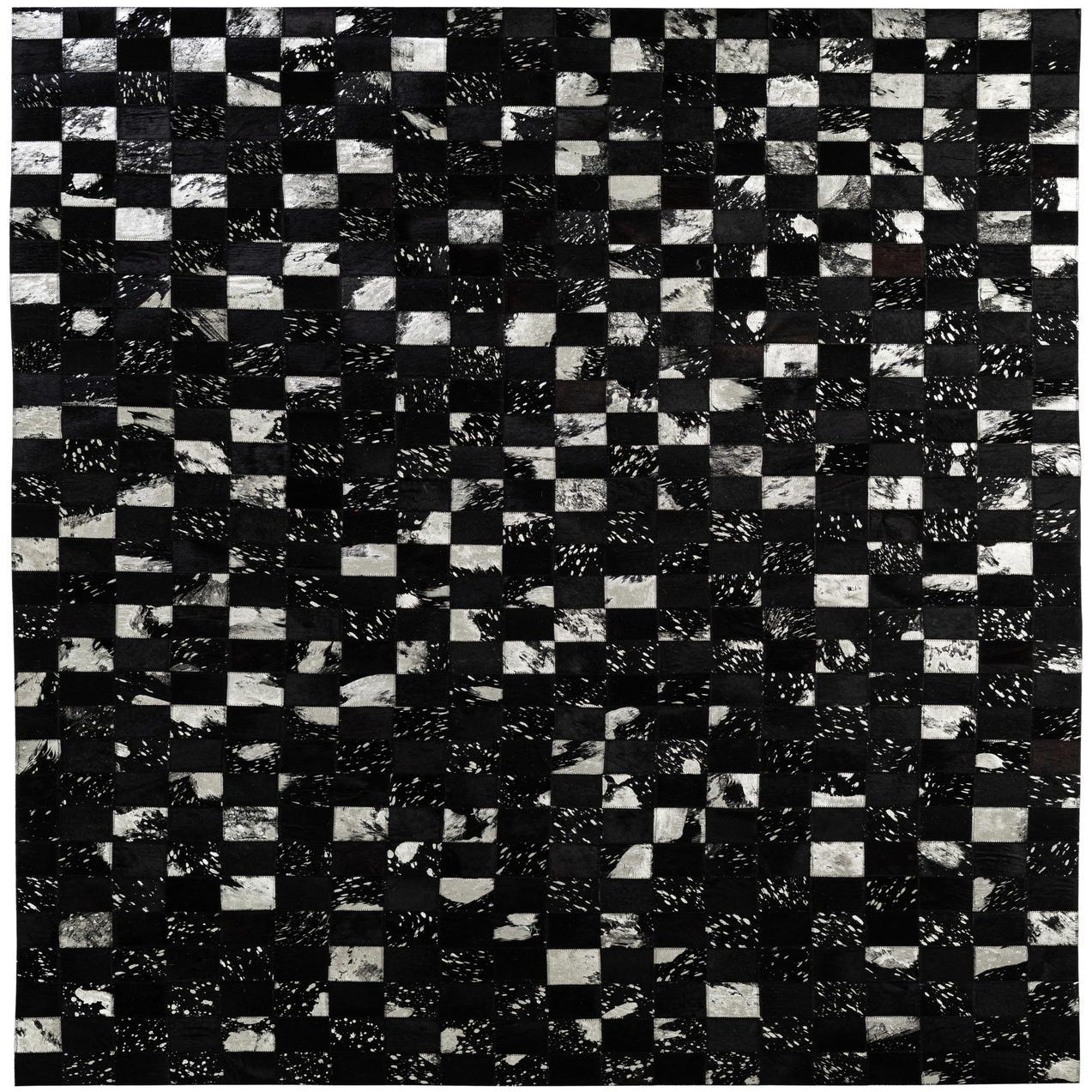 A 5x8 rectangular Cowhide - Patchwork rug featuring a modern checkerboard pattern in black and white tones.