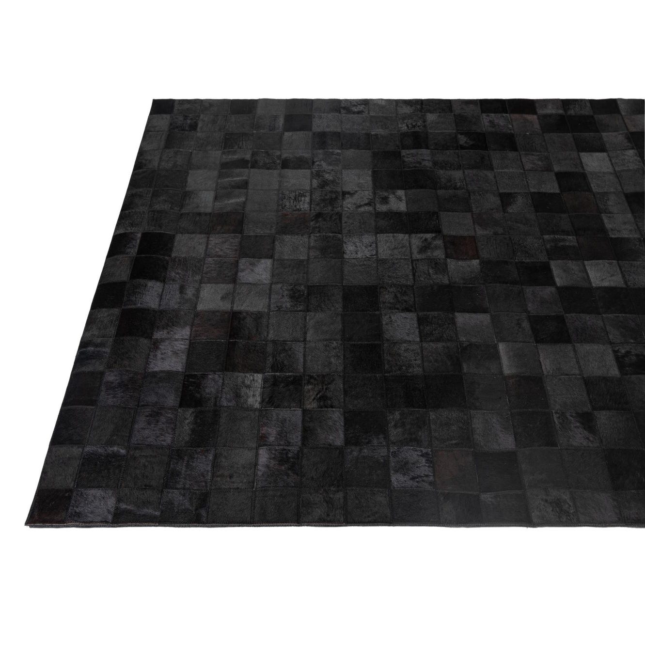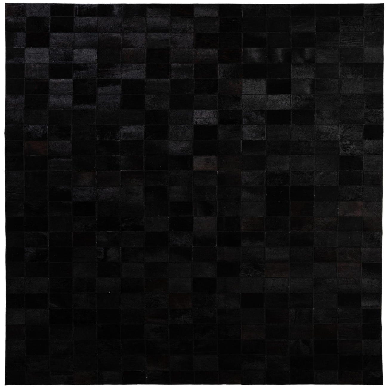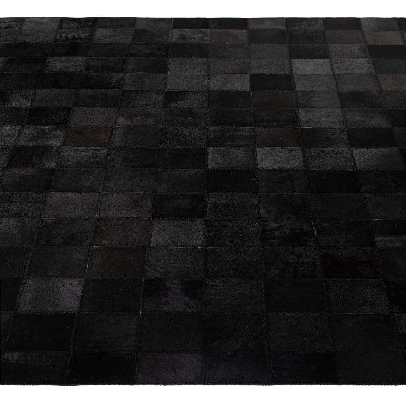 A hand made cowhide and leather patchwork rug laid out in a tight grid of small squares, each panel stitched together to form a seamless field of black. The surface is hair-on-hide with a low, tactile nap that offers a subtle sheen as the light catches different panels, creating depth with tonal variations of black and charcoal. The pattern is geometric and restrained, leaning contemporary while the natural texture of the hides adds organic warmth.