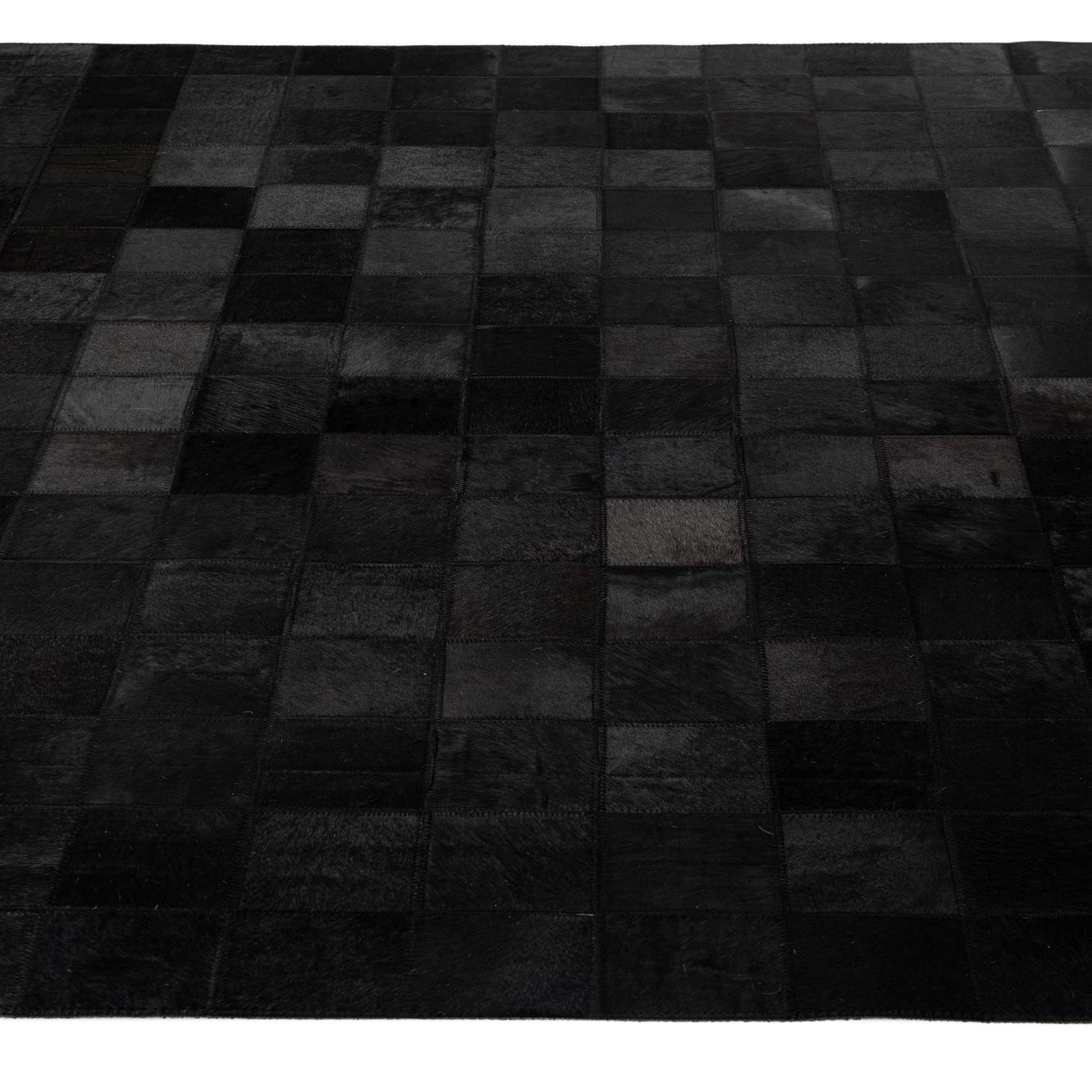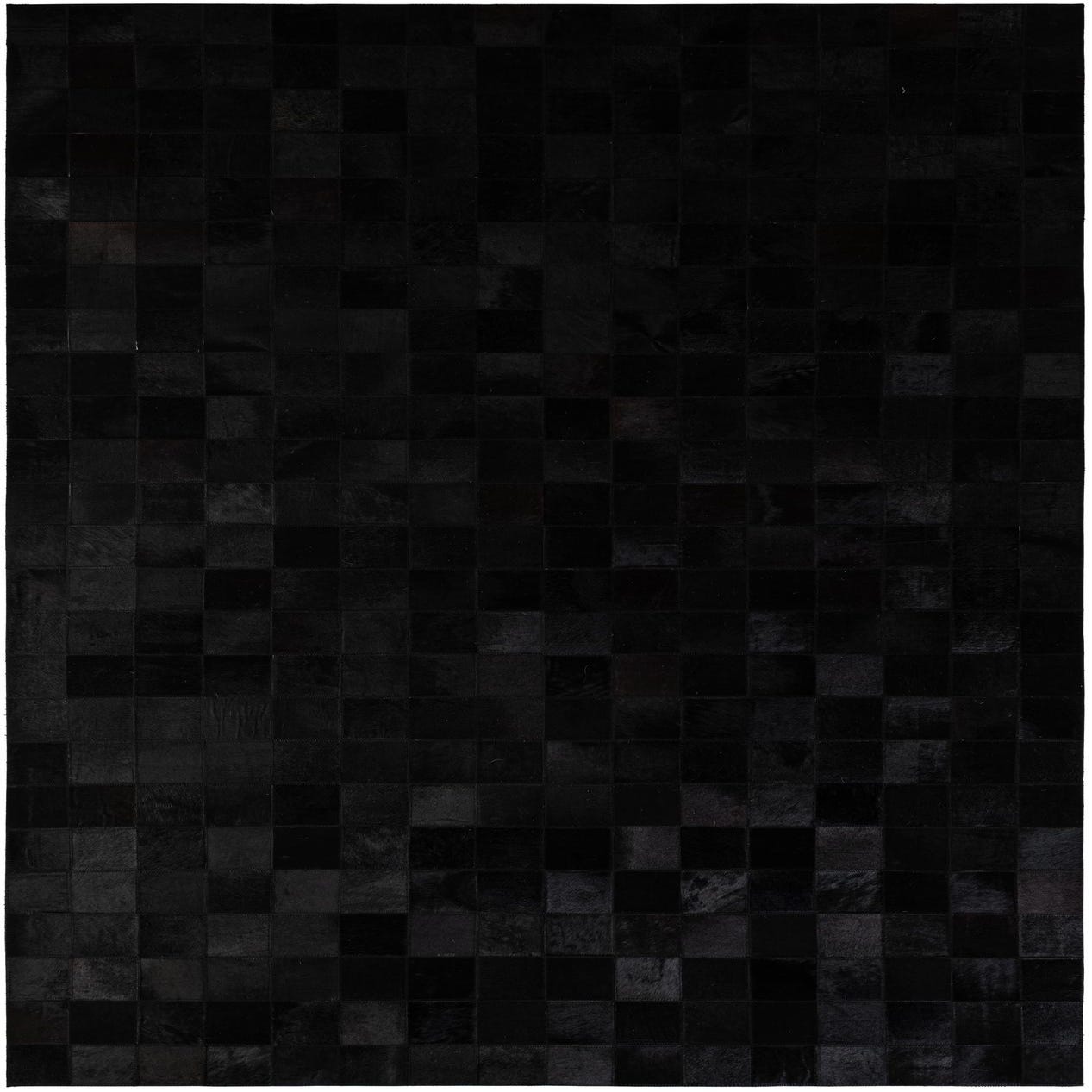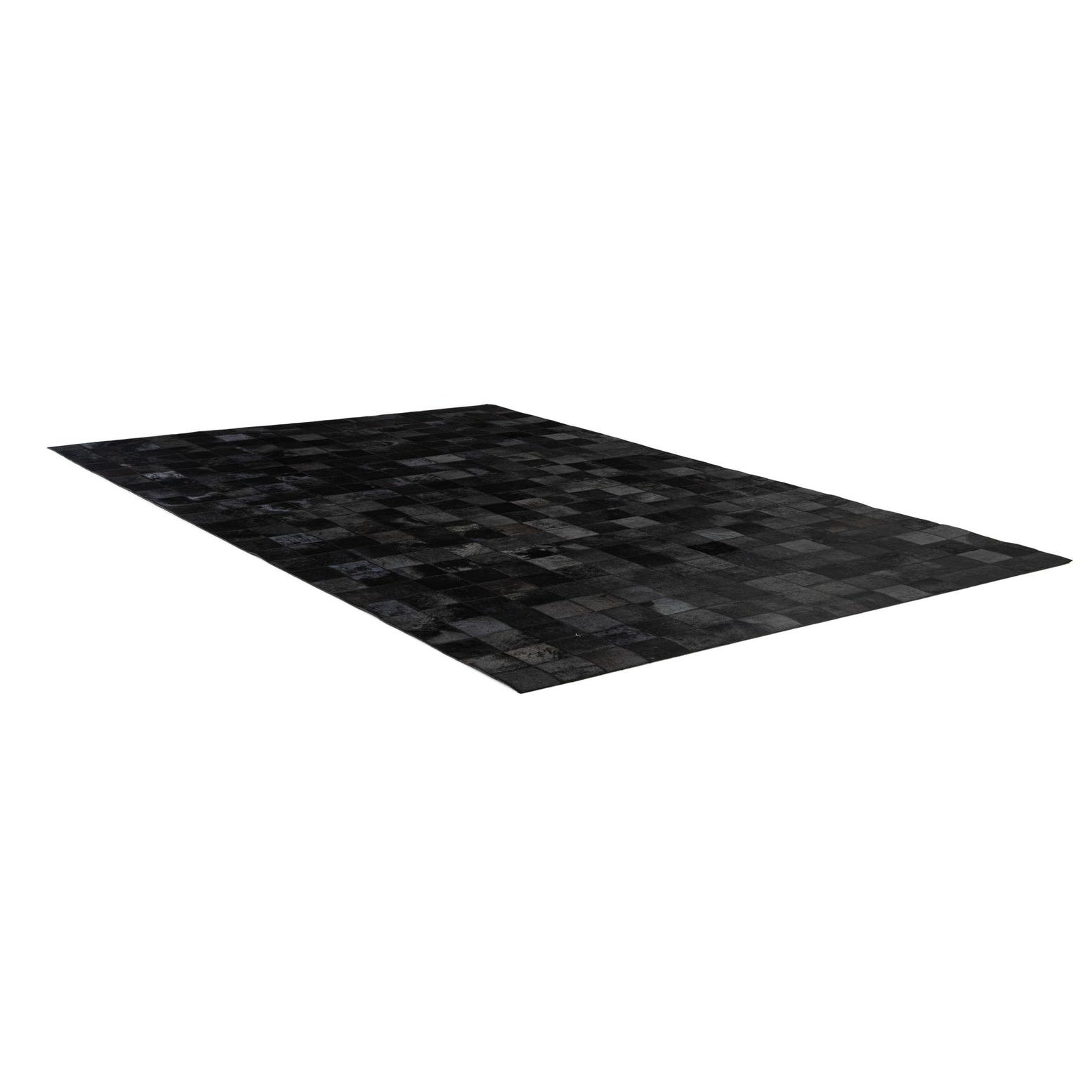 A 5x8 rectangular Cowhide - Patchwork rug by Rugs.com. The modern black rug features a grid of varying black cowhide squares, creating subtle texture and depth.